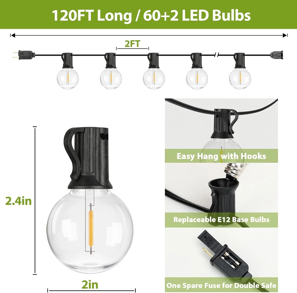 Store New Arrivals Add to Favorite View Feedback Contact 120FT Outdoor String Lights, Waterproof outside Patio String Lights with 62 Shatterproof Dimmable G40 LED Globe Bulbs, Connectable Hanging Lights for Porch Backyard Garden House Party Wedding Bistro Description Item model number AC Light Source Type LED Style 120FT Number of Items 1 Power Source Corded Electric Number of Light Sources 60 Material Type Plastic Theme Christmas Style Number AC Bulb Shape Size G40 Occasion Type Christmas Additional Features Waterproof, Dimmable, Shatterproof Package Dimensions 10.87 x 8.54 x 7.13 inches; 3.64 Pounds Indoor/Outdoor Usage Outdoor Control Method Touch Light Color warm glow Occasion Christmas Special Feature Waterproof, Dimmable, Shatterproof Color Temperature 2700 Kelvin Color Warm White Wattage 1 watts Indoor Outdoor Usage Outdoor Voltage 120 Volts (AC) Included Components '120ft String cables with 60 Sockets', '62 x Plastic Shatterproof G40 Edison LED bulb', '1 x User Manual' Style Name 120FT Size 120FT 【Waterproof and Shatterproof】 Made with durable materials, this string lights for outside has excellent rain, snow, wind, and high-temperature resistance. Additionally, using plastic bulbs instead of glass ensures they are not easily broken, making them a safer choice for your family. Enjoy year-round outdoor use without worrying about accidental drops or damage 【Dimmable Outdoor String Lights】 With dimming capabilities and compatible with most dimmers on the market(dimmer not included), the outdoor patio lights allows you to easily adjust the brightness to create the perfect ambiance. Whether you prefer soft, romantic lighting or vibrant party illumination, this backyard string lights can meet all your lighting needs 【Up to 12 Sets Connectable】 Designed to connect end-to-end, you can easily extend the length of your LED outdoor string lights by connecting multiple sets together (up to1440 feet). Perfect for decorating any small to large space or wrapping around trees and structures 【Energy-Efficient LED Patio String Lights】The outdoor waterproof string lights comes with 60 clear plastic bulbs and 2 spare bulbs. Each bulb consumes only 1 watt of power, providing bright lighting while saving up to 98% on electricity compared to traditional incandescent bulbs. Meanwhile they stay cool during operation for added safety and reliability 【Indoor and Outdoor Ambient Lights】 The 120ft string lights emits warm white light, creating a cozy and inviting atmosphere for any occasion. Perfect for decorating indoor, outdoor, dorm, bar, camping, cafe, balcony, pergola, gazebos, canopy, home, village, apartment, holiday, wedding, birthday, Christmas, party, and more Product Description End-to-End Connectors The end-to-end connectors simplify the setup process. You can easily link up to 12 strands together, covering larger areas without the need for multiple power sources. Ready-to-Hang Design The G40 string lights come equipped with convenient hanging hooks on each bulb, allowing you to effortlessly drape and arrange them in any setting. Heavy-Duty Durability Crafted to withstand the elements, the robust electrical wiring of these lights ensures reliability in any weather. Rain, snow, or sunshine – our G40 string lights maintain their brilliance, creating a captivating atmosphere for your outdoor events throughout the year. Energy-Efficient, Cool to Touch, and Shatterproof Our outdoor string lights boast a total length of 120 feet, featuring 60 lamp sockets and arriving with 62 bulbs (including 2 spares). Crafted from high-quality plastic with LED filaments, these bulbs not only prioritize energy efficiency but also elevate safety during use. Operating at a consistently cool temperature eliminates the risk of overheating, and their durability surpasses that of traditional glass bulbs, minimizing the chances of breakage. Two Fuses for Double Safe One sapre fuse is included in the plug for your convenience. In case the string lights are not operational, kindly inspect the fuse for any signs of burnout. If necessary, replace the fuse to ensure the proper functionality of the string lights. 1 Waterproof 2 Dimmable 3 End-to-end Connectable 4 120FT + 60 Sockets 5 Shatterproof ABOUT US We offer the best prices around on high quality products. Our E-store includes media such as books, movies, music and games while offering electronics, toys, sporting apparel, clothing, tools, general home, garden items and more. SHIPPING We are always working hard to ensure your package arrives as soon as possible. Please understand that some factors like weather, high postal traffic, and the performance of shipping companies are outside of our control. We offer free shipping to the lower 48 states and ship within 2 business days of payment, usually sooner. We do not accept P.O. Boxes. Please provide a physical address. For shipping outside of the continental USA, we only use eBay's Global Shipping Program.The item is shipped to KY and then sent to the rest of the world. International customers are responsible for all duties and taxes. Continue to check out in order to calculate costs for shipping the item to your country. Messages regarding eBay's Global Shipping Program MUST be directed at eBay EXCLUSIVELY. RETURNS We offer a 30-Day Return Policy on items which you are not completely satisfied with. You have the option for a full-refund or an exchange of the item. No returns are available on items shipped outside of the USA. PAYMENT We accept PayPal. CONTACT US This page content is yet to come Please ad us to your favorite seller and visit again later Thank You CUSTOMER SATISFACTION We try our very best to make sure every customer is completely satisfied. If there's a problem, message us! We're happy to help. WE ACCEPT Copyright © 2021 AutoDS. | All Rights Reserved