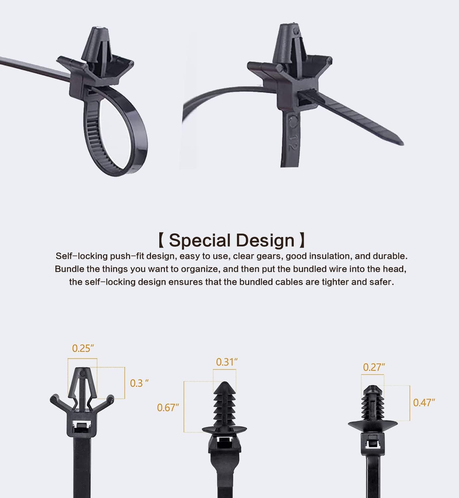 【Package Included】The package contains 120 pieces of nylon cable ties, there are 4 types of plugs, 30 pieces of each plug. 【Durable Material】Our wire harness wiring clip sorting set is made of flame-resistant nylon plastic, which is safe, environmentally friendly, anti-aging, and not easy to break. 【Special Design】Self-locking push-fit design, easy to use, clear gears, good insulation, and durable. 【Easy to Use】Bundle the things you want to organize, and then put the bundled wire into the head, the self-locking design ensures that the bundled cables are tighter and safer. 【Wide Applications】These allow to secure to designated anchor points and hold wires or other components securely in the space for replacing old/damaged push-fit cable ties while working on engines and electrical systems. Also widely used in home, construction industry, electronics industry, automotive, cable and wire assembly, packaging and transportation, outdoor activities. Universal Push Mount Cable Zip Tie