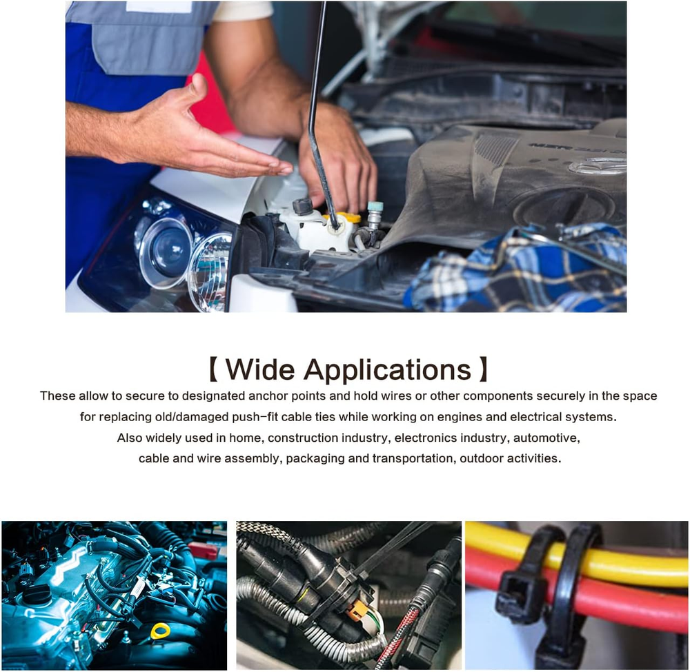 Menu Other Items Feedbacks About Us Contact Us Add To Favorites 120 Packs Car Mount Wire Tie, Nylon Push Mount Cable Zip Tie Strap Self-Locking Tie,Fastener Cable Clips for Sorting Out Cable and Wire Clearly, Household Construction Electronic Auto Industry 【Package Included】The package contains 120 pieces of nylon cable ties, there are 4 types of plugs, 30 pieces of each plug. 【Durable Material】Our wire harness wiring clip sorting set is made of flame-resistant nylon plastic, which is safe, environmentally friendly, anti-aging, and not easy to break. 【Special Design】Self-locking push-fit design, easy to use, clear gears, good insulation, and durable. 【Easy to Use】Bundle the things you want to organize, and then put the bundled wire into the head, the self-locking design ensures that the bundled cables are tighter and safer. 【Wide Applications】These allow to secure to designated anchor points and hold wires or other components securely in the space for replacing old/damaged push-fit cable ties while working on engines and electrical systems. Also widely used in home, construction industry, electronics industry, automotive, cable and wire assembly, packaging and transportation, outdoor activities. Universal Push Mount Cable Zip Tie Item Specification Item model number 120ZD Style Zip Color Black Material Nylon, Plastic Manufacturer Part Number 120ZD Item Weight 6.4 ounces Item Length 1E+1 Centimeters Exterior Brushed Model 120ZD Number of Pieces 120 Dimensions Shipping Returns Additional Info Product Dimensions: 7.01 inches x 9.33 inches x 1.97 inches. Weight: 6.4 oz Fast shipping is very important for us. Our standard shipping service is FREE. Your order will be shipped within 1-3 business days upon full payment received. Most items are delivered within 3-5 business days, however, please allow 3-10 business days. We are shipping only to USA. We only ship to the confirmed Paypal address. We reserve the right to cancel any order for any reason at any time. We are not responsible for undeliverable addresses. We offer a 30 day return policy from checkout winning date. Your satisfaction is guaranteed! If for any reason you are unhappy with your item, just return it within 30 days for a full refund, minus shipping cost. Please contact us prior to initiating a return so that we can issue you a refund authorization. Items defective upon receipt must be packaged in their retail packaging as if new and returned with a detailed description of the problem. Return shipping fees are not refundable. We reserve the right to decline any returns if the above guidelines are not followed. All of our items, unless otherwise stated, will only run on 120 volts. Please check to make sure your country complies with these specifications. If you have a problem or question regarding your transaction please contact us before leaving any type of feedback. We will work with you to resolve any problem you may have.