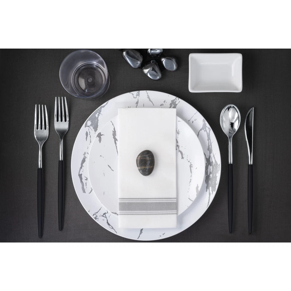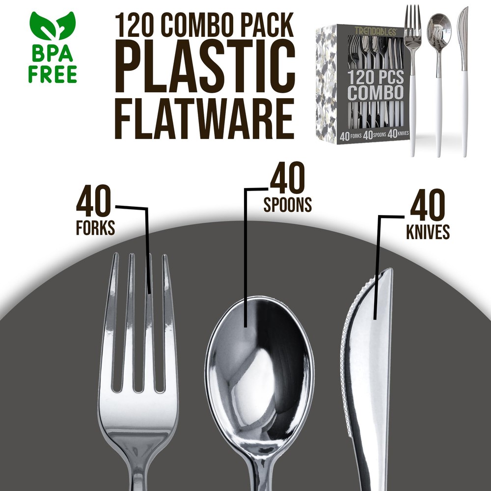 INCLUDES: White Silver Silverware Cutlery Set Each Box of heavy duty plastic silverware Contains 40 heavy duty Plastic Forks and Knives And 40 Soup Spoons Disposable Plastic Silverware Forks Sturdy And Unique Plastic Forks Pair With Our Matching Plastic Spoons And Knives For The Complete utensils set PERFECT FOR ANY OCCASION: Introducing Our Designer Sleek, Modern, And Stylish Disposable Cutlery gold flatware - This Trendy Cutlery Is Perfect For weddings , Receptions , Formal Dinners , Banquets , Parties Picnics, Catering Supplies , Halloween , Christmas Etc PREMIUM QUALITY: These disposable silverware heavy duty tableware utensils not only look stunning but are very sturdy. We Are Proud To Say That Our durable fancy plastic silverware set Is Made with Bpa Free Plastic That Is Recyclable Too! It Is The Perfect Holiday and Thanksgiving cutlery - upscale disposable dinnerware COLLECTION: Impress your guest this holiday season with magnificent high quality disposable forks spoons and knives set disposable dinnerware set Each design is uniquely vibrant and can find a place at any trendy event - plastic silverware sets for parties or wedding disposable dinnerware FINE DINNING MADE EASY: Need to spruce up a party but don't want to use your real dishes ? quality Disposable plastic Cutlery is definitely the way to go. There is always a new look or design to change things up from last party and our disposable utensils heavy duty gold spoons silverware and gold forks silverware gold knife set are just the thing you need to make partying and clean up a breeze