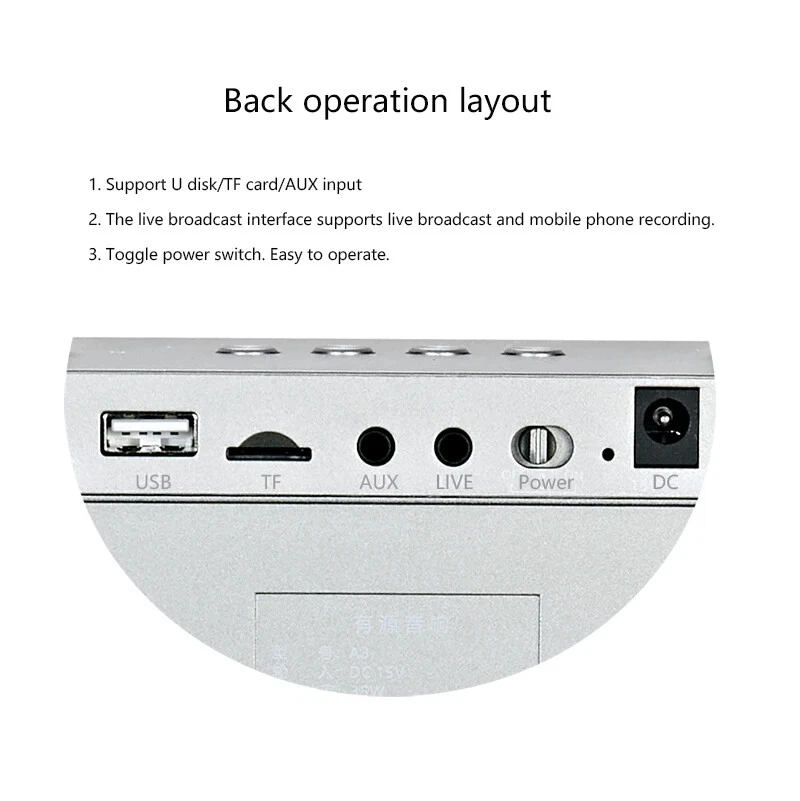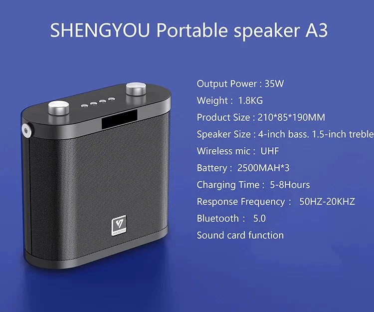 Product Description Specification item value Power Source Battery Support Apt-x NO Support APP NO Battery Yes Wi-Fi Music NONE Number of Loudspeaker Enclosure 1 Audio Crossover Full-Range Woofer Size/Full-Range Size 3" Set Type Player Sets Feature None Material Plastic Waterproof NO Communication AUX, usb, Audio Line PMPO 100W Support Memory Card Yes Speaker Type PORTABLE Output Power 35W Cabinet Material Plastic Frequency Range 20Hz-20KHz Display Screen Yes Intelligent Personal Assistant None Voice Control NO Built-in Microphone NO Tweeter Size 1.5" Private Mold Yes Model Number A3 Type Active Use HOME THEATRE, Portable Audio Player, Mobile Phone, Karaoke Player, COMPUTER, Stage, Outdoor, Party Channels 3 (2.1) Special Feature Wireless, PORTABLE, Mini Place of Origin Shenzhen,Guangdong, China LED Lighting single color Type Home HiFi Speaker Microphone UHF wireless microphone Application Karaoke Teaching Sales Promotion Public address Battery 2500mAh * 3 Lithium battery Material ABS Working temperature -10℃~45℃ Warranty 1 Year Charging time 4-5 Hours Weight 1.8kg Interface LIVE,Monitor