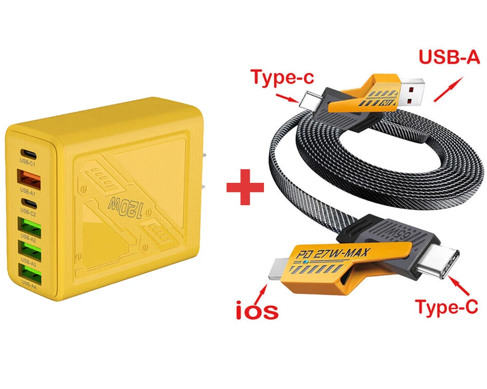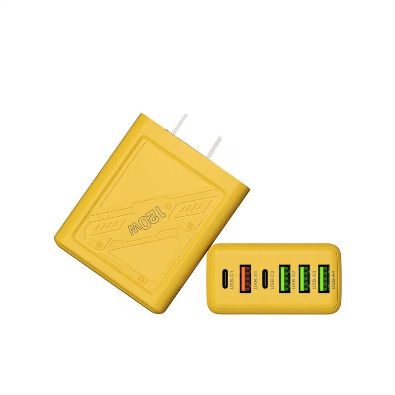 Description: 1. Fully charged, safe to use, with overcharge, overcurrent and overheating protection. 2. Flame retardant material, providing excellent service for you and your devices. 3. Safety: This USB charger adopts shell design, which is not easy to be damaged. 4. Convenient for travel: With global voltage compatibility, compact and portable design, you can charge anywhere. Specifications: Type: Charger Power: 120W Color: Yellow Charger plug: US plug, Warning: This product has 6 plugs with a total power of 120W. When multiple plugs are charged at the same time, the charging speed will be the same as that of a normal charger. If you encounter any problems during purchase or use, please feel free to contact us.
