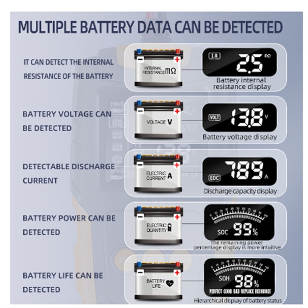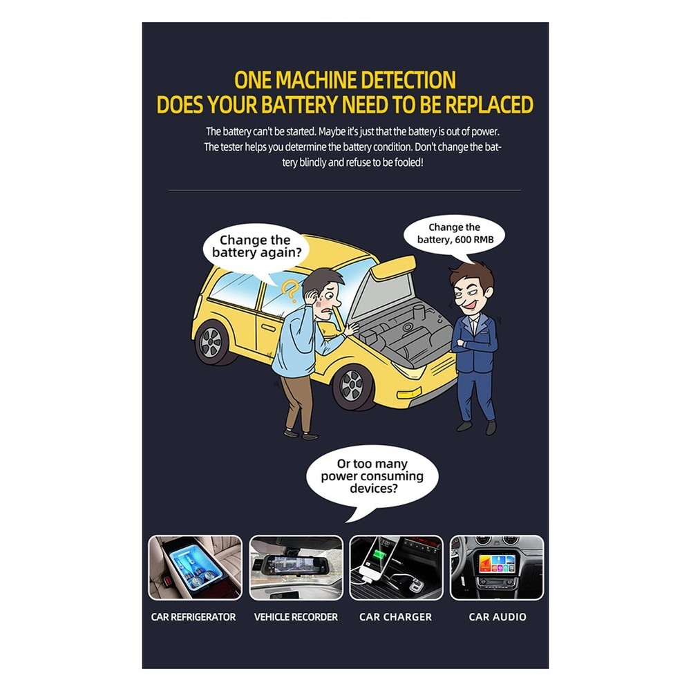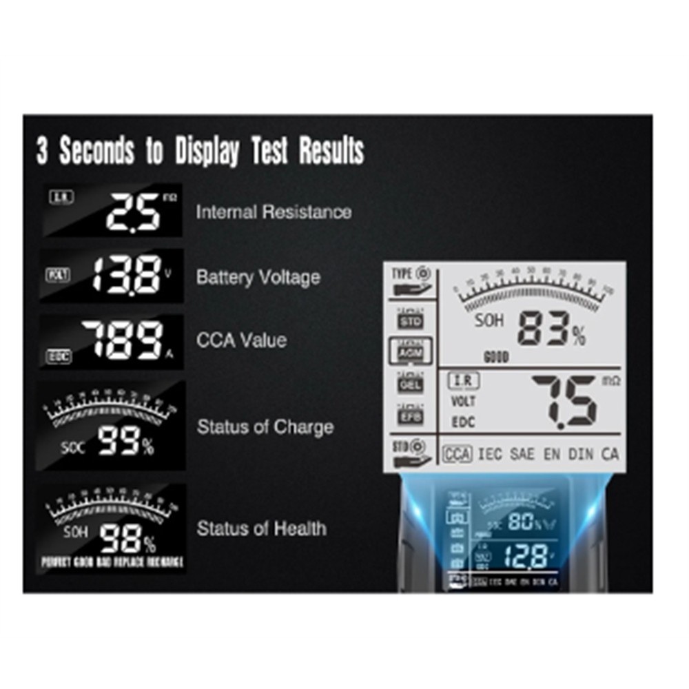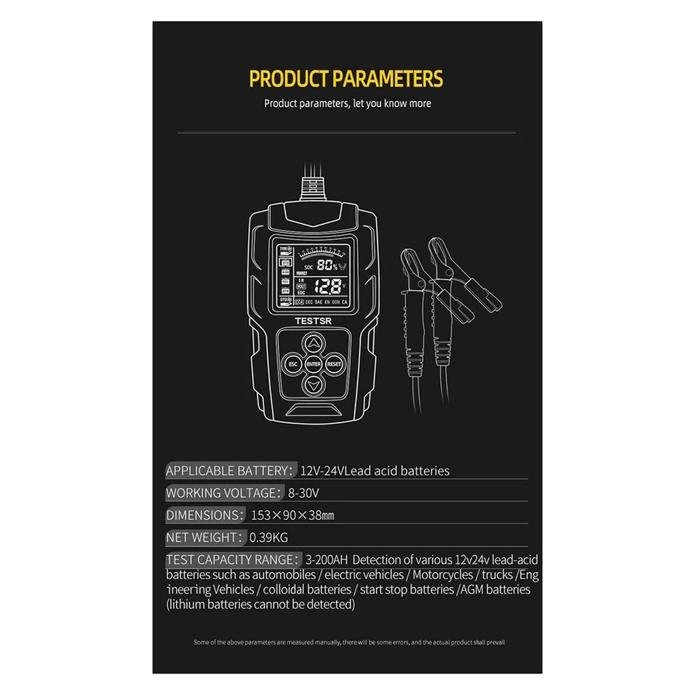 12/24V Automotive Battery Tester LCD Display Battery Analyzer Digital for6404 1. Material: ABS plastic material used by Automobile Battery Tester, and high quality. 2. Type of Vehicle Used: Measuring Instrument 12V 24V automobile battery tester LCD battery analyzer tester digital analyzer tester automobile, truck, motorcycle, SUV, boat and more. 3. Monitoring Battery Type: Digital Automotive Diagnostic Tester can detect all vehicle 12v and 24V lead-acid batteries, such as ordinary immersion batteries, flat batteries, spiral batteries and GEL batteries used in automobiles, suvs, light trucks, motorcycles, etc. 4. Multiple Monitoring Standards: According to SAE, DIN, IEC, EN, CA, standards, Battery Tester can provide accurate test results in only 3 seconds. Display:2.7 inch LCD Cable length:650mm (25.6 inches) Current measurement range:999 (A) Current measurement accuracy:0.1 (A) Voltage measuring range:8-30 (V) Voltage measurement accuracy:0.1 (V)) Measuring range of internal resistance:0-999 (m ohm) Internal resistance measurement accuracy:0.1 (m ohm) Test range:3AH - 200Ah Test results:, SOC, value, IR, etc Test standards:SAE, DIN, IEC, EN, CA, Voltage measuring range:8-30VDC Storage temperature:- 20℃ to+70℃ (- 4°F to 158°F) Operating temperature:- 20℃ to+60℃ (- 4°F to 140°F) Main function:automobile battery test Scope of use:all lead-acid starting batteries for automobiles, including conventional liquid charging, , sheet battery, wound battery, GEL battery, WET battery, etc. Applicable to:automobile factories, garages, automobile battery manufacturers, automobile battery agents, educational institutions, DIY enthusiasts, etc. Colour:Red & Black Material:Plastic Size:150x90x35mm/5.9x3.5x1.3in Package Contents: 1 * Battery Tester
