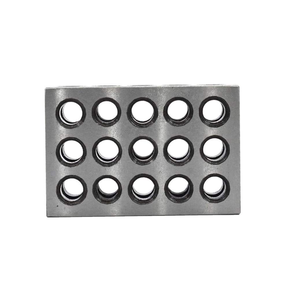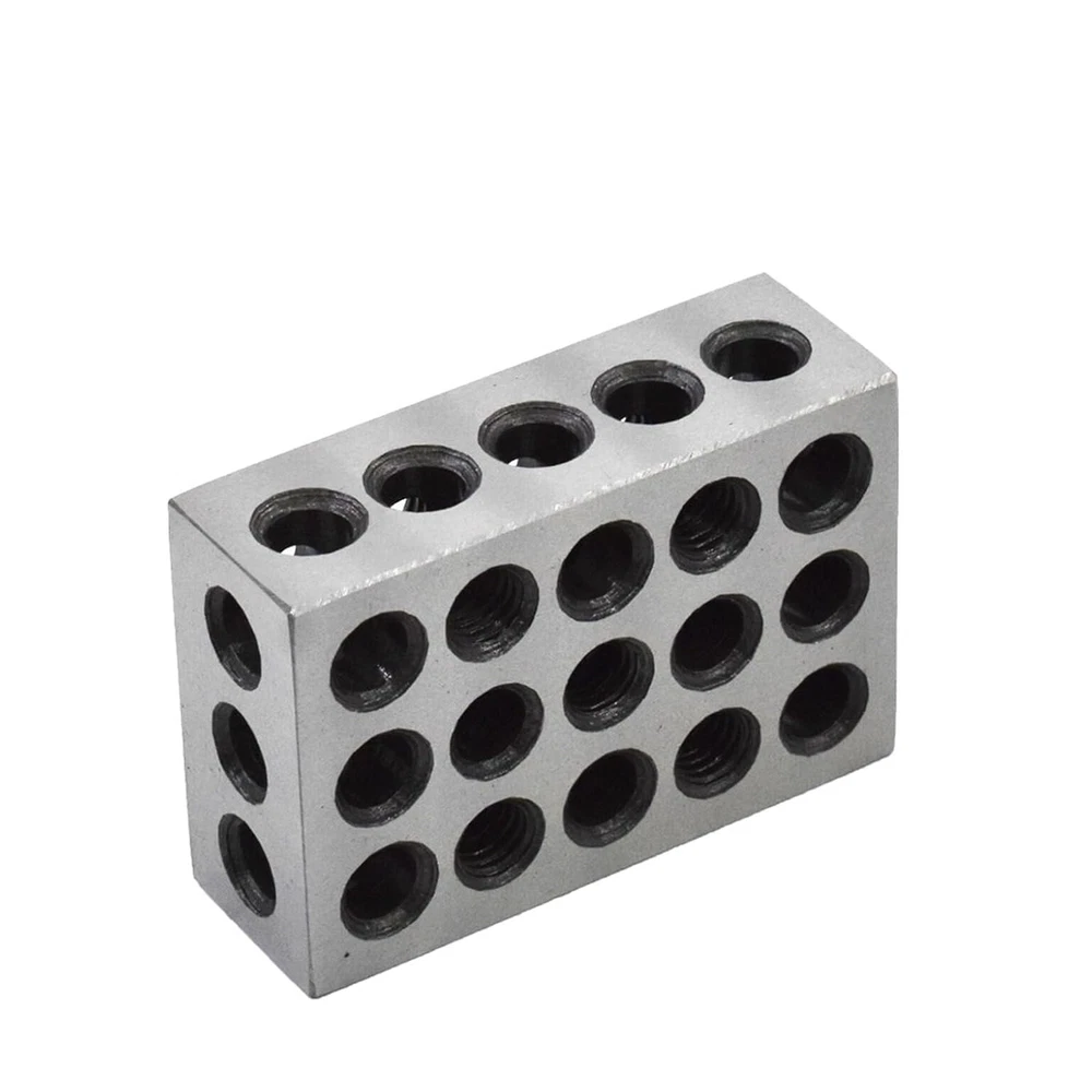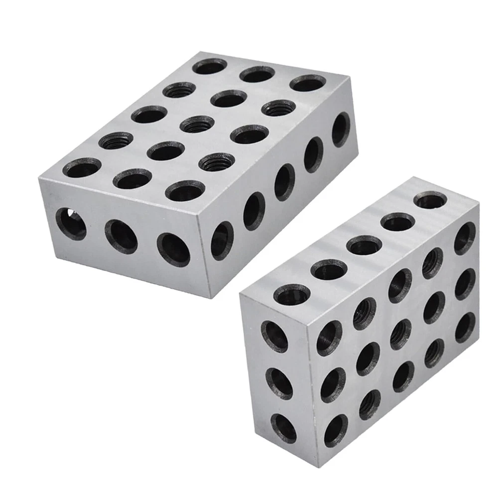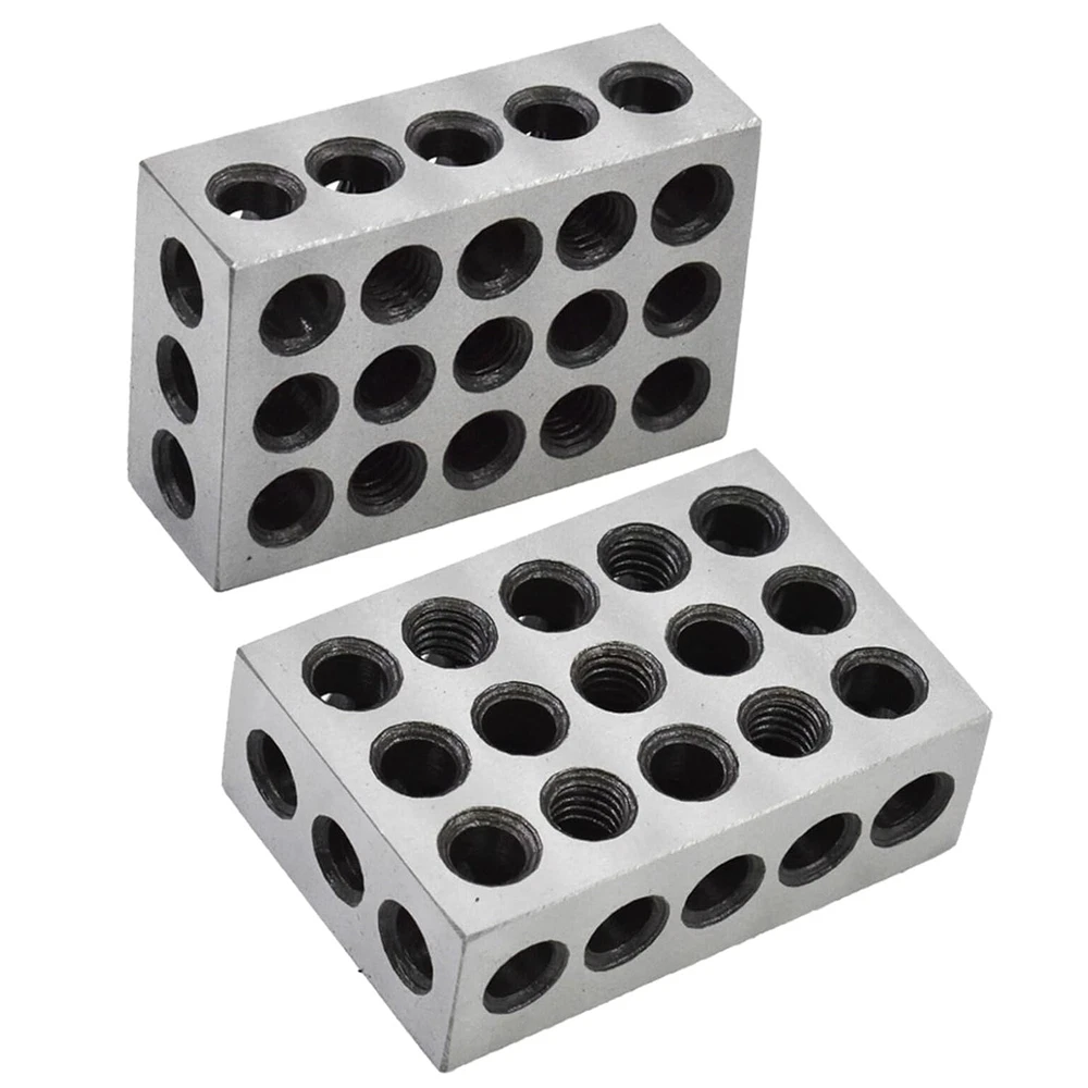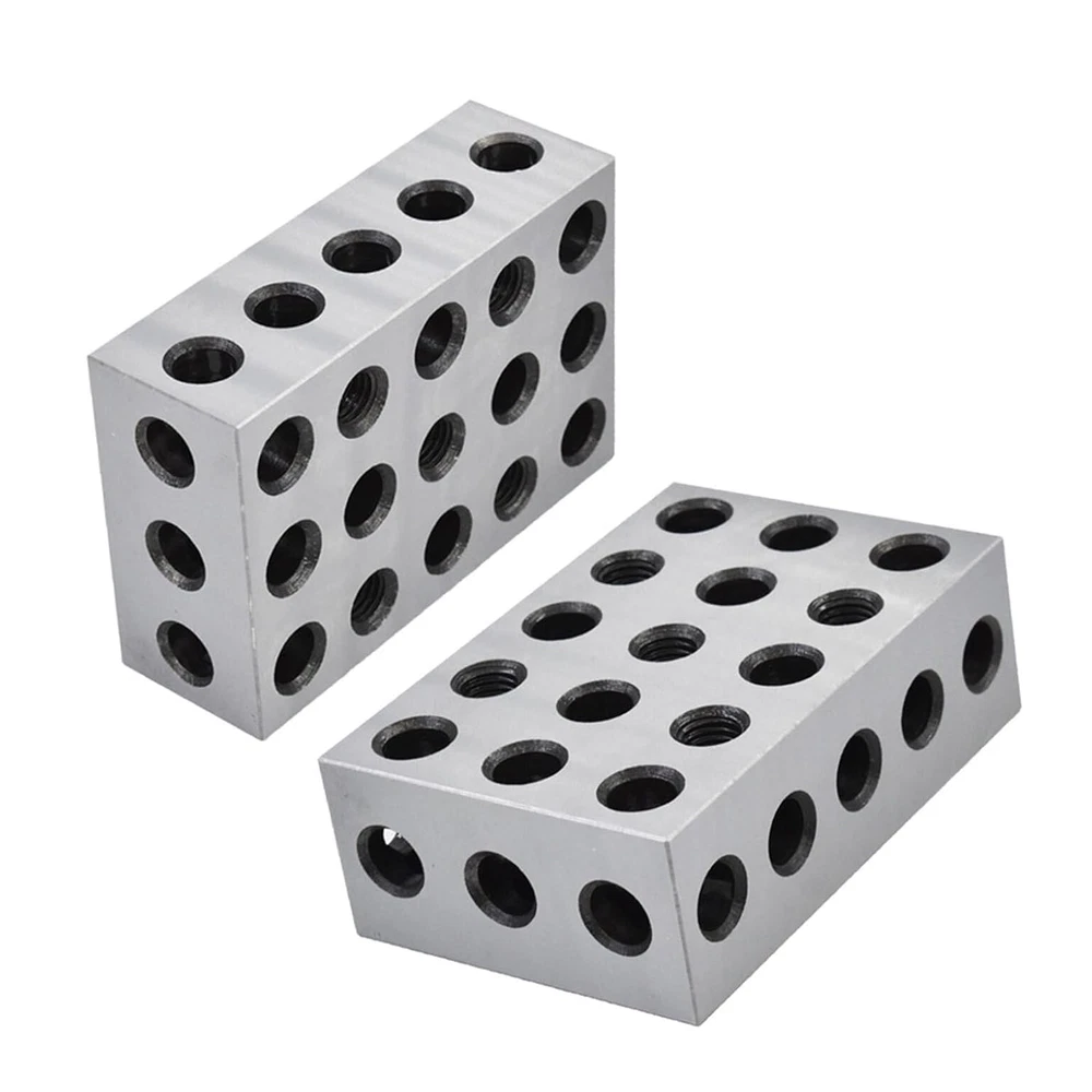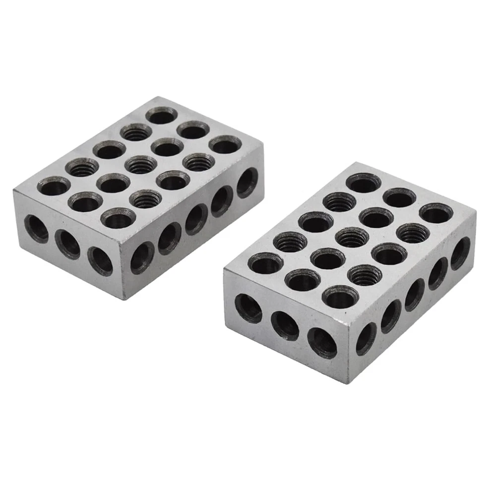 Robust and durable - Heat treated and case hardened to HRC 57-62. Made of precision-grade tool steel hardened and ground on all 6 sides of block Precise - Accuracy and squareness on all sides within 0.0001-0.0002 Feature - Cross drilling design gives minimum weight and maximum strength 23 holes consists of 5 tapped holes that are 3/8-16 for clamping and 18 untapped holes Cross drilling design allows for efficient use of lower weight with maximum strength Package includes - 2 x matched pair 1-2-3 set up blocks 1-2-3 Machinist Blocks 23 Holes Matched Pair Dimensions 1" x 2" x 3" Precision Overall size is within +/- .0002" Flatness and parallelism are within 0.0002" Squareness on all sides to within 0.0002" Pairs are matched to a tolerance of 0.0002" 2 x Machinist set up blocks