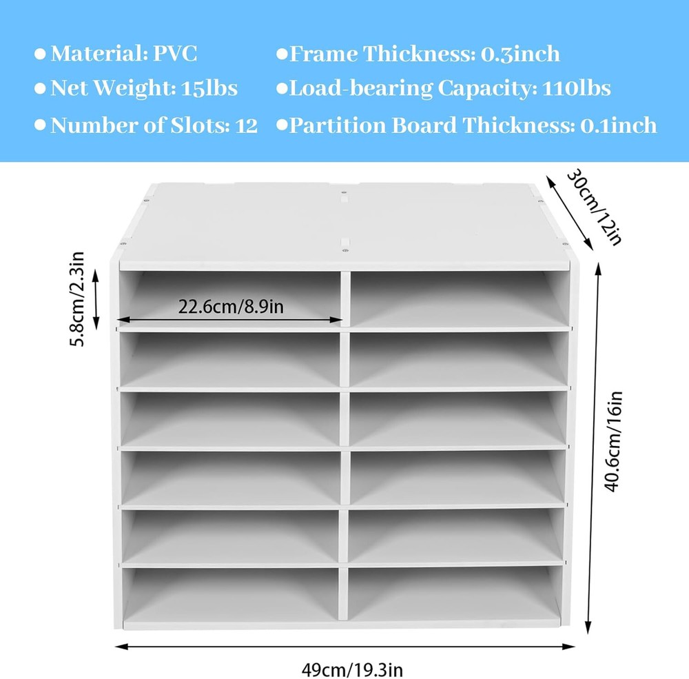 Specification Color: White Material: PVC Shape: Rectangular Style: Modern Number of Slots: 12 Load-bearing Capacity: 50kg/110lbs Net Weight: 7kg/15lbs Gross Weight: 7.5kg/16.5lbs Product Size: 49*30*40.6cm/19.3*12*16inch Each Slot Size: 22.6*30*5.8cm/8.9*12*2.3inch Frame Thickness: 10mm/0.3inch Partition Board Thickness: 5mm/0.1inch Package Included 1* Literature Organizer 1 Pair* Gloves 1* Sandpaper 1* English Installation Diagram 1* Schematic Diagram of Sandpaper Grinding All Accessories for Assembly 12Compartments Literature Organizer File Sorter Mail Center Holder Paper Cabinet Description Description The piles of messy documents on the desk make us feel bad, spend a lot of time looking for them, and slow down our work efficiency. This literature organizer offers a great solution to these problems. Made of thickened PVC, it is strong, durable, and has a strong load-bearing capacity(50kg/110lbs). The large size (19.3*12*16inch) can meet your daily storage needs and it is your ideal choice! Specification Color: White Material: PVC Shape: Rectangular Style: Modern Number of Slots: 12 Load-bearing Capacity: 50kg/110lbs Net Weight: 7kg/15lbs Gross Weight: 7.5kg/16.5lbs Product Size: 49*30*40.6cm/19.3*12*16inch Each Slot Size: 22.6*30*5.8cm/8.9*12*2.3inch Frame Thickness: 10mm/0.3inch Partition Board Thickness: 5mm/0.1inch Package Included 1* Literature Organizer 1 Pair* Gloves 1* Sandpaper 1* English Installation Diagram 1* Schematic Diagram of Sandpaper Grinding All Accessories for Assembly Key Features Strong and Durable: This product is made of high-quality PVC, which is wear-resistant, shock-resistant, strong, durable, and not easy to deform. Large Storage Capacity: This product is large with 12 slots and each slot (8.9*12*2.3inch) can store about 400 A4 sheets, which can meet your daily storage needs. Meanwhile, you can disassemble the partition boards to place high objects. This can make the space out of clutter and back to a neat and organized state. Open Design: It adopts an open design, allowing you to easily access items. This can save you lots of time. Good Stability: The rectangular shape and thickened PVC frame (10mm/0.3inch) ensure good stability and allow it to have a strong load-bearing capacity of 50kg/110lbs, so you don't need to worry about it shaking or tipping. Multiple Usage Scenarios: It can be used in schools to sort students' assignments or organize tablets in the classroom, and can be put in the office to present brochures and flyers for guests. Meanwhile, the studio can use it to arrange art supplies and letter-size paper stock. Easy Assembly: This product is simple in structure and complete in the package. You only need a few simple steps to install it, which is very time-saving and labor-saving. Modern Style: The pure white color, rectangular shape, and delicate lines make it stylish to blend in with different decor styles and add color to the space. Easy to Clean: The surface of this product is smooth and flat, which is easy to clean. You just need to wipe it with a wet rag. Guaranteed Customer Service: We aim to provide quality products and services. If you have problems, please feel free to contact us. We will reply and solve the problem for you as soon as possible. Details Thickened Top Panel: The thickened top has a strong load-bearing capacity, which allows you to put a lot of items on it with peace of mind. It can also facilitate your access to commonly used objects. Globes: A pair of gloves are included in the package, which can protect your hands from getting hurt while installing. Sandpaper: You can use it to polish the edges of the board to prevent scratching your hands. Application It is suitable for classifying and storing literature, magazines, comic books, files, student assignments, binders, catalogs, diaries, papers, documents, etc, and can be used in the home, school, office, and other places with a load-bearing capacity of 50kg/110lbs. Notes Please read the English installtaion diagram completely before installation. Please allow the slight color difference caused by the shooting light and 1-3cm error due to manual measurement, and make sure you do not mind before ordering. Description Payment Delivery details Terms of sales About us Contact us Payment We accept ebay payment 。 Fees such as import duties, taxes are not included in the item price or shipping costs. These charges are the buyer's responsibility. Delivery details Shipping: 2-9 working days to: USA Terms of sales We maintain high standards of excellence and strive for hundred percent customer satisfaction. Feedback is very important to us. We hope that you contact us immediately before you give neutral or negative feedback, so that we can address your concerns. It is impossible to address issues if we do not know about them! About us Your satis faction is our ultimate goal. We work hard to earn your trust and future business. Our certified technicians have tested each item before shipping. The unit comes with 1 year limited warranty on all manufacturing defects. a) If you receive a defective item, you may return it or ask for a discount. Please contact us within 14 days after you receive the package. b) What you returned must be intact and in its original packaging as re? u. Customer is responsible for shipping costs of the returned item. c) We will cover the cost of shipping back t with the shipping rate indicated in the registration page. We will send you a new unit or refund the full payment you paid. Thank you. Contact us Business Hour Business Hour: Monday To Friday: 8:30 AM to 5:00 PM (Beijing China time) Due to time zones, our reply to your questions may not be immediately. But within above working time, we will reply your email within 24 hours. If it's non-workdays, please kindly be patient and wait till Monday. Please contact us with ebay message. Please feel free to contact us if you have any questions. Monday To Friday: 8:30 AM to 5:00 PM (Beijing China time) Due to t