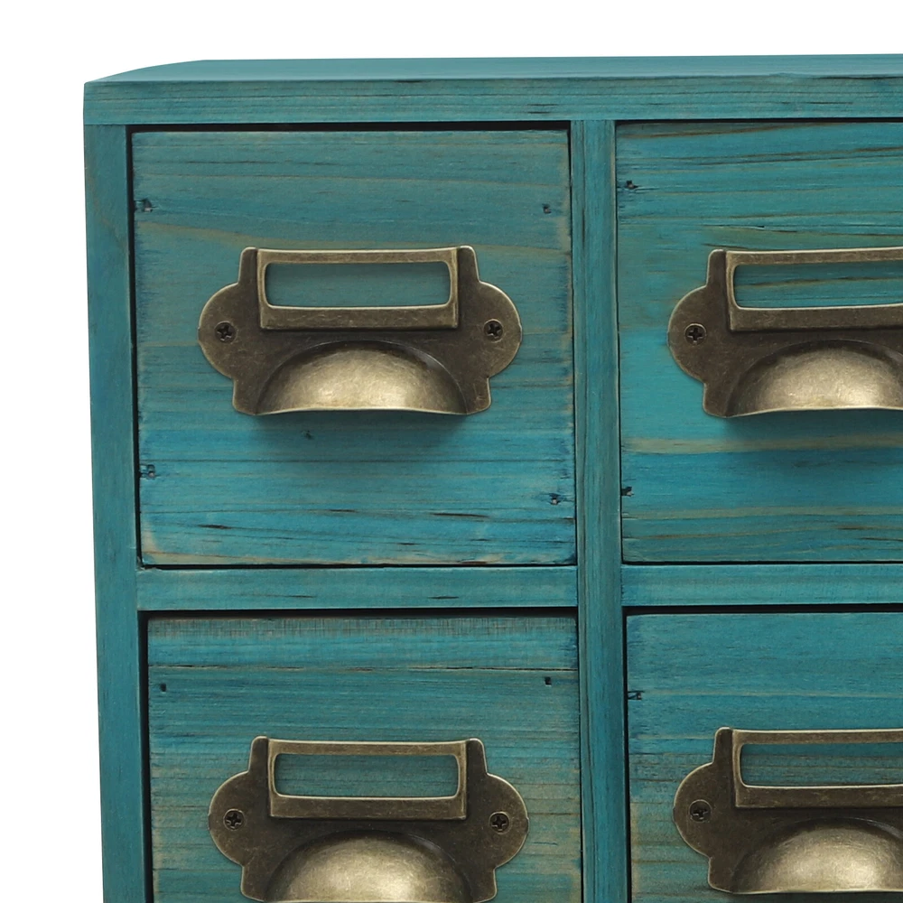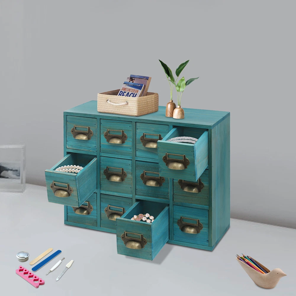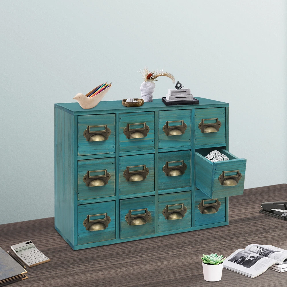 Description A great storage cabinet can make your living experience more convenient and comfortable. Its premium materials ensure durability and strong load-bearing capacity. The 12 storage compartments provide ample space for storing small items, keeping your desktop tidy. Its elegant and vintage appearance also makes it a great decorative piece! Key Features Build to Last: This product is made of premium solid wood, plywood , and zinc alloy, and the surface is treated with spray painting technology, which is wear-resistant, scratch-resistant, and not easy to deform, ensuring a long service life. Storage Assistant: The 3-tier design with 12 storage compartments provides ample storage space for categorizing Chinese herbs, stationery, and other small office supplies, making your desktop more organized and improving work efficiency. Stable Structure: The thick materials and a sturdy frame structure ensure that it can remain stable in long-term use and has a load-bearing capacity(22.05 lbs), so you can store items with confidence. Space-saving: It adopts a narrow body design(6.3 inches) and has a vertical structure, which will not occupy much tabletop space. Convenient to Clean: Its surface is smooth and its structure is simple, so you can easily wipe off the dust with a damp rag (not included). Nice Gift: This practical and beautiful product is a great holiday or housewarming gift for family, friends, and lovers so that they can enjoy a more convenient life. Nice Appearance: The elegant brown, wooden textures, and metal handles enhance its rustic and vintage charm, making it not only a convenient storage cabinet but also a unique decorative piece. Ready to Use: This product does not require additional assembly and can be used immediately upon receipt, making it labor-saving and convenient. Buy with Confidence: We stand behind all our guests and look forward to assisting you with your purchase. It is our pleasure to answer your confusion and questions. The end of the story between us is not "we sell and you buy". Details Round Corners: They add to the beauty of the product while ensuring safer use. Comfortable Handles: They make it easier for you to open cabinet drawers. Application It is suitable for households, offices, small workshops, traditional Chinese medicine stores, etc. It is used to organize various items such as spices, medicines, jewelry, handicrafts, cosmetics, essential oils, small office supplies, tea bags, lipsticks, and more. Specification Color: Blue Shape: Rectangular Material: Solid Wood, Plywood, Zinc Alloy Process: Spray Painting Assembly Required: No Mounting Type: Tabletop Number of Compartments: 12 Load-bearing Capacity: 10kg/22.05 lbs Product Size: 42*16*31.7cm/16.54*6.3*12.48in Package Size: 46*36*20cm/18.11*14.17*7.87in Gross Weight: 4.8kg/10.58 lbs Net Weight: 4.56kg/10.05 lbs Package Included 1* 12 Drawer Storage Cabinet Notes Please check the product size before ordering. Please allow the slight color difference caused by the shooting light and the 1-3cm error due to manual measurement, and make sure you do not mind before ordering.