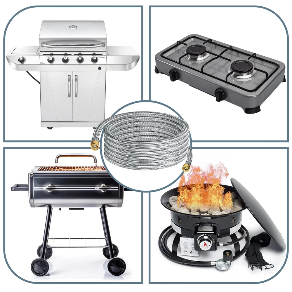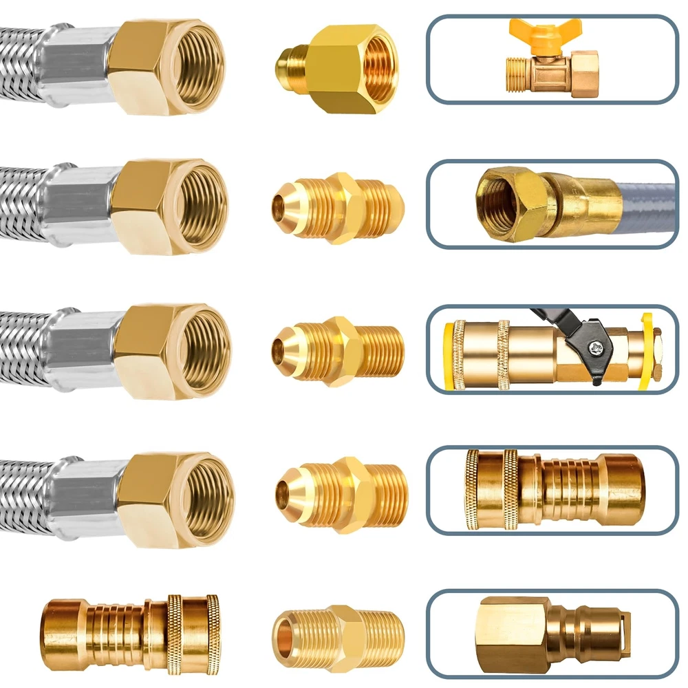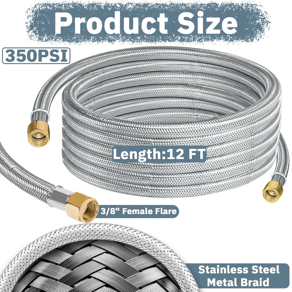 【Premium Material】12 Feet Stainless steel braided propane regulator hose are made of High-strength stainless steel braided. 3/8" female flare fittings on both ends are made of 100% Solid Brass.Durable solid brass provide secured connections between appliance and tank. This Propane Hose with CSA Certification, ensures air tightness and stability. 【Multipurpose Assembly Kit】12FT stainless steel braided propane hose with 5 x Different Conversion Adapter Fittings(3/8" NPT Male x 3/8" NPT Male, 3/8" Flare Male x 3/8" Flare Male, 3/8" NPT Male x 3/8" Flare Male, 1/2" Female NPT x 3/8" Flare Male, 1/4" NPT Male x 3/8" Flare Male). 【Easy to Use】12FT braided propane extension hose can meet your needs and can be used flexibly between propane tank and gas appliance. It can also be used to extend the propane storage tank pipeline on low-pressure equipment. 3/8 "propane hose adapter kit +Buckle Velcro makes the product easier to carry, store and use safely, saving your cost. 【Wide Application】12FT stainless steel braided propane hose has 3/8" internal thread ends on both sides, and is connected with equipment equipped with 3/8" external thread flaring fittings to help you realize multi-equipment connection. It can be used in gas grills, propane burners, fire pits, frying pans, stoves, propane generators, propane smokers, portable generators, etc. 【Quality Assurance】The package includes 1* 12FT 350 PSI High Pressure Propane extension Hose + 5* Brass Adapters + 1* Buckle Velcro + 1* Wrench + 1* Roll Sealing Tape .If you have any questions about this product, please feel free to contact us.