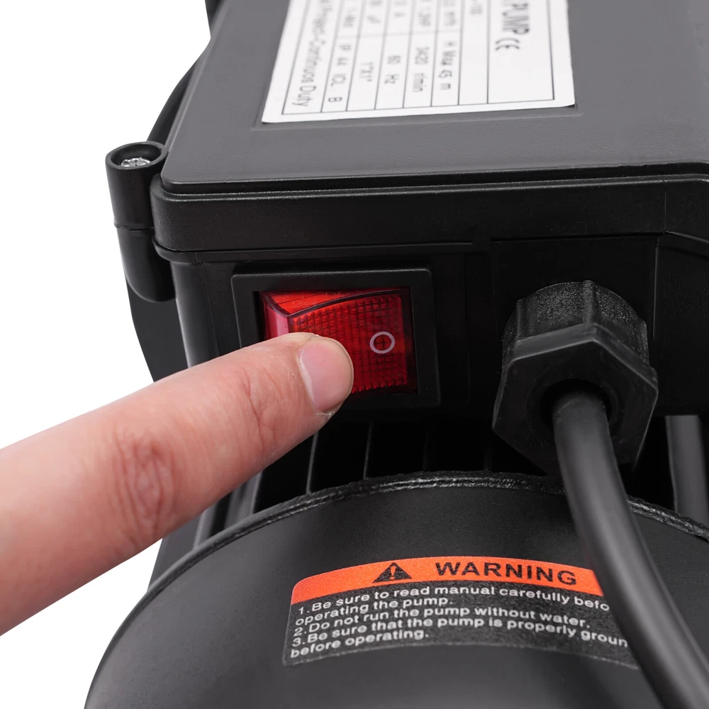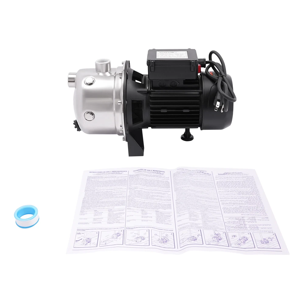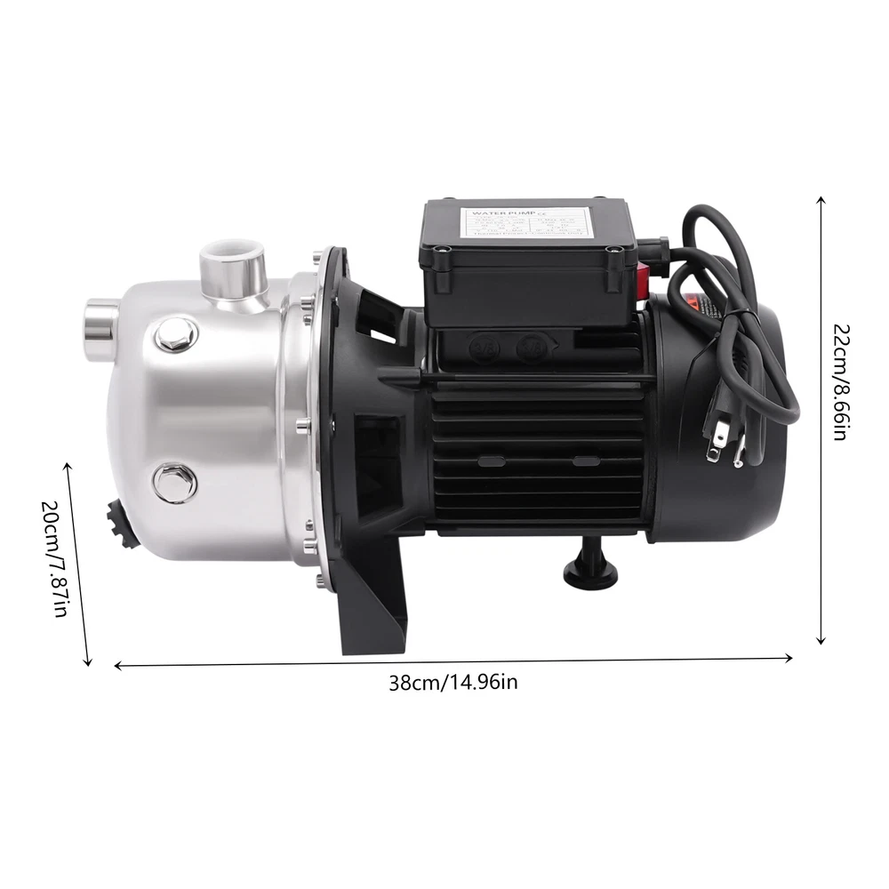 Specifications Material: Stainless Steel, Silicone Process: Painting and Polishing Motor: Pure Copper Motor Mounting Type: Floor Standing Power Source: Corded Electric IP Level: IP44 Waterproof Lever: IP68 Capacitance: 35μF Max Temperature: 55°C/131°F Voltage: 110V, 60Hz Input Current: 7.0A Power: 0.8KW(1.2hp) Rotating Speed: 3420rpm Water Pump Inlet: 2.54cm/1in Water Pump Outlet: 2.54cm/1in Max Sprinkler Volume: 3m³/h/792.52GPH Noise: 0-30db Maximum Lift Height: 45m/147.64ft Maximum Pressure: 4.5bar Maximum Suction: 8m/26.2ft Maximum Flow Rate: 3.2m³/h/845.35GPH Power Cord Length: 1m/3.28ft Gross Weight: 8.5kg/18.74lbs Product Size: 38*20*22cm/14.96*7.87*8.66in Package Included 1*Water Pump 1*Multilingual Manual 1*Sealing Tape 1.2HP 110V Shallow Well Jet Pump, Lawn Irrigation Pump for Home Farm Garden Lawn 1.2HP Portable Shallow Well Pump, Draining Irrigation Pump for Lawn, Water Pump Description If you are looking for efficient and simple irrigation methods, take a look at our water pump. Made of high-quality silicon and stainless steel with painting and polishing processes, this product provides quality assurance for your long-term use. Max 0.8kw power, 3420 rpm, and max.147.64ft lift make your work easier and more efficient. We believe it will be your assistant in agricultural production, breeding, or other work. Key Features Build to Last : The product is made of high-quality silicon and stainless steel, and adopts painting and polishing processes making it solid, and not prone to rust and corrosion, so it can remain beautiful and practical for a long time. High Efficiency: The 0.8KW pure copper motor, 3420rpm speed, 845.35GPH maximum flow rate, 26.2ft maximum suction, 4.5 bar maximum pressure, and tight bearing make your pumping and watering work faster and easier. Delivery Assistant: The maximum lift of the pump is 147.64ft, which allows you to irrigate farmland, fish ponds, and orchards for a long distance, saving the time and cost of manual transportation. Safety Guard: It has built-in thermal, IP68 waterproof level, overload protection, and is equipped with uniform heat dissipation holes and a fan, which can timely reduce the temperature during operation, and reduce potential safety hazards, thus extending the service life of the product. Good Sealing Performance: The product comes with a PTFE sealing tape, you can wrap it around the area that needs to be sealed to avoid water ingress or leakage, bringing you a better using experience. Low Noise: It runs very smoothly with little vibration and noise( 0-30db ), which can bring you a quiet working environment. Easy to Use: With a detailed instruction manual, you just need to follow the steps in the manual to pump, sprinkle, etc. Ideal Gift: Such a practical product is an ideal gift for family and friends who need garden watering and vegetable garden irrigation. Protective Package: To prevent damage to the product due to bumps in transit, we place air column bag and foam to protect the product as much as possible. Quality Service: We are honored that you have chosen our product. We have sufficient confidence in the quality of the product so that you can buy it confidently. But if you have any questions, you can contact our customer service, he will patiently answer and solve your problems . Details Standard Water Inlet and Outlet: The product adopts an NPT 1-inch large diameter water inlet and outlet, which can be matched with different types of water pipes and is very practical. Sealing Ring: The silicone sealing ring is used to avoid water leakage and reduce waste. Support Feet: They can better maintain the stability of the product and ensure smoother operation. Application It is suitable for sprinkler systems, irrigation, daily water delivery, and drawing water from shallow wells, ponds, lakes, rain barrels, tanks, and more. It can be used as a sprinkler pump, well pump, or booster pump and can pressurize your home for solar, washing machine, water heater, tap water, shower, etc. Specifications Material: Stainless Steel, Silicone Color: Black, Silver Process: Painting and Polishing Motor: Pure Copper Motor Assembly Required: Yes Mounting Type: Floor Standing Power Source: Corded Electric Plug Type: US Standard IP Level: IP44 Waterproof Lever: IP68 Capacitance: 35μF Max Temperature: 55°C/131°F Voltage: 110V, 60Hz Input Current: 7.0A Power: 0.8KW(1.2hp) Rotating Speed: 3420rpm Water Pump Inlet: 2.54cm/1in Water Pump Outlet: 2.54cm/1in Max Sprinkler Volume: 3m³/h/792.52GPH Noise: 0-30db Maximum Lift Height: 45m/147.64ft Maximum Pressure: 4.5bar Maximum Suction: 8m/26.2ft Maximum Flow Rate: 3.2m³/h/845.35GPH Power Cord Length: 1m/3.28ft Gross Weight: 8.5kg/18.74lbs Product Size: 38*20*22cm/14.96*7.87*8.66in Package Size: 46*30*26cm/18.11*11.81*10.24in Package Included 1*Water Pump 1*Multilingual Manual 1*Sealing Tape Notes Adding water to the pump head until it is full helps to speed up the inlet flow rate. The inlet pipe(not included) shall not be excessively bent and the end pipe (not included)shall be completely submerged. Please note that it is only suitable for clean water. Please read the operating manual completely before use, and pay particular attention to the safety instructions included. Please discharge the waste water if not used frequently and please do not run the pump without water. Please do not wet the motor before first use, and fill the pump head with water to wet the impeller. Please perform a water test after the installation is complete to check for leaks and other conditions. Please make sure that the air inlet joint or pipe is completely sealed and air-tight, and that hose used for the water inlet pipe is not sucked and deflated. Check the coupling to see if the internal drive is damaged. Please allow the slight color difference caused by the shooting light and 1-3cm error due to manual measurement, and make sure you do not mind before you order. Payment Delivery details Terms of sales About us Co