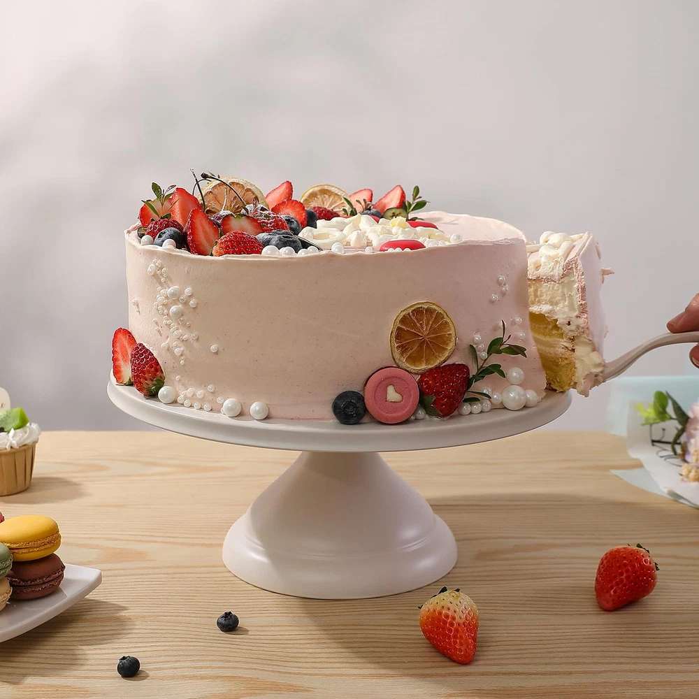 This 12 Inch White Round Cake Stand with Cake Spatula Perfect for 8 inch, 9 inch, 10 inch, 11 inch Cake,modern design and elegant in shape, it can use as a cake display, cupcake stand, dessert stand or serve candies, cookies and fruit, even Bbq outside etc, it is perfect for parties, showers, holiday gatherings, weddings, birthdays, Christmas and other events. The Stand is easy to assemble, sturdiness and easy to clean. đ°ăExpand SizeăLarge cake stand for kitchen is with diameter 11.8â,height of 5.23â, suitable for cake 8 inch, 9inch,10inch, 11inch in diameter, perfect cake tray for 10inch, 11inch cake, the cake Spatula utensil are Length 9.25â and Width 2.2â, This cake pedestal is also perfect for display or serving your cupcakes, macarons, candies, cookies, fruit, or other desserts đ°ăSafety MaterialăThe round cake stand sets are made of bamboo fiber, which is thicker and more textured than plastic. More resistant to falling than porcelain. A durable material that is BPA free, as well as top rack dishwasher safe, do not microwave, Phthalates free, Heavy Metal free, PP & PVC free. Food safety and environmental protection are our philosophy đ°ăElegant DesignăThe surface of the cake plate is flat and smooth,designed for easy slicing and serving cakes. Widening and weighted base design make the pedestal cake stand more stable on the table, even while holding two-tier wedding cakes. Seamless connection of threaded structure base is more solid and stable đ°ăColorăThe cake stand and cake spatula are same color classic black and same materials, they are modern and chic enough to be your first choice for cakes. The cake stand top tray can be use as a bbq plate and the stand leg also can use as a simply cup in outside đ°ăEasy to CleanăThe round cake stand set smooth and scratch-resistant, light and sturdy. The cake tray set won't easily get stained like many plastic products. They are easy to clean and can be safely used in dishwashers or by hand wash đ°ăUsage OccasionăGreat for Birthday Party, Weddings, Baby Showers, Anniversaries, Graduation,Ceremony, Christmas Holidays and many more. Our cake stand also make lovely presents for Friends' Birthdays, New Year's gifts or Housewarming gifts for all the family. Unique cake stand design makes your kitchen or dining room modern and well organized. It is a rare gift for anyone who likes making cake,any place any time