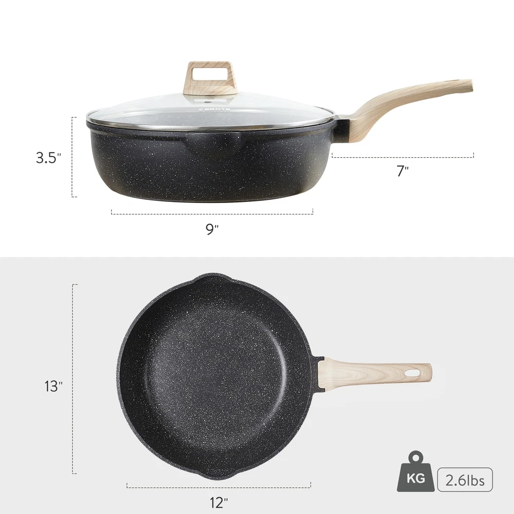 [Superior Nonstick Performance] - Our saute pan, made with natural granite materials, provides superior nonstick performance with 100% PFOA Free and non-properties. Enjoy healthier cooking with less oil intake. Advanced technology ensures a long-lasting and naturally nonstick surface that effortlessly releases food. [Super Easy to Clean] - Featuring 5x nonstick ability and a rivetless interior, our deep frying pan prevents food from sticking. After use, simply rinse it with soapy water for easy and convenient cleaning. [Heat Quickly and Evenly] - The enlarged induction base of our saute pan facilitates quick and even heat distribution. No more waiting, as you'll achieve better cooking results in less time. It is safe for all stoves, including induction. [Perfect Large Size] - Our non-stick saute pan is designed with a deep pan size to meet different cooking needs such as sautéing, poaching, braising, and deep frying. It is especially suitable for large families and can fulfill your everyday cooking requirements. [Ergonomic Design] - Double pouring spout, left - and right-handed pouring can be more convenient and effective. The long-lasting tempered glass lid allows you to monitor the cooking status and helps limit splashes on your stove. The wooden handle provides a comfortable grip and stays cool while cooking. [Service & ] - Each cookware undergoes strict multi-inspection processes. If you receive any defect items caused by delivery, please don't hesitate to reach out to us. We offer a 100% or a new .