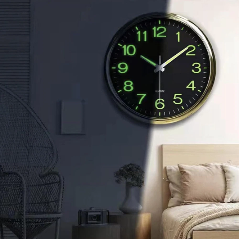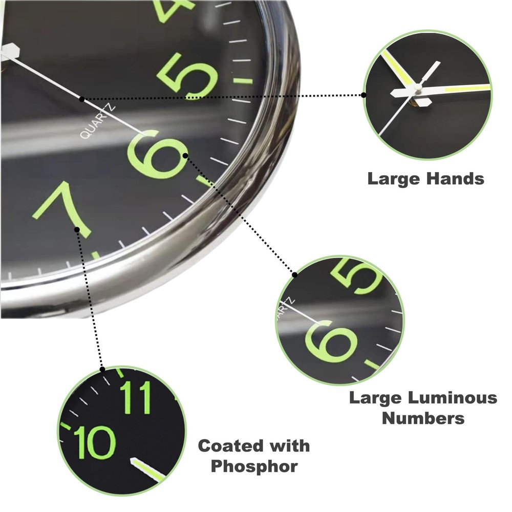 Luminous wall clocks, super quiet and non-ticking with night lights function, large enough for easily to see and read 12 inch diameter round fram, reliable quality Glowing up function, the large stereoscopic numeral have green night light asks for absorbing enough light energy during the day Super Silent clock, precise quartz movements to accurate time, quiet sweep second hand ensure a good sleeping and work environment Easy to Use, Hooks included with the clock , wide slot in back for easy hanging Battery operated and low-power quartz movement requires 1 AA battery - not included (a good battery can be used for more than year, energy saved)