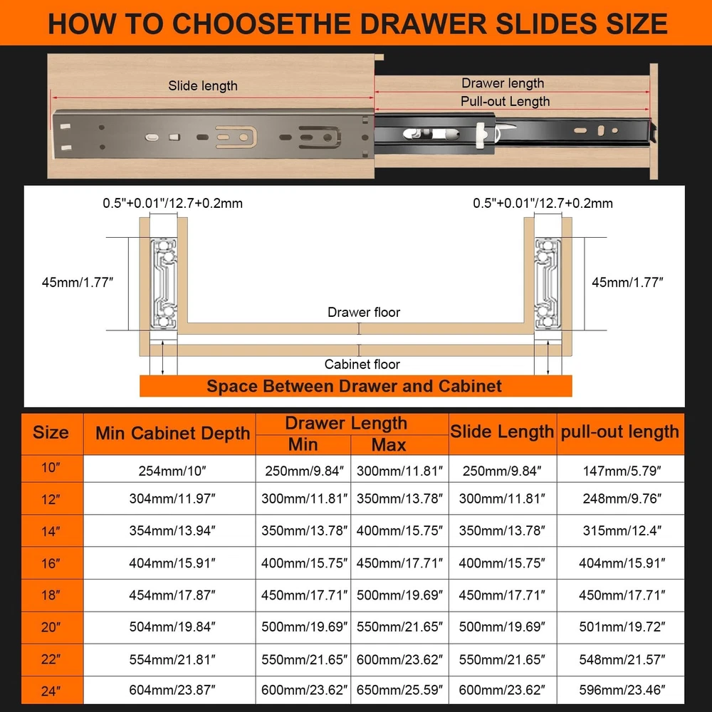 12 inch Drawer Slides 6 Pairs (12pcs) Soft Close 3 fold Full Extension Side Mount Cabinet Drawer Glides 12" Black Cabinet Rails for Dresser, Cabinet, Kitchen 100 LB Capacity Product Details Size: 12inch-300mm Brand: JI2OOYI MPN: 12inch-6-BK UPC: Does not apply EAN: Does not apply Color: Black Material: Alloy Steel Brand: JI2OOYI Product Dimensions: 12"L x 1.77"W x 0.47"Th Finish Type: steel Mounting Type: Side Mount Weight Limit: 100 Pounds Drawer Type: soft close drawer slides Manufacturer: JI2OOYI Number of Items: 12 Part Number: 12inch-6-BK Item Weight: 9.9 pounds Product Dimensions: 12 x 1.77 x 0.47 inches Country of Origin: China Item model number: 12inch-6-BK Size: 12inch-300mm Finish: steel Item Package Quantity: 6 Maximum Weight Capacity: 100 Pounds Included Components: 6 pair of drawer slides,mounting screws Batteries Included?: No Batteries Required?: No Date First Available: October 1, 2022 [6 pairs Soft Close Drawer Slides]:You will get 6 pairs(12pcs) soft self close drawer slides ,12 inch.And each drawer slides match with 12pcs screws.JI2OOYI self close drawer slides designed with ultra smooth soft-close function. Continuous bearings ensure smooth and quiet performance that offer less noise at closing and opening. [Guide for Choosing Size of Drawer Slides]:Side installation.The length of slides can't be longer than the cabinet case depth. Face frame cabinets will require a rear mounting bracket, whereas for faceless cabinets the slides are mounted directly on the side. To determine which size of slides are good for your drawer, please measure the length of the drawer without the frame board. And if the length is not even, please choose 1 inch shorter. [High-Grade Material]:All of the drawer slides which made by JI2OOYI are made from high-grade cold rolled steel that is electrom zinc plated.Rust resistant for your lifetime use.Side mounted Steel ball-bearing action.100 LB capacity. [3-Fold full extension & Detachable]:The 3-fold full extension allows for the entire drawer to be accessed.Three-stage stretching can pull out the drawer completely.Make full use of your drawer space.There is a plastic buckle on the back of the slide rail, by pressing it,the 3rdtrack(the narrowest section) can be separated.Easy to take down and clean.At the same time,double anti-drop function would prevent drawer separate from cabinets. [Application range]: JI2OOYI drawer slides are available in 10inch, 12inch,14inch,16inch,18inch,20inch,22inch.Various choices for drawers in your kitchen,bathroom,bedroom,office with different depth.It also can apply to ,keyboard drawers,wardrobe drawers,wooden or steel drawer,cabinet drawers,toolbox drawers that with demand for big load-bearing capacity.