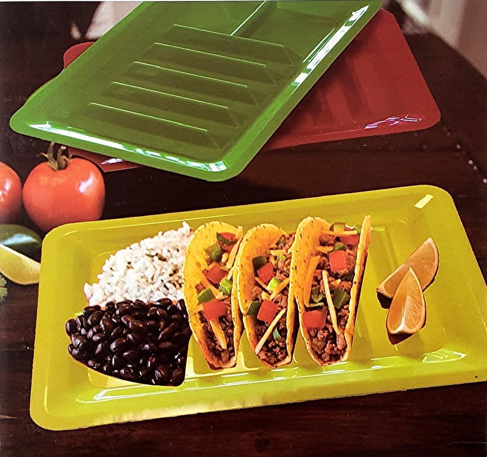 Stylish and Protective Enhance your taco nights with our vibrant set of 12 Taco Holder Plates, designed to make serving tacos both stylish and practical. Each plate is crafted from durable, BPA-free plastic and features multiple compartments to keep your tacos and side dishes organized and upright. With these plates, you can hold up to 5 hard or soft shell tacos, plus sides like beans, rice, and salsa. Our taco plates are not just for tacos; they are versatile enough to be used for a variety of dishes. Whether you’re hosting a Taco Tuesday, a dinner party, or a family gathering, these plates add a festive touch to any occasion. The plates come in assorted colors, making them a fun and colorful addition to your kitchenware. These plates are designed for convenience and durability. They are dishwasher safe, making clean-up a breeze, and microwave safe, allowing you to reheat your food easily. Key Features: Generous Set: Includes 12 taco holder plates in assorted vibrant colors. Practical Design: Keeps tacos upright with dedicated compartments for tacos and sides. High-Quality Material: Made from BPA-free plastic, ensuring safety and durability. Easy to Clean: Dishwasher safe for hassle-free cleaning. Microwave Safe: Easily reheat your food directly on the plates. Convenient Size: Each plate measures 12.7" x 8.7" x 1" and is top-shelf dishwasher safe. Upgrade your dining experience with our taco holder plates and enjoy a mess-free, fun, and colorful meal with family and friends. Specifications: Material: BPA-free plastic Colors: Assorted (Red, Yellow, Blue, Green) Dimensions: 12.7" x 8.7" x 1" Package Includes: 12 x Taco Holder Plates Bring a splash of color and convenience to your taco nights with our versatile and durable taco holder plates. Order now and make every taco night a hit! SET OF 12 TACO HOLDER PLATES: Includes 12 plates in vibrant assorted colors, perfect for any taco lover. KEEPS TACOS UPRIGHT: Compartments designed to hold up to 5 tacos plus sides, preventing messes and making assembly easy. MULTIFUNCTIONAL DESIGN: Ideal for serving not just tacos but also beans, rice, salsa, and other dishes. Add to Cart SAFE & DURABLE: Made from BPA-free plastic, these plates are dishwasher safe and microwave safe for convenience. PERFECT FOR ANY OCCASION: Great for Taco Tuesday, taco nights, dinner parties, and family gatherings. Let your creativity shine with versatile serving options. EASY TO CLEAN & SIZE: Each plate measures 12.7" x 8.7" x 1" and is top-shelf dishwasher safe, making clean-up a breeze.