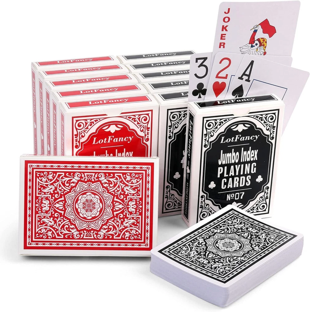 Great quantity of 12 decks playing cards: 6 red and 6 black; each deck contains 52 suited cards and 2 jokers Playing cards are great for many card games: Texas Hold'em, Blackjack, Pinochle, Euchre, Bridge, Canasta, Go fish, Poker, Hearts, Baccarat and more Jumbo index playing cards are super-indexed, big-faced and large-numbered, easy to see, helpful to players with imperfect eyesight, and favored by seniors Plastic-coated decks of cards for a smooth feel and extra durability, easy to shuffle; made from paper stock; linen finish for better handle; blue core sandwich construction for professional game play, nearly Casino Grade Poker size (wide size) cards measure 2.5" x 3.5"; This is regular playing cards. If you play pinochle game, just pick out two copies of 9,10, J, Q, K, A cards of all four suits and remove unneeded cards. Product Description Jumbo Index Playing Cards If you have to strain to see the small print on standard index cards, then Jumbo Index is good choice for you. Jumbo index means the ranks, and suit symbols are printed larger on the cards than standard index. The card size is same with traditional card, measures 2.5" x 3.5". Super Index Playing Cards are easier to see from far away, especially great for Texas Hold'em, which requires you to hold few playing cards in your hand, and relies heavily on community cards for all the players crowded around the table to see. Jumbo Index is also suitable for players with imperfect eyesight, and favored by seniors. LotFancy Playing Cards LotFancy Playing Cards are made from paper, coated with a layer of plastic, to make slick, durable and flexible. These cards have excellent quality graphics, shuffle easily and feel very substantial. Blue core sandwich construction prevents from cheat, nearly Casino Grade, great for professional game play. Jumbo-indexed playing cards feature classic red and black suits, super-index, and big-face, available in both black and red card backs. Each deck includes 52 suited cards and 2 jokers. You will love it ! Playing cards are one of favorite items for party, travel and camping to kill time with friends and family, perfect for Poker Night and Casino Party. Whatever you play texas, poker, bridge, euchre, canasta, hearts, go fish, pinochle and other different variations of solitaire, even practice card sleights or cardistry, LotFancy playing cards can satisfy all your need. Specification Quantity: 12 Decks or 2 Decks Color: red; black Card size: 2.5” x 3.5” (63mm x 88mm) Index: jumbo size