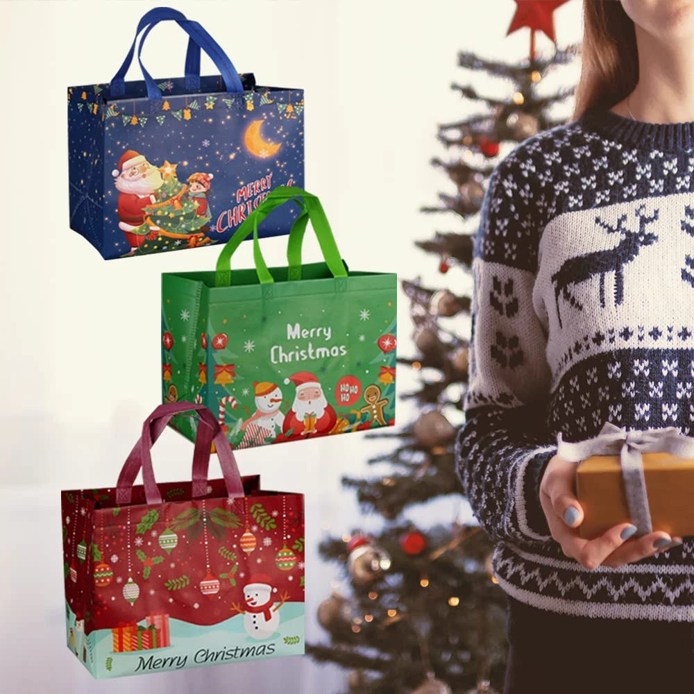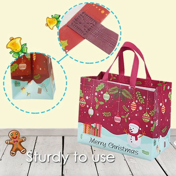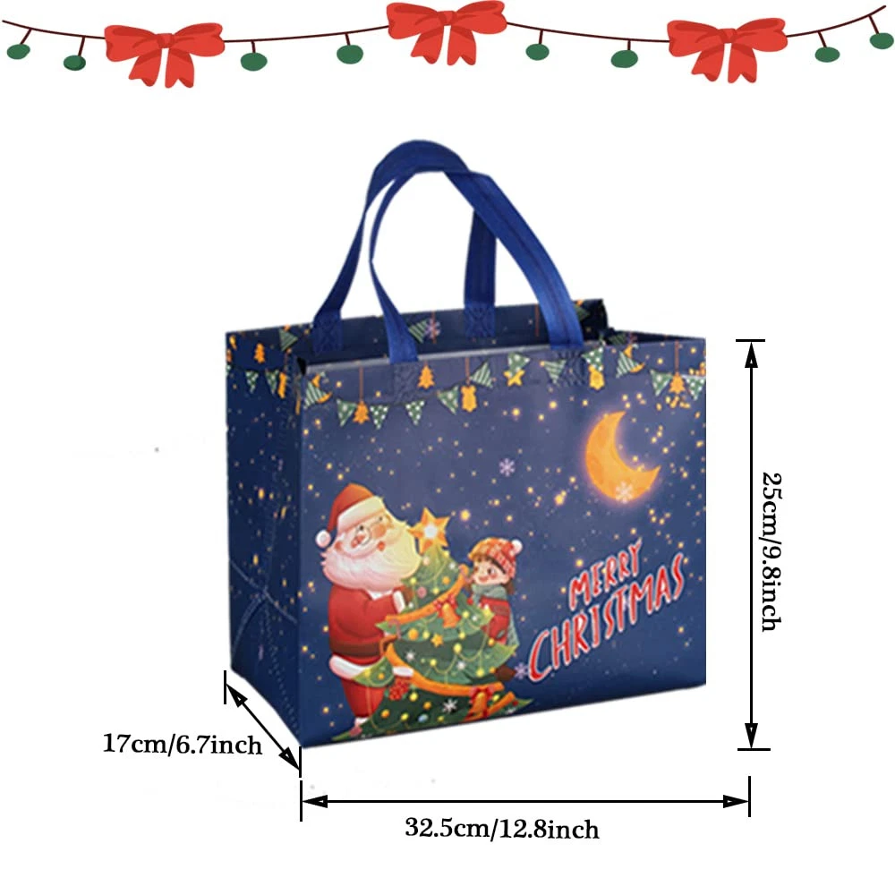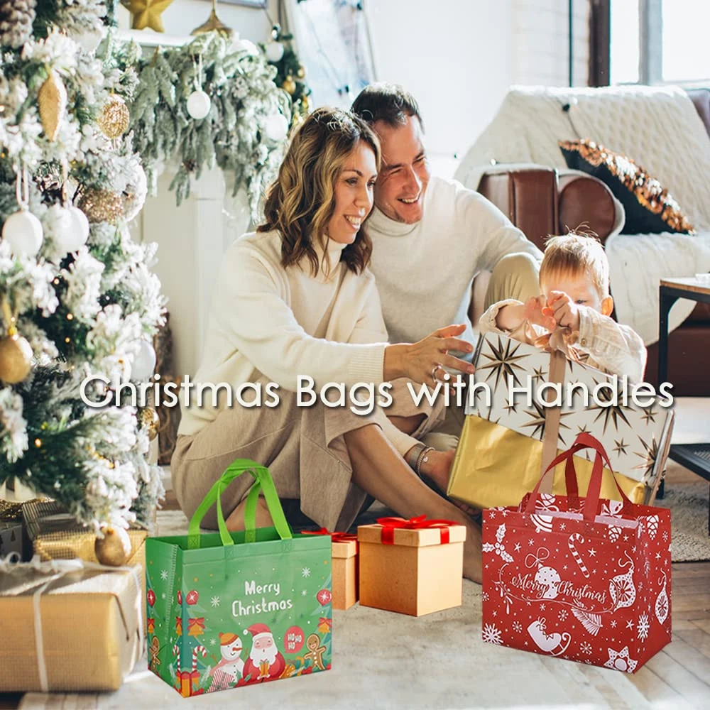 What you get - 12 Pcs Large Christmas Tote Bags with handle. Sturdy chirstmas bags - This christmas gift bags are made of non-woven fabric for durability, big christmas party bags are strong and tough, so no worrying about the contents when the bag gets heavy. Perfect Size - 32.5×25×17cm/12.8"×9.8"×6.7", big christmas tote bags and enough space to hold small/medium size gifts Great looking - Christmas tote bags come with 6 different christmas patterns, cute, the color and design of the bags are cute, so nice to use these as gift bags for your famuly Christmas gifts. Great for multiple gifts - 12pcs Christmas tote bags with handles, convenient to hold and canbe reusable, nice for gift bags.