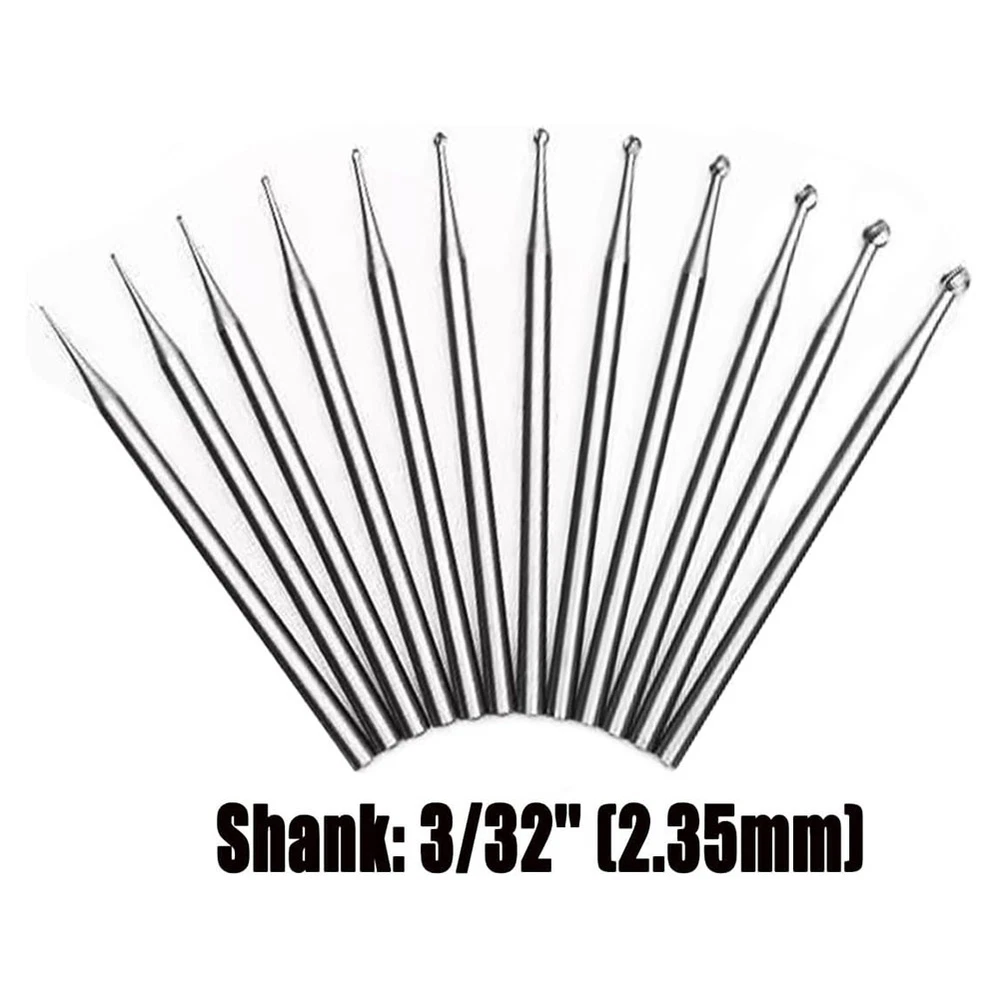 12Pcs Round Shape Burr Set - 3/32Inch Shank Jewelry Making Burs Round 5325 Constructed from top-quality Vanadium steel, these engraving bits exceptional durability and precision. perfect for detailed work, the burs range from 0.5 to 4 mm in size(0.5/0.6/0.8/1.0/1.2/1.4/1.6/1.8/2.0/2.3/3.0/4.0mm), accommodating various carving needs for professionals and hobbyists alike. Designed to fit seamlessly with any 3/32 inch (2.35 mm) shank rotary tools, these versatile burs are perfect for electric drills, grinders, and more. They provide the convenience and flexibility needed for intricate engraving and carving tasks. Perfect for a wide range of materials including silver, jewelry, wood, and walnut, these burs are perfect for craftsmen and artists. Whether you're a professional jeweler or a woodworking enthusiast, find these tools indispensable for your projects. Highly recommended for engraving delicate items such as olive cores, beads, , wood, and bone, as well as precious soft metals. These burs are specially crafted to handle fine details without damaging the fragile materials. Please note: the physical slightly color difference or difference, does not affect the use, please do not mind, thank you! Colour:Silver Material:steel Size:0.5/0.6/0.8/1.0/1.2/1.4/1.6/1.8/2.0/2.3/3.0/4.0mm Package Contents: 12 * Round Shape Ball Burr