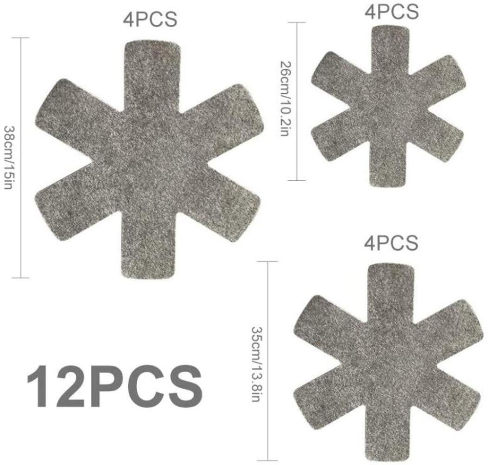 Specifications: Color: Grey Material: Non-woven Size: As picture show Packaging Included: 12pcs(38cm * 4pcs, 35cm * 4pcs, 26cm * 4pcs) Features: Made of quality non-woven fabric, these POTS and pans protective pads are thick, durable and reusable with a non-slip texture that stays stable when stacked or nested. They can be trimmed to any size you like according to your needs. Put a protective cover between the POTS to avoid scratches and extend the service life of the POTS. In addition to easy storage, you can even use them to prevent POTS from damaging countertops. They are suitable for storing kitchen utensils and transporting them over long distances. Great for stacking your kitchenware, bowls, plates, cups, glassware, baking utensils, stoneware, ceramics, frying pans, etc. You will get a set of 12 grey POTS and pans protective covers in 3 sizes, 38cm, 26cm and 35cm, with 4 pieces of each size to meet your daily needs. You can cut the size according to your needs, which is very convenient for your use. The pot protector is made of non-woven fabric, which can be reused, has a non-slip texture design, and is stable when stacked or nested. Place these wok protectors between the wok sets to protect them from scratches and bruises and to protect their non-stick coating and appearance, extending the life of the wok sets. Easy to use, provides perfect protection, suitable for stacking your cookware, bowls, plates, cups, glassware, baking utensils, stoneware, ceramics, frying pans, etc.