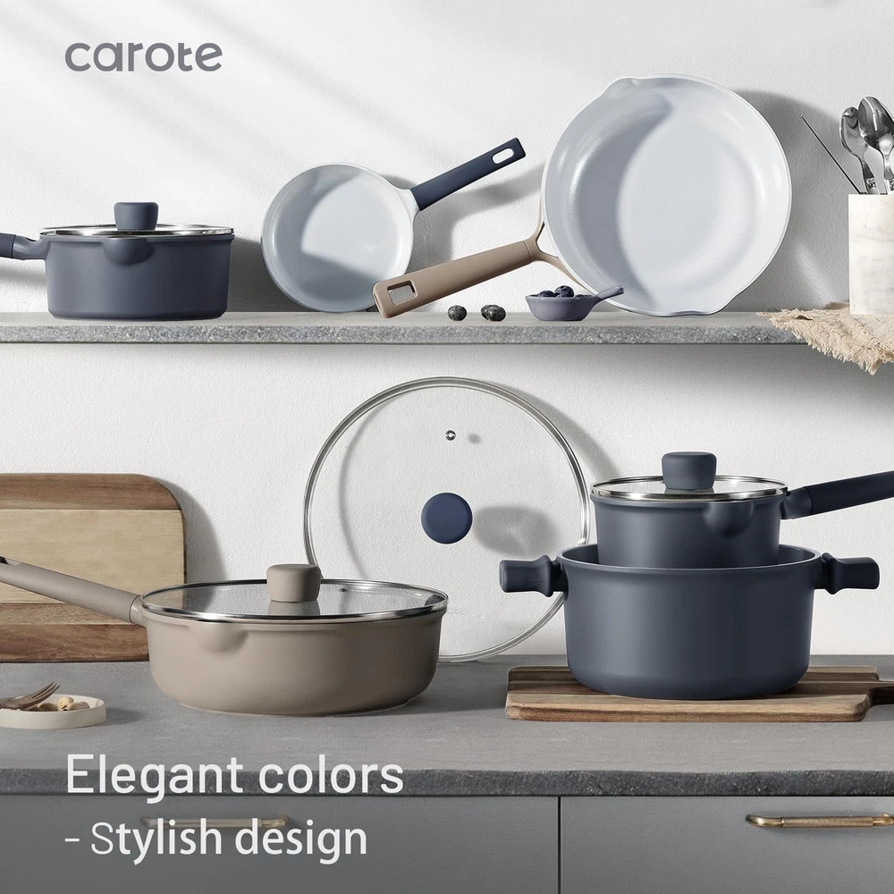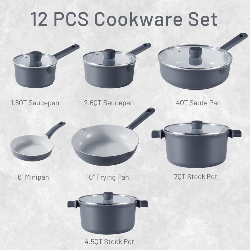 Ceramic Cookware Set 12 Piece, Healthy & PFOA/PFAS Free, Nonstick Pots and Pans Set, Induction-Compatible, Navy Blue Our ceramic-coated cookware is free from PFOA, PFAS, PTFE, lead, and cadmium, ensuring safe, chemical-free cooking. Built to withstand everyday use, with a robust design and non-stick surface for easy cleaning and reliable performance. The naturally non-stick ceramic surface requires less oil, promoting healthier meals and effortless cleanup. With a reinforced die-cast aluminum base, this cookware heats evenly and works on all stovetops, including induction. provides 12 months warranty from the date of purchase. Please don't hesitate to reach out if any quality problem. You will be guaranteed to get satisfying solution.