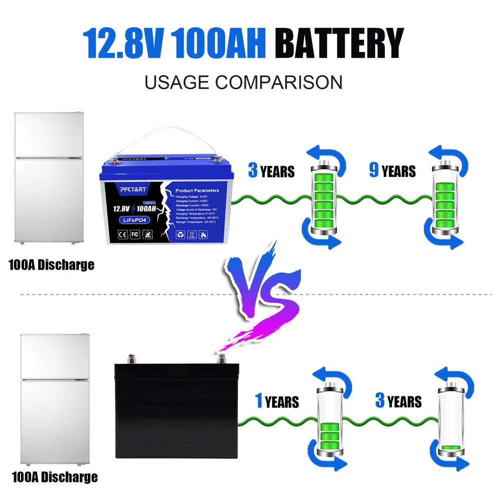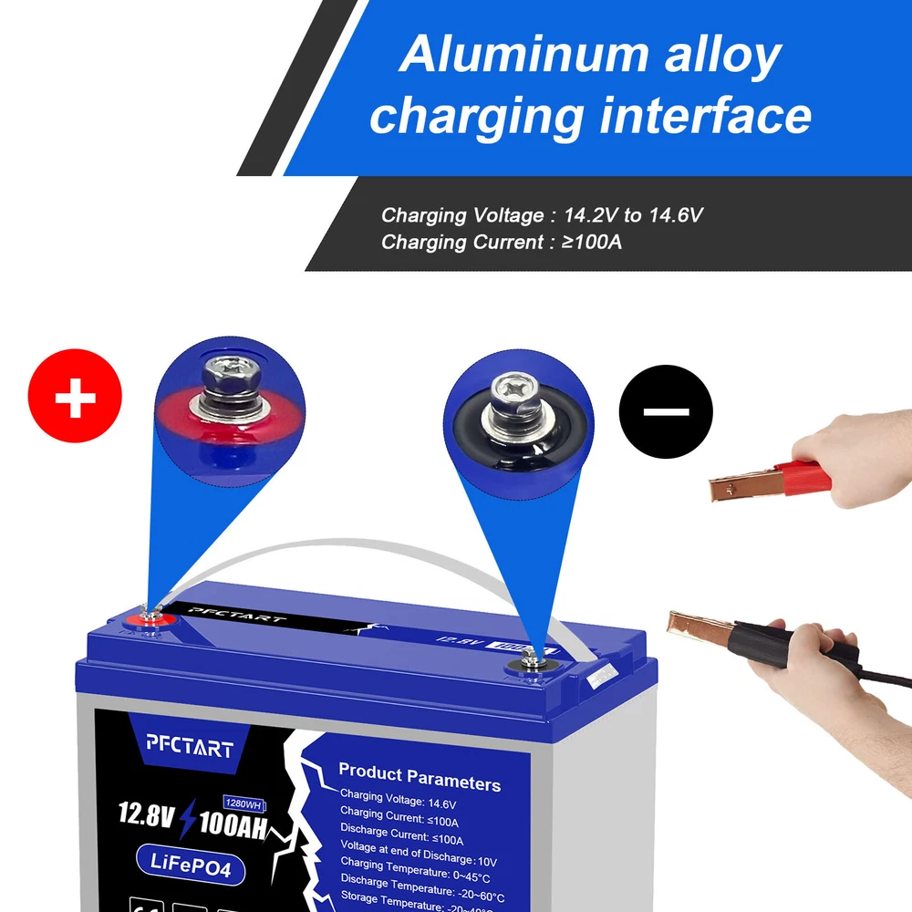 Features 【Automotive Grade Lithium Battery】 PFCTART lithium iron batteries have exceptional quality since they are manufactured by Automotive Grade LiFePO4 Cells with higher energy density, more stable performance & greater power. Highest-level safety based on UL Testing Certificate for the cell inside the battery.This makes li-iron batteries perfect for solar home, RV, campers,motor homes, off-grid applications. 【10 Years lifetime】PFCTART LiFePO4 battery provides 4500+ cycles, which is more than 10 times to Lead Acid with 300~600 cycles. PFCTART LiFePO4 battery has a 10-year service life, three times longer than the Lead Acid’s 3-year lifetime. 【95%* Efficiency】 PFCTART LiFePO4 battery’s flat discharge curve holds above 12.8V for up to 95%,of its capacity usage, providing astronomical boosts in run-time compared to only 50% in Lead Acid. This product is your best choice for outdoor camping power and indoor easy installation. 【1/3* Lightweight】 PFCTART LiFePO4 Battery weighs only 25.57 lbs for one module, only 1/3* the weight of lead acid batteries, which makes it an easy choice for RVs, Marine and Off-Grid Applications when mounting or mobility is in the consideration. 【100% Protection】 PFCTART LiFePO4 battery has built-in BMS (Battery Management System) to protect it from overcharge, over-discharge, over-current, and short circuit with excellent self-discharge rate. Built-in high-temp cut off prevents charging over 167 °F (75 °C). Without memory effect, no matter what state the battery is, it can be used as soon as it is charged. PFCTART LiFePO4 battery is IP65 level waterproof, which set you free from worrying to install indoors or outdoors. Specifications Battery type: LIFEPO4 MODEL: 100Ah 12.8V(4S1P) Rated capacity: 100Ah(1280WH) Normal voltage: 12.8V Discharge termination voltage: 10.0V Charging voltage: 14.6V Internal resistance: ≤180mΩ Single cell: IFR 3.2V 100Ah Standard charging. Continuous current: 0.2C5A Continuous voltage: 14.6V Cut-off current: 0.01 C Standard discharge: Constant current 0.2C5A end voltage 10.0V Max. charging continuous current: 100A Maximum discharge continuous current: 100A Operating temperature range. Charge: 0~45℃ Discharge: -20~70℃ Product size: 329*171*235mm Weight : 11.6kg(25.57lbs) BMS protection Cell overcharge detection voltage:3.90V±50mV Cell overcharge recovery voltage:3.80V±100mV Cell over-discharge detection voltage:2.00V±100mV Cell over-discharge recovery voltage:2.30V±100mV Rated operational charge current:100A Over current detection:150±30A PCM impedance:≤50mΩ Note The BMS it supports up to 51.2V series or 16 parallel installations of the same voltage and same capacity (4S4P), please fully charge the batteries before series/parallel installation to ensure that each battery is at the same voltage and same capacity.