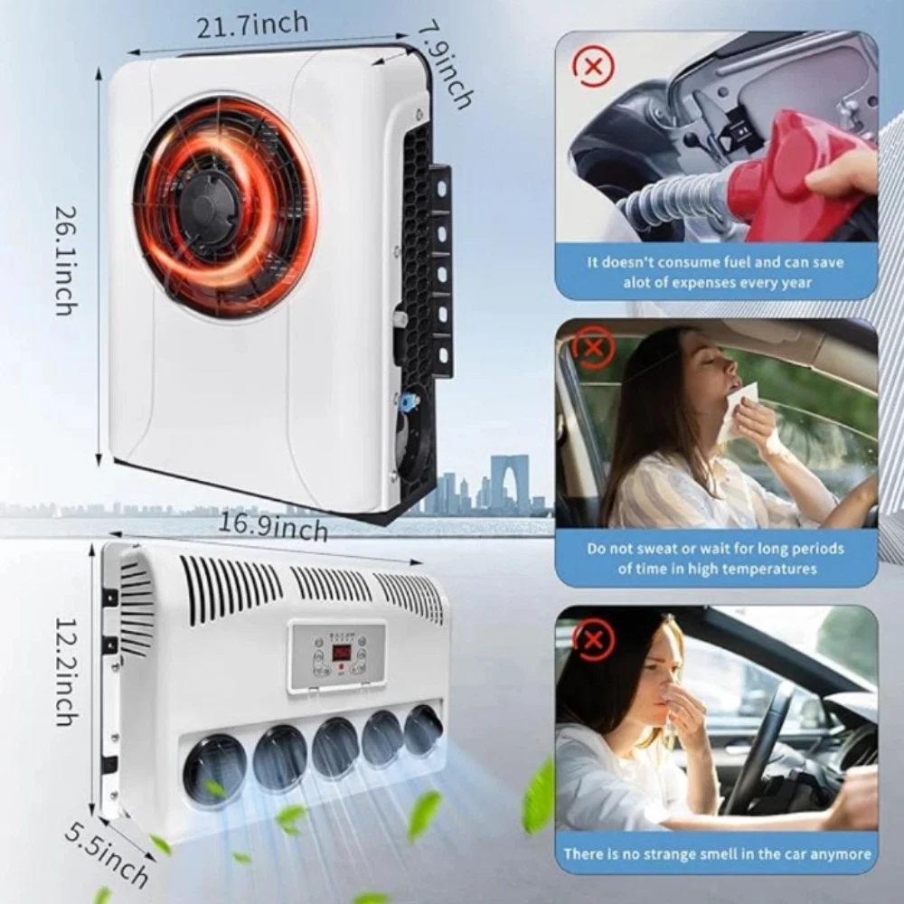 The parking air conditioner is a kind of in-car air conditioner. It refers to the equipment that uses the on-board battery DC power supply (12V) to make the air conditioner run continuously when parking and waiting and resting, and to adjust and control the temperature, humidity, flow rate and other parameters of the ambient air in the car, so as to fully meet the comfort cooling needs of the truck driver. ATTENTION:600 g R134A is required to be CHARGED into the air conditioner machine ,if you think 600 g is not enough and want to make the machine make more cooler air,you may charge more R134A ,and the max is 750 g. F eatures : 1. Thick aluminum condenser, anti-corrosion aluminum, good ventilation and heat dissipation, fast flow rate and fast cooling 2. Stainless steel shell, corrosion-resistant, no deformation 3. Save fuel and electricity 4. Remote one-button control 5. Intelligent frequency conversion 6. Super large air volume, silent air, 360 degree air supply, three gear options 7. Large air outlet 8. High-quality screw fittings, fine workmanship 9. Automatic transmission, rapid cooling, long standby time 10. Automatically adjust the temperature according to room temperature Specification: Powered by the battery of the Truck car. 1. BTU: 12000 2. Rated power: 300-950w 3. Rated current: 40-80A 4. Undervoltage protection: 11.4 5. Protection level: IP * 4 6. Freezing medium: R134a 7. Voltage: DC 12 V 8. Air volume: 500m³ / h 9. Cooling capacity: 2500W 10. Undervoltage response: 10.6-11.4v 11. Control method: remote control 12. refrigerant-capacity: 600g-750g ( R134A ) 13.battery cables:7 awg (if the cables are too short for you,you can buy a 100A anderson connector and extra two 7awg cables to make it longer enough ) 14. Applicable models: heavy trucks, light trucks, construction vehicles, excavators, ships, touring vehicles, refrigerated vehicles, etc. 15.suggest battery:12v/150a or better Package Includes: 1 Set Air Conditioner