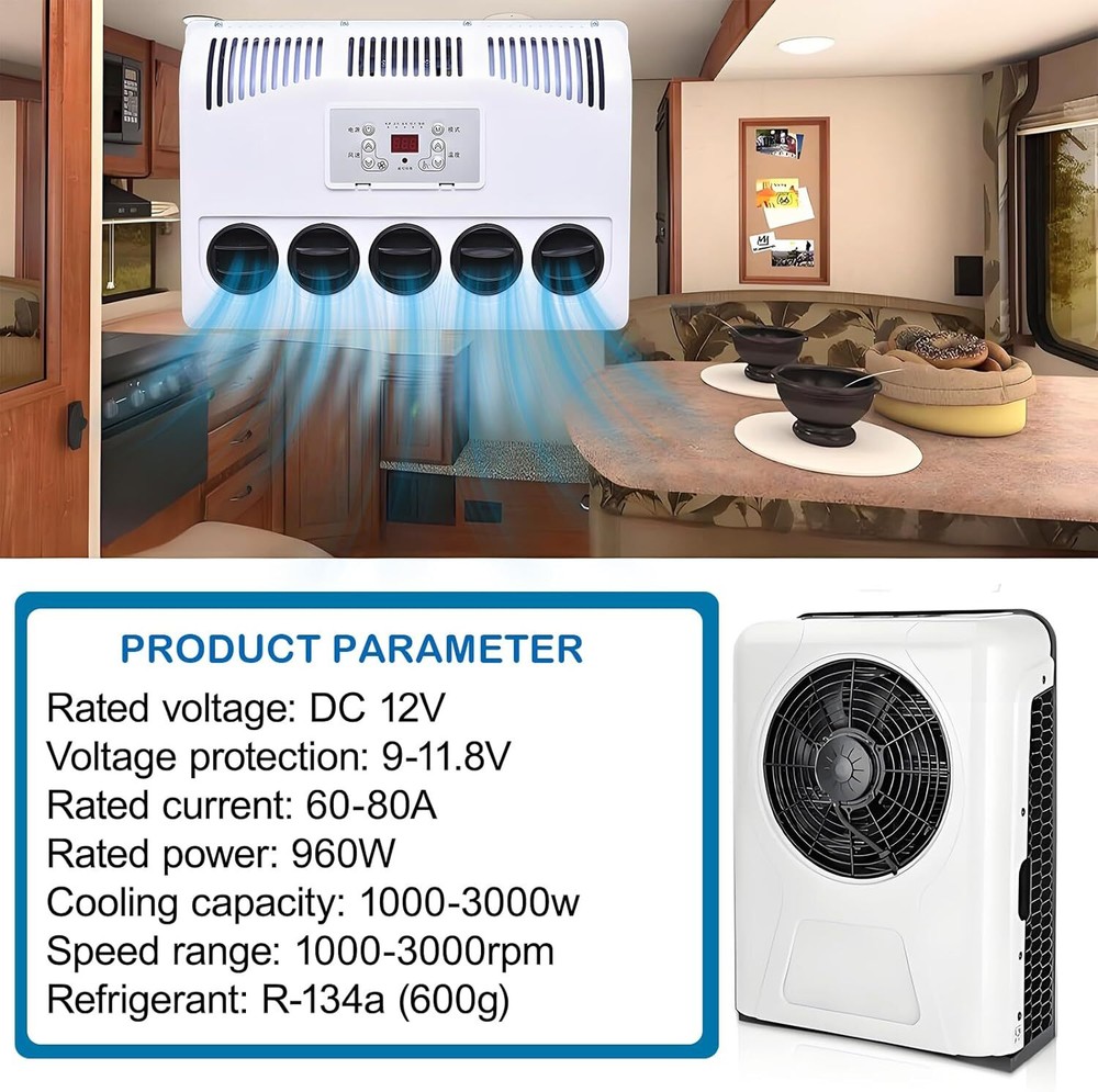 Store Categories Store Categories Other 12V Split 12000 BTU Truck Cab Air Conditioner AC Fits Semi Trucks RV Caravan Bus Product Description Specification: BRAND TREELIGO Color White Voltage (V) 12V Current (A) 60-80A Power (W) 960W Air Volume 600m³/h Rated Cooling Capacity (W) 1000-3000W Refrigerant HFC134a (Not Included) Refrigerant Charge (g) 600 (Not Included) Refrigerating Oil POE68 (Included) Range of Speed 1000-3000 Internal Machine size External M achine size 455*335*165mm(17.1*13.1*6.5in) 660*500 * 210mm(25.9*19.7*8.3in) Features: 【Parking air conditioning】 This electric air conditioner is operated by a battery (generator). You can still use the air conditioner even when the engine is off. Low noise, energy saving and environmental protection is your best choice. It will help you save a significant amount of fuel costs every year. Energy conservation, economy, environmental protection, and pollution-free. 【Air conditioning parameters】 Voltage: 12V. Power: 750W. Startup current needs 75A. Cooling capacity: 8875BUT. Add R134a/600g. The outdoor unit can be installed vertically behind the front of the car. 【Variable frequency com pressor】 A 12V DC compressor is safer and quieter than a high-voltage compressor running with an inverter. Variable frequency air conditioning will monitor the condition of the battery and operate accordingly, thereby reducing energy consumption. 【D C Power 】 The DC electric air conditioner uses a high-efficiency electric scroll compressor and is powered by the vehicle battery. It keeps your cab cool even when the engine is off. 【Applicable models fo r】 trucks, Camping vehicle, vans, excavators, passenger cars, agricultural vehicles, engineering vehicles, ships, RV air conditioning. Package Included: 1*Air Conditioner(Excluding adapters) Outdoor unit The outdoor unit adopts an integrated electric compressor, which greatly improves the refrigeration efficiency of the air conditioner and reduces the failure rate of the air conditioner. Compared with the traditional old-fashioned compressor, the integrated compressor has been greatly improved. Indoor unit The indoor unit adopts an intelligent numerical panel. When the air conditioner fails, you can see the fault code of the panel to confirm where the fault is. Matters Needing Attention: 1. The starting current of 12V air conditioner shall reach 80A. Before purchasing, please confirm whether the battery meets the requirements. 2. Before adding refrigerant, vacuum treatment (15-20 minutes) is required, and then add refrigerant. 3. There is no refrigerant inside the air conditioner, so R134a/600g should be added. Pressure gauge value: low pressure 35psi, high pressure 140-180psi. Installation Steps 1. Install the external machine : remove the casing, mark the drilling position, use an 8mm drill to drill holes, use a riveting tool to fix the rivet nut at the drilling point, install shock pads and sleeves at the holes of the external machine, and fix the external machine to the car . 2. Install the expansion valve: remove the iron sheet at the position of the expansion valve of the evaporator, and fix the expansion valve to the evaporator. The two black screws correspond to the two holes, so there is no need to worry about wrong installation. Then wrap it in black cotton wrap. 3. Install the indoor unit: first install the wooden board to the indoor wall, and then install the evaporator on the wooden board. 4. Install high and low pressure pipelines: first open a (50mm) hole in the car, and then install the rubber cover with three holes. The thick pipe is the low pressure pipe and is connected to the compressor. The thin tube is a high pressure tube and is connected to the condenser. Then connect the other end of the high and low pressure pipes to the holes corresponding to the expansion valve of the indoor unit, use long black screws and iron sheets to clamp the aluminum joints, and tighten the screws. 5. Install the connection line: connect the connection lines of the internal and external units, plug the power cord plugs into each other, and connect the drain pipe of the evaporator. 6. Vacuuming/Adding refrigerant: It needs to be vacuumed for 15-20 minutes, and then add refrigerant R134a/600g. The refrigerant can be added according to the pressure value. Generally, after the R134a refrigerant is injected into the air conditioning system, the pressure at the low pressure port is 35psi, and the pressure at the high pressure port is 140-180psi. 7. Connect the power cord: Connect the power cord to the battery, pay attention to the positive and negative poles of the battery, do not connect them wrongly, + positive / - negative. It is forbidden to connect it to the power-off switch and the power switch. 8. Turn on the air conditioner: Drive the air conditioner to see if it works properly. If the current is insufficient, the refrigerant is too much or not enough, the control panel will display a code, which can quickly troubleshoot. The Main Reasons Affecting The Cooling Effect 1. After installation, be sure to measure the high and low pressure, and controlthe high pressure at about 14Kg (ambient temperature)At about 32'℃ ), it is best to control it below 14Kg when testing indoors or atnight, otherwise, the pressure will rise very high when the temperature is high,which will make the refrigerant temperature too high and affect therefrigeration effect. 2. Be sure to use genuine R134a refrigerant lt is recommended to use Juhua,sanmei and Jin long regular products. 3. Use genuine R134a hose, otherwise the refrigerant and refrigerant oil willdeteriorate. 4. The wiring should be thick The line from the battery to the compressor canuse 10 square lines below 2 meters, 2-5,use 16 square lines for meters Use25 square lines over 5 meters Should be collected between multiple batteriesuse 16 square lines10 square lines are used between the additional generatorand the battery(Note: because of the large curent 