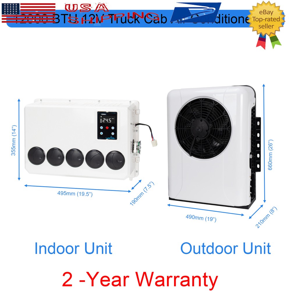 12000 BTU 12V Truck Cab Air Conditioner Split A/C For Semi Trucks Bus RV Caravan Specification: Type: Split AC Air Conditioner Cooling capacity: 12000 BTU Certification: ISO/CE Controller Type: Remote Control Volt: 12V Current: 60-80A Rated Power: 960W Refrigerant: R134A (600g) Cooling capacity: 1000W-3000W (3400-10238BTU) Oil: 90ml-120ml POE68 Noise: 70db Function: Air Cooling Material: Aluminum,Metal,Steel Mounting Style: Screw-On Outdoor Unit Size:L:660 * W:490 * H:210 (Mm) / L:26 X W:19 X H:8 - Inches Indoor Unit Size:L:495 * W:355 * H:190 (Mm) / L:19.5 X W:14 X H:7.5 - Inches Control Method: Intelligent Drive Drive Mode: Independent OE/OEM Part Number: Semi Truck air conditioner 12V, 12V air conditioner, 12V Truck air conditioner Features: High Quality, Durable, Easy Installation, Low Noise, Energy Saving, Environmental Protection, Fast Cooling, 100% Leak Tested Fitment: Universal Item Included: 1Set Electric Air Conditioner Features: 【12V air conditioner parameters】: 12v air conditioner Rated voltage: 12V, rated current: 60-80A, power: 960W, cooling capacity: 1000W-3000W, inner unit size: L:495 * W:355 * H:190 (Mm) / L:19.5 X W:14 X H:7.5 - Inches, outer unit size: L:660 * W:490 * H:210 (Mm) / L:26 X W:19 X H:8 - Inches, please You carefully compare whether the parameters meet your needs. 【Energy saving】: This RV air conditioner has a large layout freedom, and the inner unit is small in size. It can be installed according to your needs. The air conditioner can be turned on after parking, does not consume gasoline, and has low noise. When you are parking or waiting, use 480 AH car battery, can be used for 6-8 hours, does not require fuel to drive at all, saves a lot of fuel costs, and can still enjoy a comfortable, quiet and cool environment in hot summer. 【Wide range of applications】: Our 12V air conditioner is suitable for all kinds of models, RVs, heavy trucks, light trucks, engineering vehicles, forklifts, cranes, oil to electricity, etc. All vehicles are suitable for installing our 12V air conditioner, in the hot summer Provide you with an environment that is both environmentally friendly and economical and cool and comfortable. 【High quality material】: This truck air conditioner has a beautiful appearance and is made of high-quality steel plate, which is strong and durable, and this DC electric air conditioner adopts a high-efficiency electric scroll compressor, which is anti-vibration, high energy efficiency, low noise, and can keep cool even when the engine is off. 【Quality Assurance】: Our Parking air conditioner are of high quality. Helps drivers get enough rest and improves road safety, We include installation instructions, If you have any questions during installation and use, you can contact us at any time, and we will provide solutions and solutions that satisfy you. Package Include: 1 Set Air Conditioner Note: The Actual Color Of The Product May Differ Slightly From The Color Displayed On Our Website. This May Be Due To Factors Such As The Angle Of Product Photography, Lighting, And Display Settings.