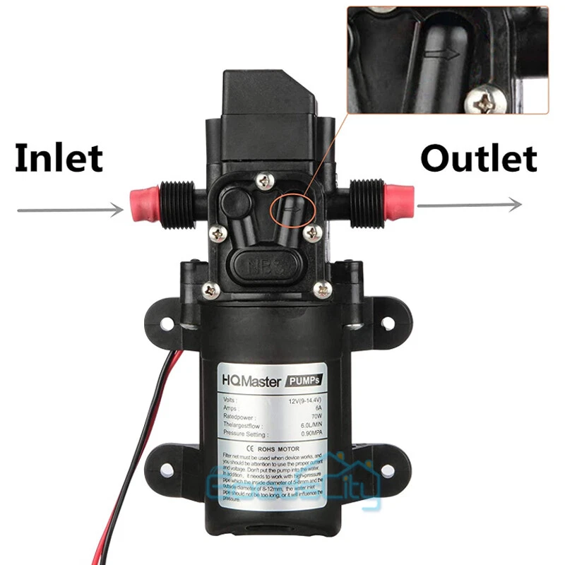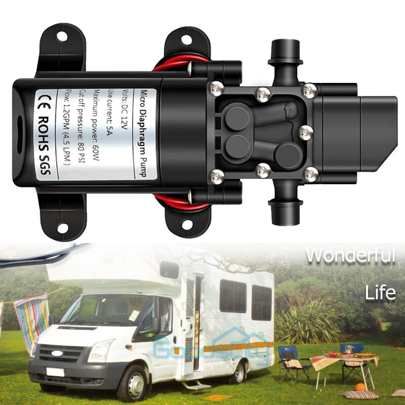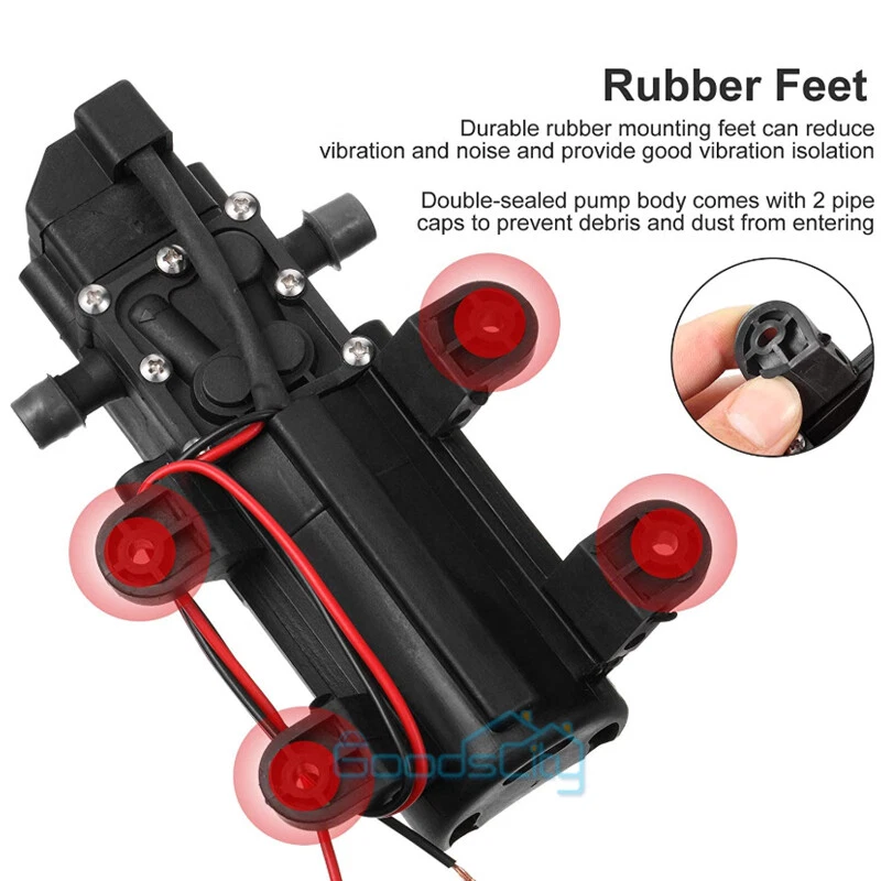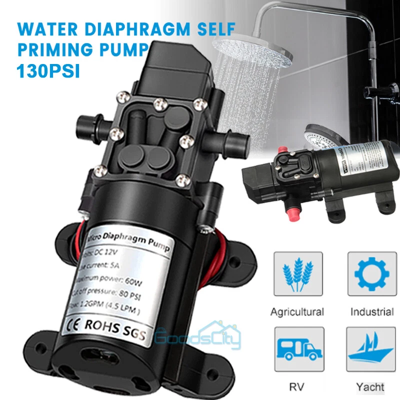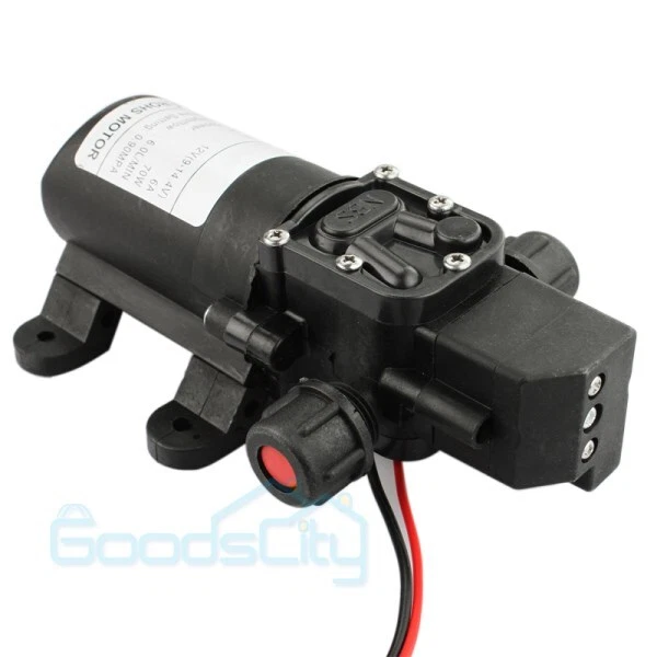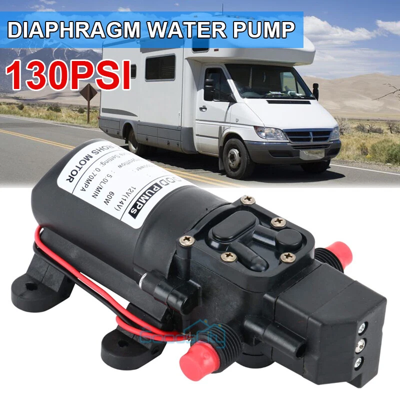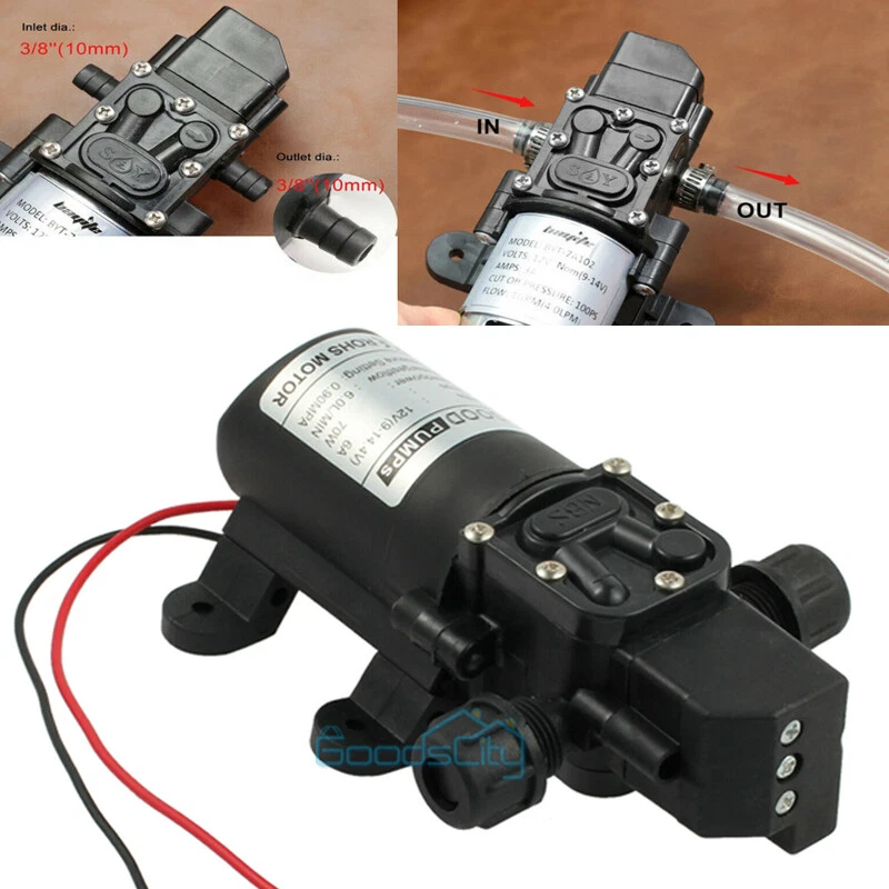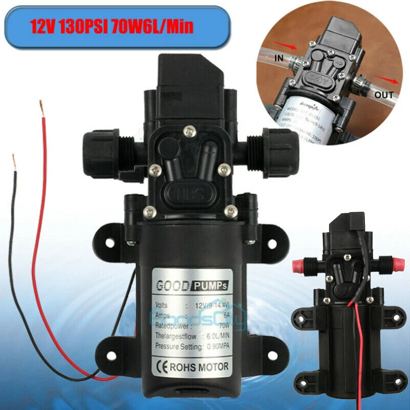 12V 130PSI Water Pump Pressure Diaphragm Self Priming Pump for RV Boat Caravan Ship within 24 hours. 100% New & Excellent Quality Strictly QC, Each item was fully checked before shipping FREE & FAST Shipping delivery with Tracking Number This 12 volt DC diaphragm self-priming sprayer is a multi-purpose water pump, can be used for Garden and sprinklers, showers, water taps in the boat, caravan, travel trailers, RV or home motor. It is great for a Caravan, Camper, RV, Boat, Marine, Home Garden and Camping. Description: Easy to install. Runs dry without system. Easy connecting system. Totally sealed, high stable pressure. Self priming, silent running, low power consumption. Motor duty cycle will vary with load and ambient temperature. Applications: Car washing machine, the solar energy water, remote control water equipment, some place need to control the switch frequently, somewhere energy saving, etc. Note: This item has built-in test water pressure switch. Water pressure is generally adjusted by the size of the nozzle flow. The adjustable range is 0 to 0.9 mpa. In front of the pump head, there are two lines, which can connect a micro switch to control the water pressure. You need to install this switch by yourself according to your requirements. Connected water inlet pipe length: on the ground 3.5 meters, height 2 meters. This has much to do with your operation. Specification: V olts: DC12V Current:6A Power (max): 70W Pressure(max):9KG Input water pressure: 0.2Mpa Max Output water pressure: 0.9Mpa Pressure setting: 130PSI Largest Flow: 6L/min Protection Valve Type: intelligent valve (with Pressure switch) The absorption process: 2.5 meters Pump Head: 20-30m Rotational Speed: 4500r/min Material: ABS Color: Black Drive Method: Electric Pump shaft position: Horizontal Impeller structure: Seal type Impeller amount: Single Impeller suction way: Single Performance: High Pressure Pumped Medium: Clean Water Inlet and outlet size: pipe thread 10mm / straight insert 10mm Dimension: 16.5cm(L) x 9.6cm(W) x 6cm(H) Range of application: Spraying, washing, raised pressure, spray insecticide etc Package including: 1 x Diaphragm Water Self Priming Pump Return Delivery details Payment FAQ's Contact us Return If you found that the item was damaged when you get it, pls contact us firstly Delivery details We Ship to Payment address ONLY. Payment PayPal accepted. FAQ's None Contact us Welcome to contact us for any question.