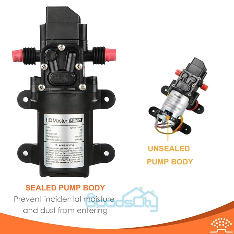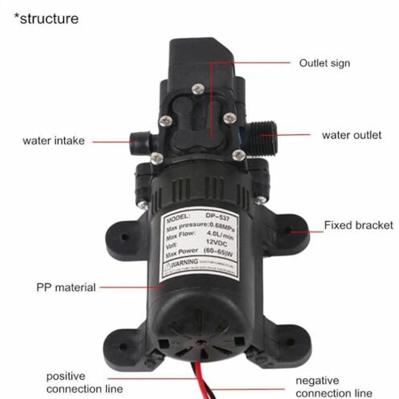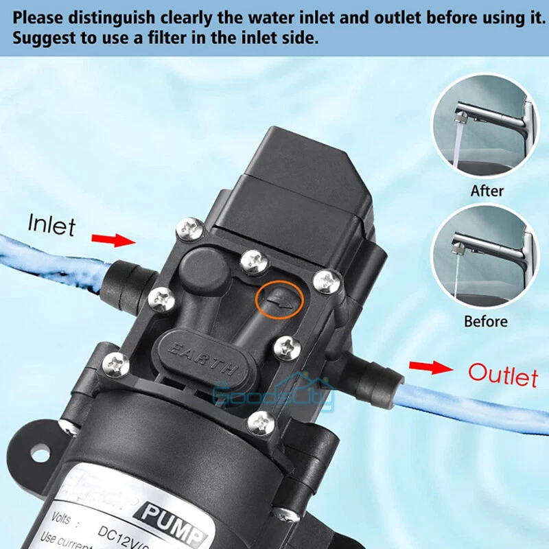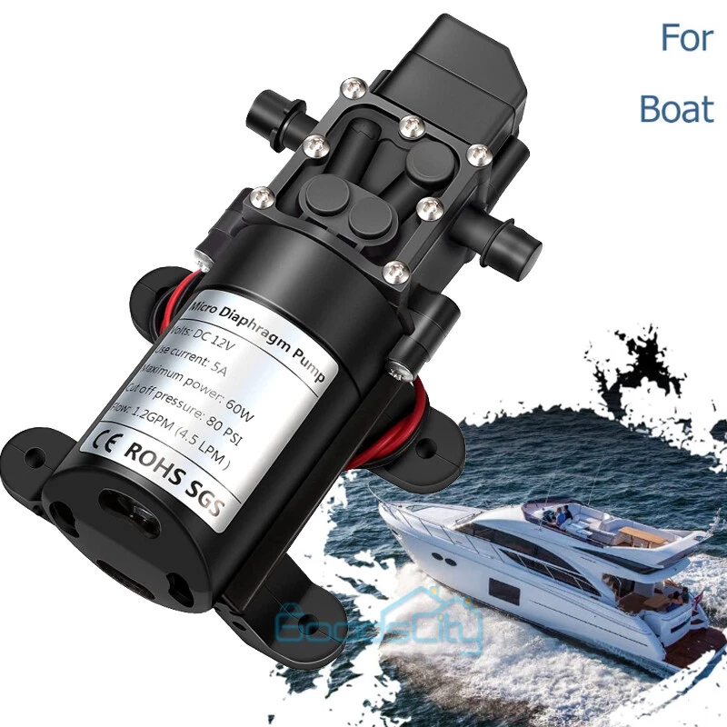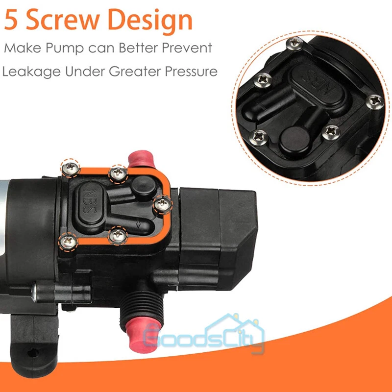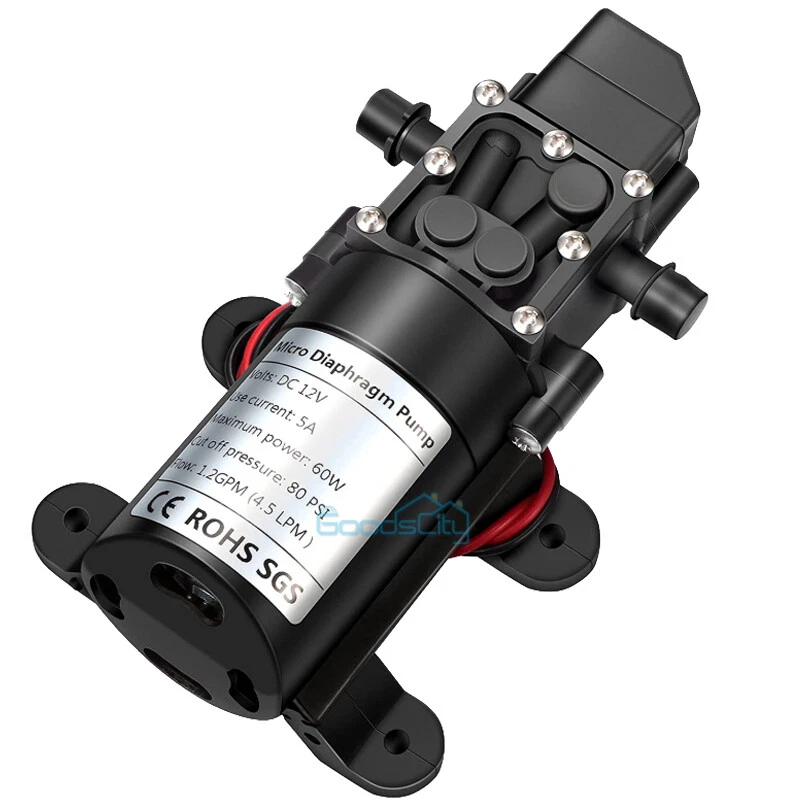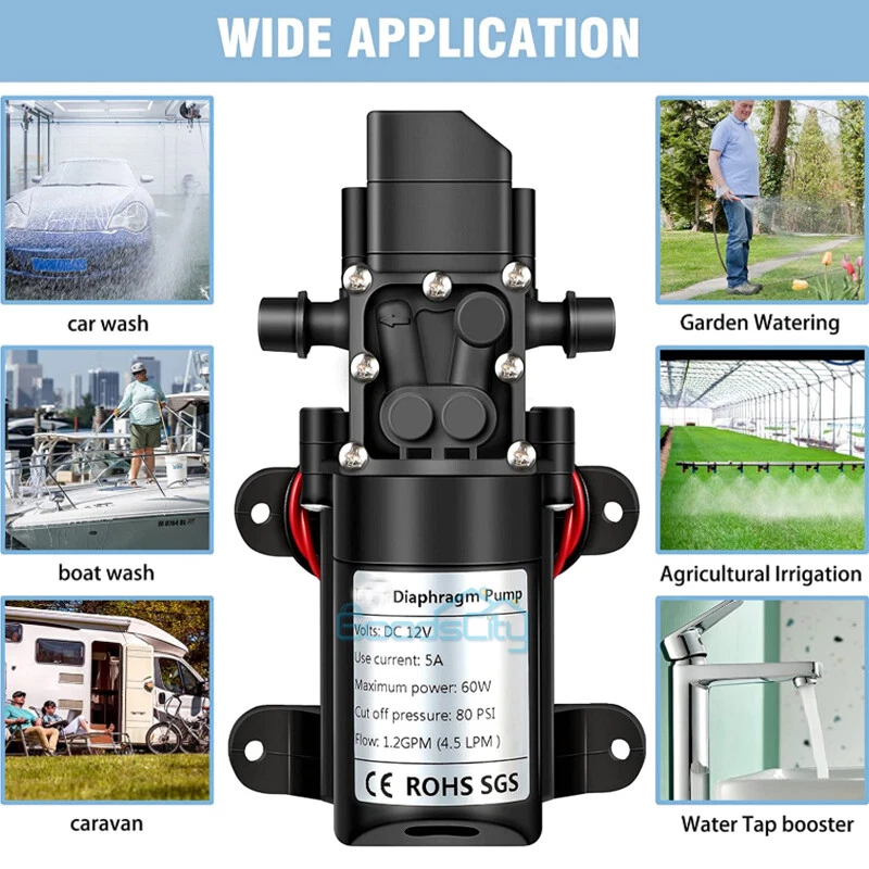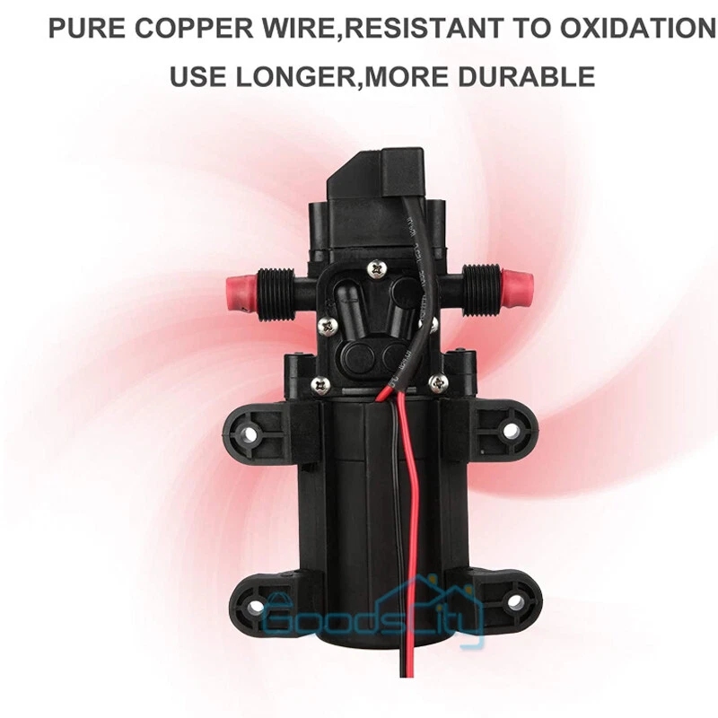 12V 130PSI Water Pump Pressure Diaphragm Self Priming Pump for RV Boat Caravan Ship within 24 hours. 100% New & Excellent Quality Strictly QC, Each item was fully checked before shipping FREE & FAST Shipping delivery with Tracking Number This 12 volt DC diaphragm self-priming sprayer is a multi-purpose water pump, can be used for Garden and sprinklers, showers, water taps in the boat, caravan, travel trailers, RV or home motor. It is great for a Caravan, Camper, RV, Boat, Marine, Home Garden and Camping. Description: Easy to install. Runs dry without system. Easy connecting system. Totally sealed, high stable pressure. Self priming, silent running, low power consumption. Motor duty cycle will vary with load and ambient temperature. Applications: Car washing machine, the solar energy water, remote control water equipment, some place need to control the switch frequently, somewhere energy saving, etc. Note: This item has built-in test water pressure switch. Water pressure is generally adjusted by the size of the nozzle flow. The adjustable range is 0 to 0.9 mpa. In front of the pump head, there are two lines, which can connect a micro switch to control the water pressure. You need to install this switch by yourself according to your requirements. Connected water inlet pipe length: on the ground 3.5 meters, height 2 meters. This has much to do with your operation. Specification: V olts: DC12V Current:6A Power (max): 70W Pressure(max):9KG Input water pressure: 0.2Mpa Max Output water pressure: 0.9Mpa Pressure setting: 130PSI Largest Flow: 6L/min Protection Valve Type: intelligent valve (with Pressure switch) The absorption process: 2.5 meters Pump Head: 20-30m Rotational Speed: 4500r/min Material: ABS Color: Black Drive Method: Electric Pump shaft position: Horizontal Impeller structure: Seal type Impeller amount: Single Impeller suction way: Single Performance: High Pressure Pumped Medium: Clean Water Inlet and outlet size: pipe thread 10mm / straight insert 10mm Dimension: 16.5cm(L) x 9.6cm(W) x 6cm(H) Range of application: Spraying, washing, raised pressure, spray insecticide etc Package including: 1 x Diaphragm Water Self Priming Pump Return Delivery details Payment FAQ's Contact us Return If you found that the item was damaged when you get it, pls contact us firstly Delivery details We Ship to Payment address ONLY. Payment PayPal accepted. FAQ's None Contact us Welcome to contact us for any question.