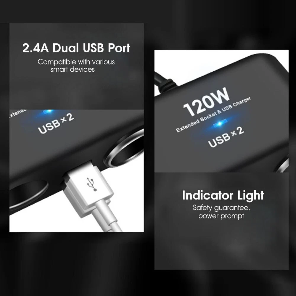 Feature: ● 100% Brand New and High Quality ● Runs Multiple Accessories At The Same Time, Very Convenient, Easy to Use & Fashionable Design ● Universally Fits for Most DC12-24V Vehicles, Cars, SUVs, Motorcycles, Boats, Marine, etc. ● Multi-functional Product, Perfect for Travel ● Equipped with Cigarette Lighter Plug, Real Extension Lighter Kit ● A Fuse is Included with the Product ● DC12V/24V Using Only Specifications: ● Indicator Colour: Blue ● Material: ABS+PC ● 4 Cigarette Lighter Output: DC12V/24V ● Total Output Power: 120W ● USB Port: 2 ● USB Output: DC 5V / 1.2 ● Working Temperature : About.-10℃~ +65℃ ● Cable Length: Approx.68cm Compatible With: ● USB Charged Mobile Phones or Other Electronic Products Package Included: ● 1 x 4 Ports Dual USB Car Cigarette Note: 1.The real color of the item may be slightly different from the pictures shown on website caused by many factors such as brightness of your monitor and light brightness. 2.Please allow slight manual measurement deviation for the data.