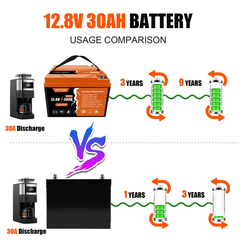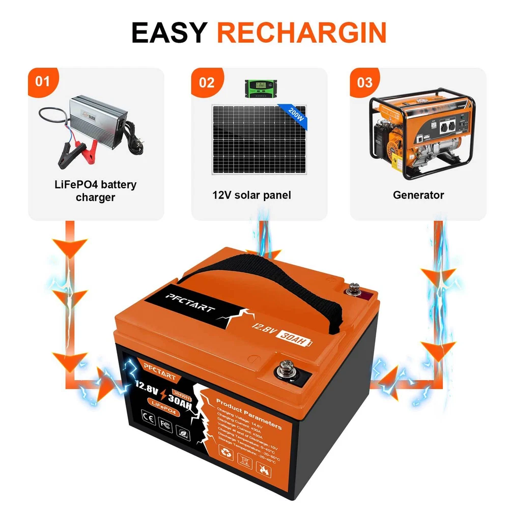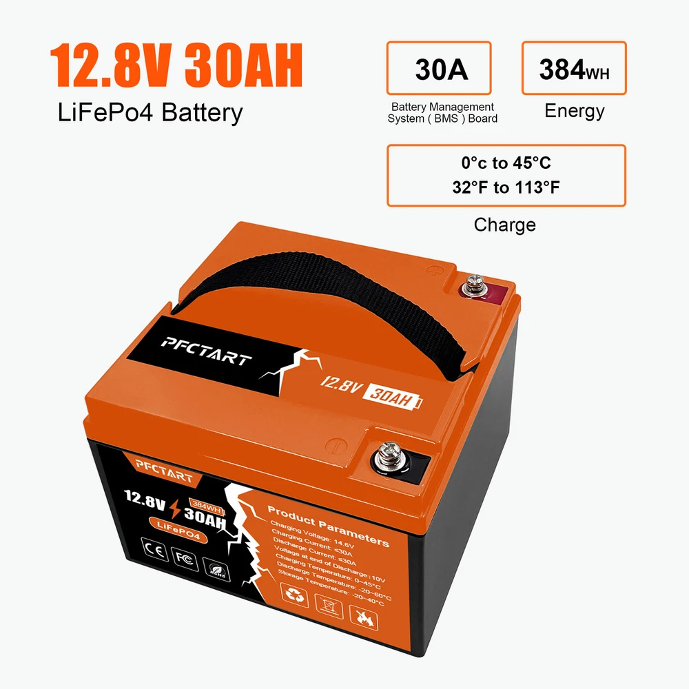 12V 100Ah Deep Cycle Litime LiFePO4 Lithium Battery for RV Solar Off-grid Motor 249.99 USD Free shipping 100AH 12.8V Deep Cycle Lithium Battery LiFePO4 for Boat Home Campers Off-Grid 285.79 USD Free shipping PFCTART 1280Wh 12V 100Ah LiFePO4 Battery Built-in BMS Rechargeable For Home RV 285.99 USD Free shipping 30Ah LiFePO4 Lithium Battery 4500+ Deep Cycles for Golf cart RV Boat Solar Panel 223.99 USD Free shipping 12V Lithium Battery 100Ah LiFePO4 Deep Cycle for Solar RV Marine Home Off-grid 285.99 USD Free shipping 1280Wh 12.8V 100Ah LiFePO4 Lithium Battery Built-in BMS For RV Off-Grid Solar 269.99 USD Free shipping 12V 100AH LiFePO4 Lithium Battery Rechargeable BMS for RV Solar Trolling Motor 285.98 USD Free shipping 200Ah 12.8V Deep Cycle LiFePO4 Lithium Battery BMS for RV Home Marine Garden US 519.99 USD Free shipping 12.8V 50Ah LiFePO4 Deep Cycle Lithium Battery 640Wh for RV Solar System Marine 179.79 USD Free shipping 12V Lifepo4 Cell 100Ah LiFePO4 Lithium Deep Cycle Battery for RV Solar System US 309.29 USD Free shipping NEW 12V 150Ah LiFePO4 Deep Cycle Lithium Rechargeable Battery RV Solar System 359.99 USD Free shipping 200Ah LiFePO4 Cell Lithium Battery 12V Rechargeable w/BMS For RV Homer Boat NEW 519.99 USD Free shipping NEW-00021 12V 30Ah Deep Cycle LiFePO4 Lithium Battery 30A BMS for Golf Car Trolling Motor PRODUCT DESCRIPTION Features 【Automotive Grade Lithium Battery】 PFCTART lithium iron batteries have exceptional quality since they are manufactured by Automotive Grade LiFePO4 Cells with higher energy density, more stable performance & greater power. Highest-level safety based on UL Testing Certificate for the cell inside the battery.This makes li-iron batteries perfect for solar home, RV, campers,motor homes, off-grid applications. 【10 Years lifetime】PFCTART LiFePO4 battery provides 4500+ cycles, which is more than 10 times to Lead Acid with 300~600 cycles. PFCTART LiFePO4 battery has a 10-year service life, three times longer than the Lead Acid’s 3-year lifetime. 【95%* Efficiency】 PFCTART LiFePO4 battery’s flat discharge curve holds above 12.8V for up to 95%,of its capacity usage, providing astronomical boosts in run-time compared to only 50% in Lead Acid. This product is your best choice for outdoor camping power and indoor easy installation. 【1/3* Lightweight】 PFCTART LiFePO4 Battery weighs only 8.81 lbs for one module, only 1/3* the weight of lead acid batteries, which makes it an easy choice for RVs, Marine and Off-Grid Applications when mounting or mobility is in the consideration. 【100% Protection】 PFCTART LiFePO4 battery has built-in BMS (Battery Management System) to protect it from overcharge, over-discharge, over-current, and short circuit with excellent self-discharge rate. Built-in high-temp cut off prevents charging over 167 °F (75 °C). Without memory effect, no matter what state the battery is, it can be used as soon as it is charged. PFCTART LiFePO4 battery is IP65 level waterproof, which set you free from worrying to install indoors or outdoors. Specifications Battery type: LIFEPO4 MODEL: 30Ah 12.8V(4S5P) Rated capacity: 30Ah(384WH) Normal voltage: 12.8V Discharge termination voltage: 10.0V Charging voltage: 14.6V Internal resistance: ≤180mΩ Single cell: IFR 32700 3.2V 6000mAh Standard charging. Continuous current: 0.2C5A Continuous voltage: 14.6V Cut-off current: 0.01 C Standard discharge: Constant current 0.2C5A end voltage 10.0V Max. charging continuous current: 30A Maximum discharge continuous current: 30A Operating temperature range. Charge: 0~45℃ Discharge: -20~60℃ Product size: 177*167*125mm Weight : 4kg BMS Protection Cell overcharge detection voltage:3.90V±50mV Cell overcharge recovery voltage:3.80V±100mV Cell over-discharge detection voltage:2.00V±100mV Cell over-discharge recovery voltage:2.50V±100mV Rated operational charge current:30A Over current detection:60±5A PCM impedance:≤50mΩ Note It does not have series/parallel protocol, please do not use it for multiple series or parallel installations. About Us Payment Shipping Returns Contact Us Welcome to our store, your support is the biggest driving force for us to move forward. Our main business is solar street lights, solar controllers, solar panels and so on. The product is directly connected with the factory to ensure product quality. Please rest assured to buy, we will provide you with a perfect shopping experience! We accept payment via Paypal only. Payment must be completed within 10 days. If you have any problems about payment, please contact us via ebay message. We only ship to confirmed Paypal addresses. Please comfirm that your paypal address is in line with your shipping address. Please kindly note that the combined shipping is not provided because the shipping fee is calculated by weight. Also, the each additional item means exactly the the same color and size. It takes about 7-15 working days to US; about 10-30 working days to other countries. Transit time may be a little delayed because of the bad weather and customs inspection. If you do not receive your item within 30 working days since payment finished, please contact us immediately for further assistance. If you have any issue about Item. Please contact us with 7 days since you receive the item and and return to us within 30 days from the delivery date for exchange or refund. If you need return, please contact our customer service representative, let us know the detailed problem and send us some pictures for confirmation. We strive for 100% customer satisfaction! Positive Feedback is very important to us. If you have any questions, please feel free to contact us via "Ask seller a question" . We will reply your email within 24 working hours. About Us Welcome to our store, your support is the biggest driving force for us to move forward. Our main business is solar street lights, solar controllers, solar panels and so on. The product is directly connected with the factory to ensure produ