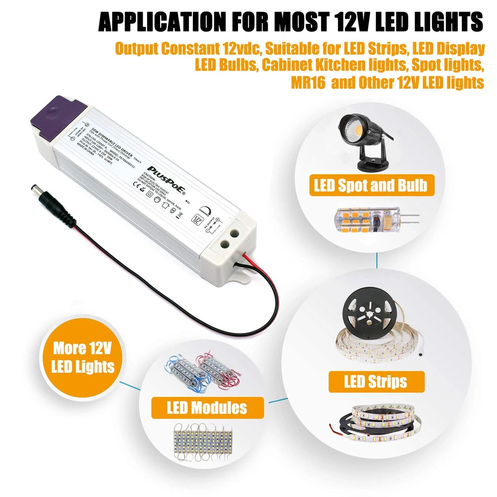 This Dimmable LED transformer is Compact, Quiet, great operating efficency, Well Compatibility, This is an 12V50W Triac dimmable power supply. with most AC wall dimmer like Lutron, Leviton and most other household dimmers. Can be used for many 12v constant voltage LED lights and other applications. Warning: Do not overload. Overload will cause the AC adapter to fail. We are not responsible for misuse of power supply. It is recommended not to exceed the AC power supply's capacity. Please calculate your load before connecting the power. Specification: Output Current: 4.15A ; Output Voltage: 12V Input Voltage: 100V-130V 50/60HZ Size dimension: 195x45x33mm NON-waterproof use for indoor dry location only. Quiet, Smooth, Full range flicker-free dimming for 12 volt LED Lighting such as LED strips, modules, light bars, puck and other LED accent lights with most wall dimmers like Lutron, Leviton, ABB and higher end Lighting control systems, also with 12 volt, low-voltage LED dimmers and Color controllers No minimum Lighting load required for wide range dimming, no de-rating is required; load up to 100% of the model’s 50 watt capacity Easy to Install, Mount, and Wire. Comes with10inch DC cord ( 2.1x5.5mm DC Jack included) can be removed for use in hard wire installations. Short-Circuit / Over Current / Over Voltage/ Low-Voltage and Auto-recovery Mode.