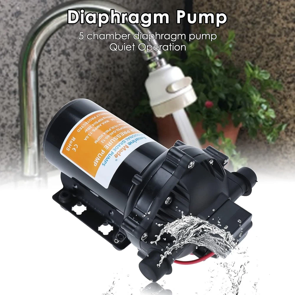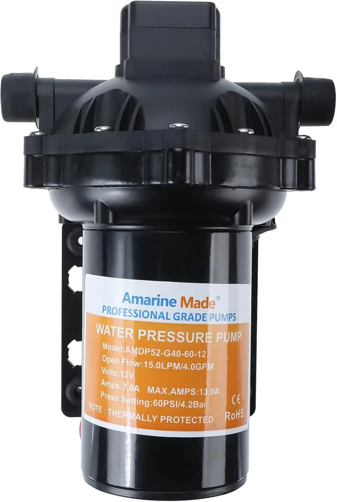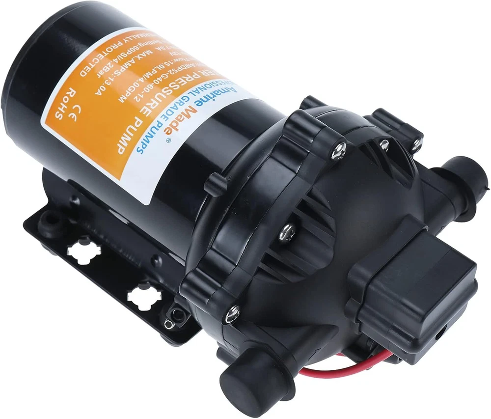About this item The patented design delivers smooth,consistent flow at all ranges of run, while drawing low current. The balanced motor design incorporates precision ball bearings for long life, motor is equipped with an integral thermal breaker. All marine duty pumps have sealed switches and are finished with a Electro Coating to inhibit corrosion. Marine duty fresh water pumps are enclosed to prevent incidental moisture from entering and when installed correctly, Marine Duty Fresh Water Pumps provide years of quiet run. Manufacturer’s Warranty:We will provide a 1-year warranty to replace any defects in our product, 30 days no-hassle refund/return. Functions: a) Motor Voltage: 12V DC b) Max Flow rate: 15.0lpm (4.0gpm) c) Max Pressure: 60psi (4.2bar) d) Protection: pressure switch protection: pressure-off protection or circumfluence switch protection. For the powered control you can choose pump without pressure protection. e) Duty Cycle: Intermittent (under different pressure the continuous working time will also be different) Application: Yacht / RV/Caravan pressurized water system, Sprayer fixtures (Vehicle-mounted sprayers, electric sprayer) Clean machine, Humidifier, Water purification, Medical apparatus Food beverage filling & liquid transfer, Any other pressurization systee Most People Choose 12V 5.0 L/min 1.3 GPM 60W Water Pressure Diaphragm Pump RV Booster Sprayer Pump 19.89 USD Free shipping 12V 60 PSI Water Pressure Diaphragm Pump 15.0 LPM 4.0 GPM Caravan RV Boat Marine 69.99 USD 79.99 USD Free shipping 13% off