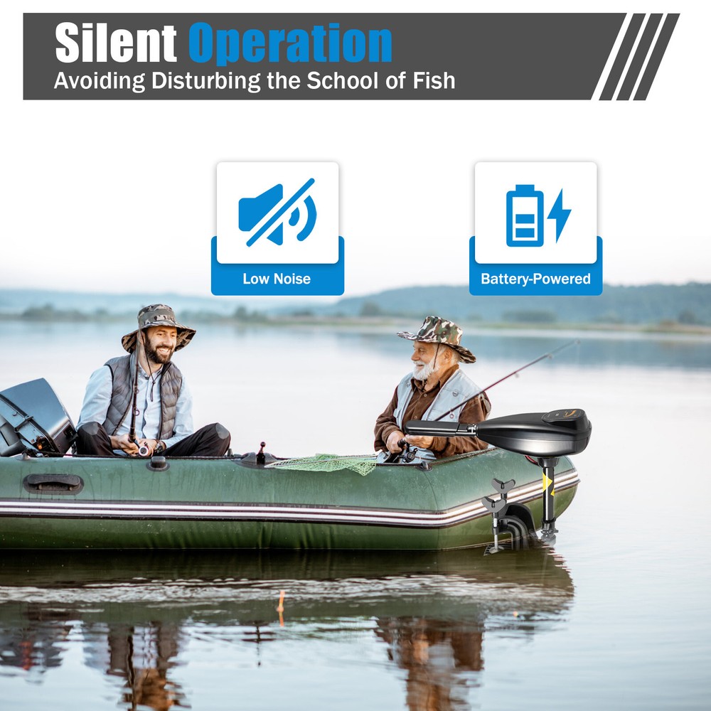 Package Included 1*Electric Outboard Engine 1*Propeller Assembly 1*English Manual All Accessories for Assembly Electric Trolling Outboard Motor 12V 80lbs Brush Fishing Boat Engine Heavy Duty Description Have you encountered any difficulties in venturing into deep water? Does the high fuel consumption, loud noise, and choking exhaust brought by fuel-powered outboard engines make your navigation boring? The more advanced and convenient electric outboard engine can provide you with assistance! The powerful engine enables you to overcome obstacles in various environmental waters and quickly reach the places you need to go at an excellent speed. With its companionship, you can fully enjoy the pleasure of sailing and become a reckless captain! Key Features Multiple Gears: It has 5 forward gears and 3 reverse gears, so you can smoothly switch driving speed and change direction according to the gear during driving. Highly Efficient: This electric outboard engine has 1.2 horsepower and a speed of up to 1900r/min, ensuring high power and high driving speed. Combined with anti-winding three-blade propellers, it greatly enhances work efficiency. Powerful Traction: With its high-quality pure copper motor, it has a powerful traction force of up to 4078 pounds, with a maximum speed of 4.34mi/h (Boat Size 7.54ft, Loading 198lbs, Quiet Water), and can be used by 6 to 8 people. Battery Monitoring: The top screen displays the real-time battery level, making it easy for you to check the battery level at any time and prepare for charging in advance to avoid running out of battery during navigation. Adjustable Design: The height and angle of the suspension bracket can be adjusted to accommodate people driving ships at different heights; In addition the retractable control handle can be selected to the appropriate length (17.71-22in) according to your operating habits. Durable & Sturdy: The main pole is made of high-strength aluminium alloy, and the bracket is made of high-strength nylon with special composite materials. The bracket is equipped with anti-collision devices to prevent motor damage caused by collision forces. Silent Operation: It is battery-powered, which is convenient, simple, environmentally friendly, and has low noise. You can quietly enter the fishing spot without disturbing the school of fish, and easily return with a full load! Guaranteed Customer Service: We aim to provide quality products and services. If you have problems, please feel free to contact us. We will reply and solve the problem for you as soon as possible. Details Anti-slip Handle: The handle adopts an ergonomic design that is easy to grip, while the uneven surface is designed to be anti-slip. Installation Bracket: It has an installation bracket on the main pole, which is used to firmly fix the engine on the ship. Power Wiring: The connecting wires adopt a copper core with guaranteed quality, which is effectively wearable and anti-corrosion. Application It is suitable for kayaks, plastic boats, and other ships with a length of no more than 13.12ft, a width of no more than 4.92ft, and a suitable hull height. Specifications Material: Aluminum Alloy, Nylon, ABS, Copper Color: Black Style: Modern Motor Type: Pure Copper Surface Treatment: Powder Coating Battery Required: Yes (Battery Excluded) Assembly Required: Yes Input Voltage: 12V Power: 800w Horsepower: 1.2HP Suitable Number of People: 6-8 People Speed Regulation: 5 Gears Forward, 3 Gears Reverse Number of Propeller Blades: 3 Idle Speed: 1900r/min Thrust: 36kg/80lbs Traction Force: 1850kg/4078lbs Max. Speed: 7KM/4.34mi/h(Boat Size 2.3m/7.54ft, Loading 90kg/198lbs, Quiet Water) Applicable Water Depth: >1.5m/4.92ft Applicable Ship Width: <1.5m/4.92ft Applicable Ship Length: <4m/13.12ft Gross Weight: 11.15kg/24.58lbs Net Weight: 9.2kg/20.28lbs Propeller Diameter: 20cm/7.87in Main Pole Length: 91cm/35.82in Clamp Bolt Gap: 9cm/3.54in Control Handle Length: 45-56cm/17.71-22in Product Size(L*W): 124*37cm/48.81*14.56in Package Size: 130*49*15.5cm/51.18*19.3*6.1in Package Included 1*Electric Outboard Engine 1*Propeller Assembly 1*English Manual All Accessories for Assembly Notes Please carefully read the instruction manual and strictly follow the precautions and daily maintenance. Please note that this product does not include batteries. During use, please pay close attention to the pushing force and avoid prolonged operation (not exceeding 2 hours per time) or overload operation. When the propeller is entangled or stuck, please immediately turn off the power, otherwise, it will cause the motor to stall, overheat, and burn out. Please ensure that the propeller of the thruster is running smoothly, and completely immerse the motor in water at a depth of 1-1.65ft, with a slope of 15 ° to the ship's side (recommended for use on lakes with a depth of 4.92ft or more). Please pay attention to the positive and negative poles of the wires and battery when using them to avoid short circuits caused by this. If used in saltwater, please clean this product with fresh water. The switch, propeller component, and electric brush are vulnerable parts of this product. Please pay attention to replacement. Please note that in situations of fast water flow, waves, or heavy wind and rain, this product may not be able to function properly. Please make a correct judgment of the weather to avoid unnecessary safety issues. Please allow the slight color difference caused by the shooting light and 1-3cm error due to manual measurement, and make sure you do not mind before you order. Payment Delivery details Terms of sales About us Contact us Payment We accept ebay payment 。 Fees such as import duties, taxes are not included in the item price or shipping costs. These charges are the buyer's responsibility. Delivery details Shipping: 2-9 working days to: USA Terms of sales We maintain high standards of excellence and strive for hundred percent customer satisfaction. Feedback is very important to us. We hope tha