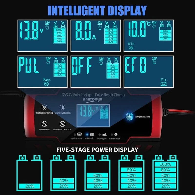 Portable Butane Camping Stove 10000 BTU Lightweight Outdoor Cooking Emergency US 34.59 USD 36.41 USD Free shipping 5% off Portable Dual Fuel Stove Butane Propane 7800 BTUs Auto Ignition Camping Case 51.52 USD 54.23 USD Free shipping 5% off Portable Camping Stove Propane Outdoor Cooking Hiking Backpacking Lightweight US 19.12 USD 20.13 USD Free shipping 5% off Propane Butane Camping Stove 10000 BTU Auto Ignition Portable Gas Burner New 51.52 USD 54.23 USD Free shipping 5% off Portable Butane Camping Stove 7500 BTU Foldable Gas Cooker W/ Carry Bag New 44.16 USD 46.48 USD Free shipping 5% off Dual Fuel Portable Stove 12000 BTU Propane Butane Camping Emergency Cooking Kit 45.63 USD 48.03 USD Free shipping 5% off Portable Camping Stove Lightweight Piezo Ignition Wind Resistant Compact Cooking 10.74 USD 11.3 USD Free shipping 5% off Portable Camping Stove 8871 BTU Windproof Compact Easy Ignition Hiking Picnic US 48.57 USD 51.13 USD Free shipping 5% off 12V 24V Smart Battery Charger Automatic Trickle Maintainer Lead Acid Batteries 42.68 USD 44.93 USD Free shipping 5% off 7.5W Solar Battery Charger Trickle Maintainer 12V Portable Waterproof Panel Kit 47.1 USD 49.58 USD Free shipping 5% off 20V MAX Lithium Battery Charger Compatible W/ 12V 20V Lithium Ion Batteries New 32.37 USD 34.07 USD Free shipping 5% off 4 Bay AA AAA Battery Charger Type C Fast Charging NiMH Li-ion LED Slots New 11.17 USD 11.76 USD Free shipping 5% off About this item All in 1 Lead Acid Battery Chargers, Maintainers and Desulfurizers:12V 8 Amp, 24V 4 Amp quick battery charger, It's smaller but delivers more power. It's the all-in-one solution battery charger, battery maintainer, trickle charger, plus battery desulfator. Charge or repair all 12V and 24V lead-acid automotive, marine, and deep-cycle batteries, including AGM, GEL, SLA, and Flooded in cars, trucks, SUVs, motorcycles, lawnmowers, boats, marine, etc. Efficient Pulse Repair, Battery Rejuvenation:Battery chargers automobile 12 / 24 volt input power: 100-240V. Adopts high-power high-frequency low-frequency pulse technology, which can better eliminate the vulcanization phenomenon of the battery, help restore the lost performance of the old/idle battery, and prolong. NOTE: It can not activate a dead battery or repair a damaged battery, also can't jump-start the car. Visualization Charging: Automatic charging when connected. Temperature will be automatically detected without setting. Automatic charging protects your battery from being overcharged and you can leave the charger indefinitely. LCD screen display makes you can check the charging and battery status, charge voltage, charge current, inside temperature, power display, repair mode, wrong battery connection warning, etc. 8 Charging Protection, Never get stranded again:Top rated car battery charger can be optimized for the climate, and easily handle various over-cooling and over-heating voltage environments. Provide up to 8 items of charging protection, such as reverse polarity, overheating, overcurrent/overvoltage, short circuit protection, etc. Lightweight and Portable, Easy to Operate:12 volt battery charger weighing only 1. 2 lbs, it will automatically stop when it is fully charged, and you do not need to wait during the charging process. , easy to carry and store. The car battery charger mode has a memory function. After charging, it defaults to the state mode used before the last power outage. Brand: Color: Red Product Dimensions: 6. 7"D x 2. 3"W x 3. 9"H Output Voltage: 24 Volts, 12 Volts Specification Met: UL, FCC, RoHS You may also like 47 Inch Gaming Desk Home Office Computer Desk Adjustable Storage Writing Table 102.27 USD Free shipping Compact Computer Desk W/ Monitor Stand Reversible Storage Shelves Gaming Office 98.79 USD 103.99 USD Free shipping 5% off Computer Desk A-Frame Design W/ Hutch Durable Particle Board Home Office New 77.45 USD Free shipping 27oz Ceramic Cereal Bowls Set of 6 Dishwasher Microwave Safe Kitchen Dining New 57.33 USD Free shipping 47 Inch Gaming Desk W/ Monitor Stand Adjustable Storage Modern Office Desk New 90.15 USD 94.89 USD Free shipping 5% off L Shaped Computer Desk W/ Reversible Storage Shelves Home Office Gaming New 117.78 USD Free shipping 48 Inch Computer Desk, Modern Simple Style Desk for Home Office, Writing Desk 85.23 USD Free shipping Small Computer Desk with 2 Drawers for Bedroom, Office Desk Study Writing Table 92.98 USD Free shipping Computer Desk Modern Writing Desk Gaming Desk Easy Assembly Metal Frame US 123.98 USD Free shipping Ceramic Dinnerware Set 12 Pcs Scratch Resistant Microwave Dishwasher Safe New 105.94 USD Free shipping 47 Inch Space Saving Modern Computer Work Desk W/ 4 Drawers Simple Modern New 147.23 USD 154.98 USD Free shipping 5% off 8PCS Stainless Steel Mixing Bowls Set Airtight Lids Grater Non-Slip Bottoms New 51.52 USD 54.23 USD Free shipping 5% off