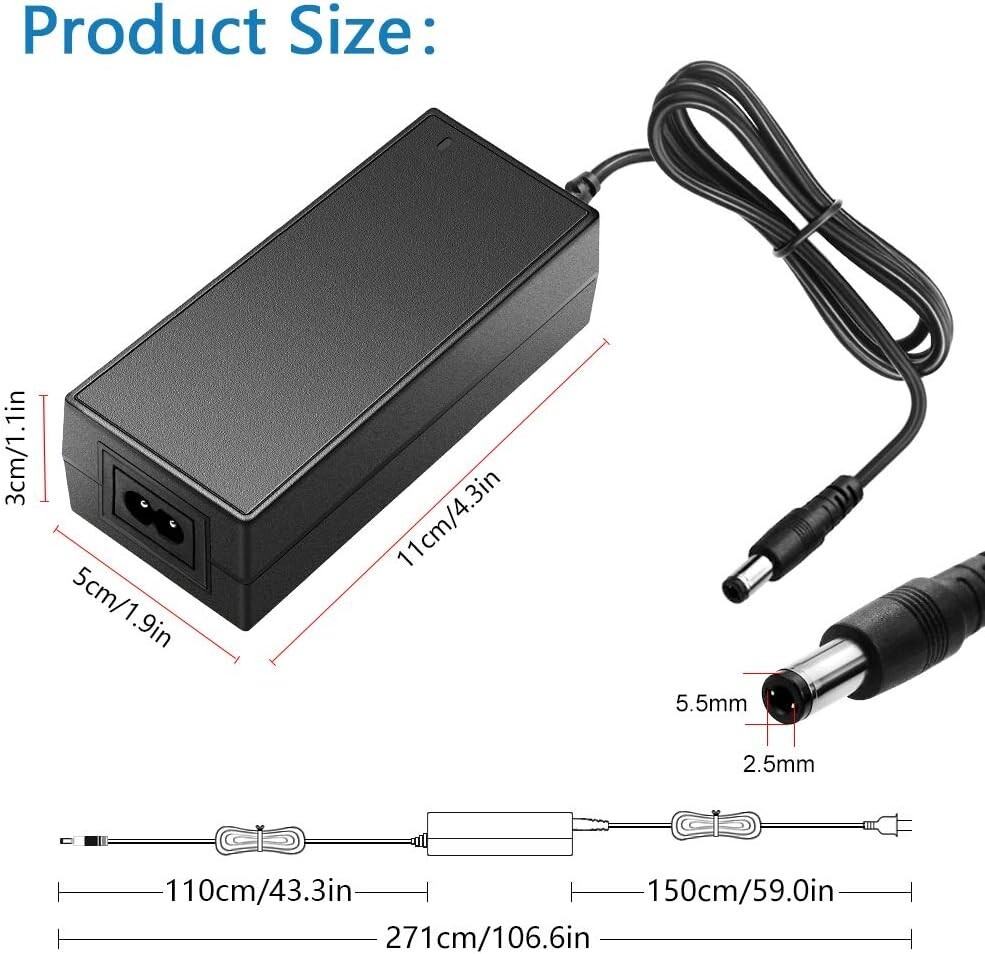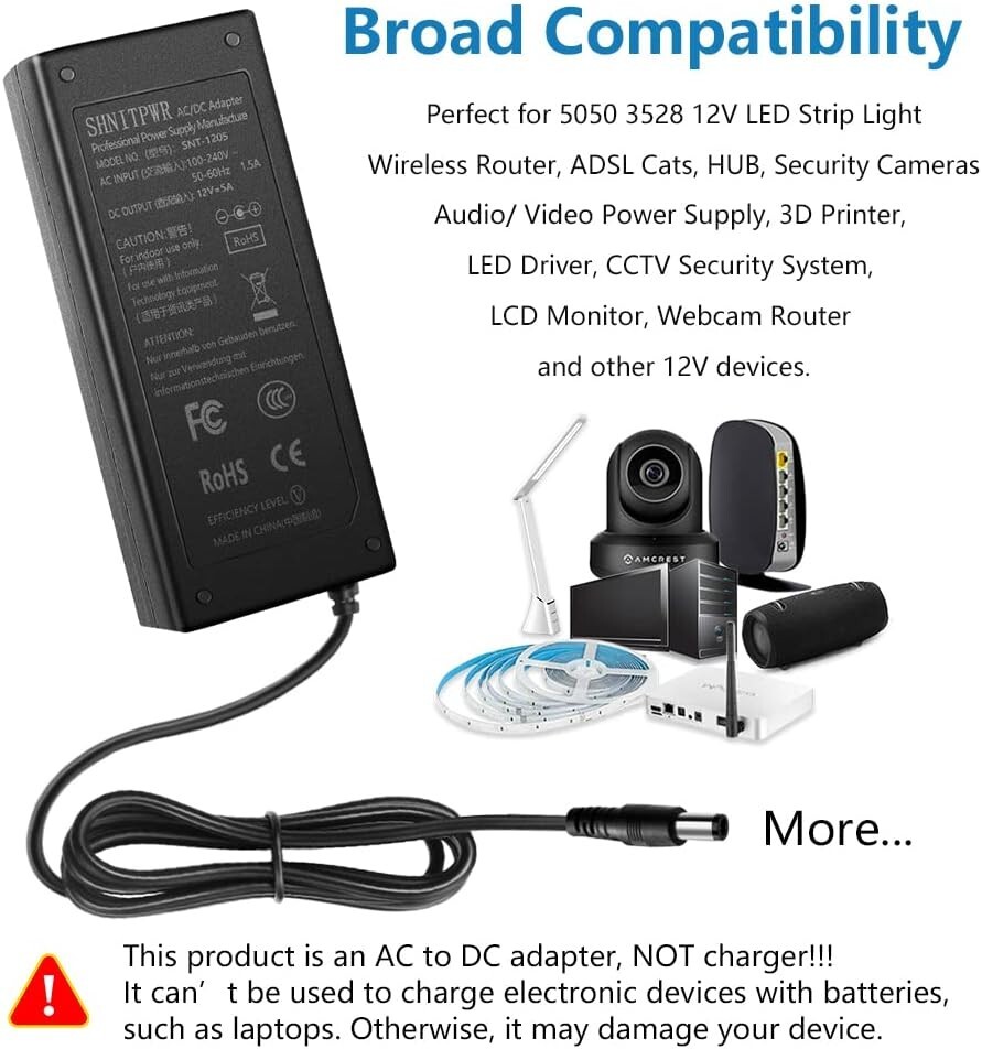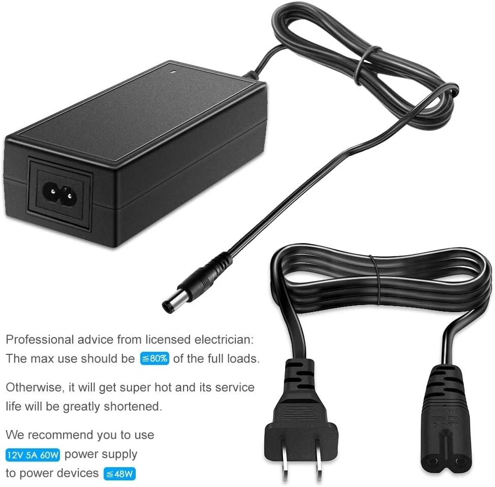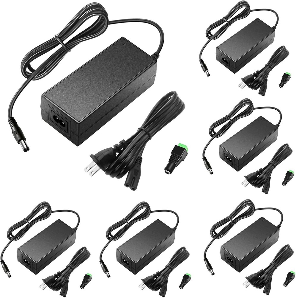 12V DC Power Supply 5A 60W AC/DC Adapter 100~240V AC to DC 12 Volt 5 Amp 4A 3A Converter Transformer LED Driver for 12 Vdc LED Lights CCTV Camera LCD Monitor, 6-Pack Pack of 6. Input: AC 100 - 240V, 50 / 60Hz ; Output: DC 12V, Max 5A, 60W; with x DC plug. In order to meet more requirements, we give away a female DC connector. You can screw wires onto it easily, no soldering required. This will greatly expand its application scope. 12V 5A power adapter can supply with all amperage less than 5A. ---such as 500mA, 800mA, 1A, , 3A, 4A, , 5A. If your device draws then will be supplied. But if draws more than 5A, only 5A will be supplied and power supply will be damaged soon. NEVER OVERLOAD! FCC safety certification. Level VI energy efficiency. Certified by FCC CE RoHS. We focus on high quality and safe power adapters. No noise, no fire hazard, low temperature operation, stable output. Automatic over-voltage cut-off, over-current cut-off, over temperature cut-off, short circuit protection. Compatible: 5050 2835 12V LED strip lights, under cabinet light ,wireless router, ADSL Cats, DVR/NVR security cameras, home WiFi IP Camera, DVD Player, Audio/ Video devices, LCD Monitor, Bluetooth speaker, Sound bar, etc and other 12V devices less than 60W. This product is an AC to DC adapter, NOT charger!!!It can’t be used to charge electronic devices with batteries, such as laptops. Otherwise, it may damage your device. After sales satisfaction: 12 hours response, 30 days SATISFACTION GUARANTEE, 18 s exchange. If you don’t like our product or don't want it, please contact me anytime. We will happily accept the return and give you resolution.