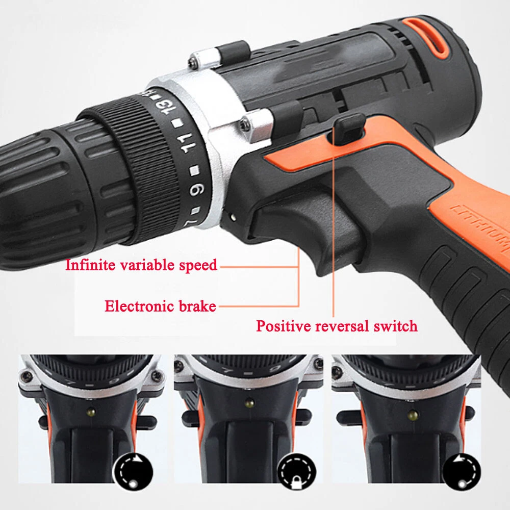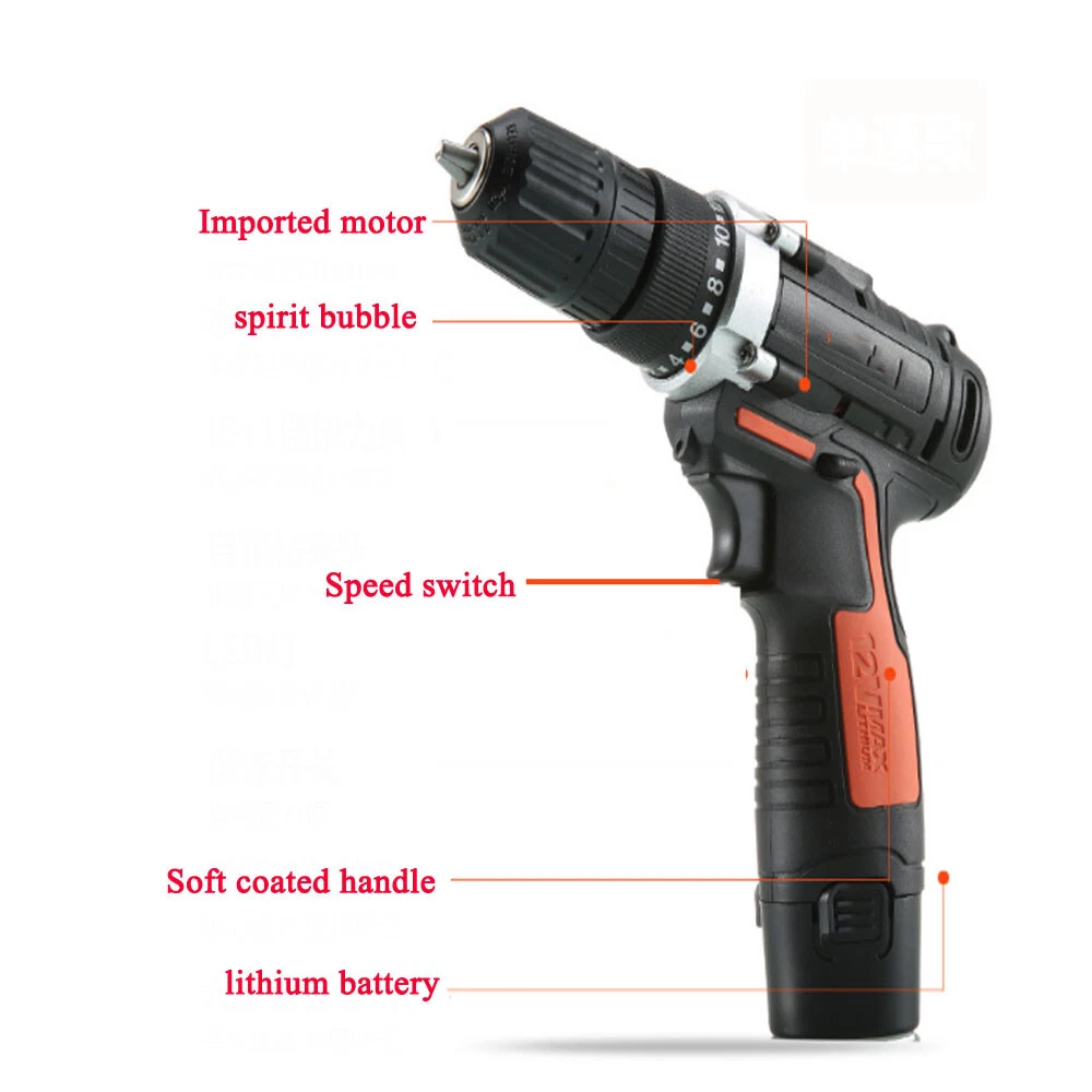 Description: 1. Imported motor technology, strong power, lasting life. Horizontal bubble, flat drilling when convenient alignment is also corrected. 2. 15 + 1 gear torque adjustment to meet different torsion requirements. Self-locking drill collet, reliable accuracy and durability. 3. LED lights, good lighting effect is wide range, working in the dark environment can also be easy to control, and has a low power warning function. Speed control switch, more convenient to control. 4. Fine and soft wrapped adhesive handle, intimate design, comfortable to hold. Large capacity lithium battery pack, lasting life, fast charging. Specifications: 1. Battery voltage: 12V 2. Maximum torque: 32N.m 3. Minimum torque: 20N.m 4. No-load rotation speed: 0-400 r/min / 0-1400 r/min 5. Positive and reverse: have positive and reverse 6. Rated power: 1,000 W Package Included: 1 SET electrical drill 1 * Battery 1 * Charger