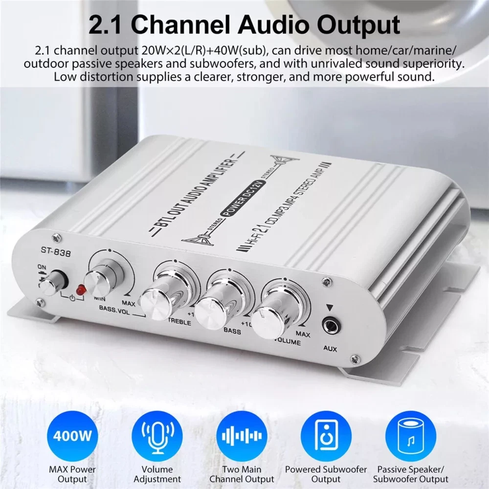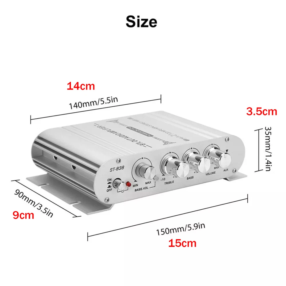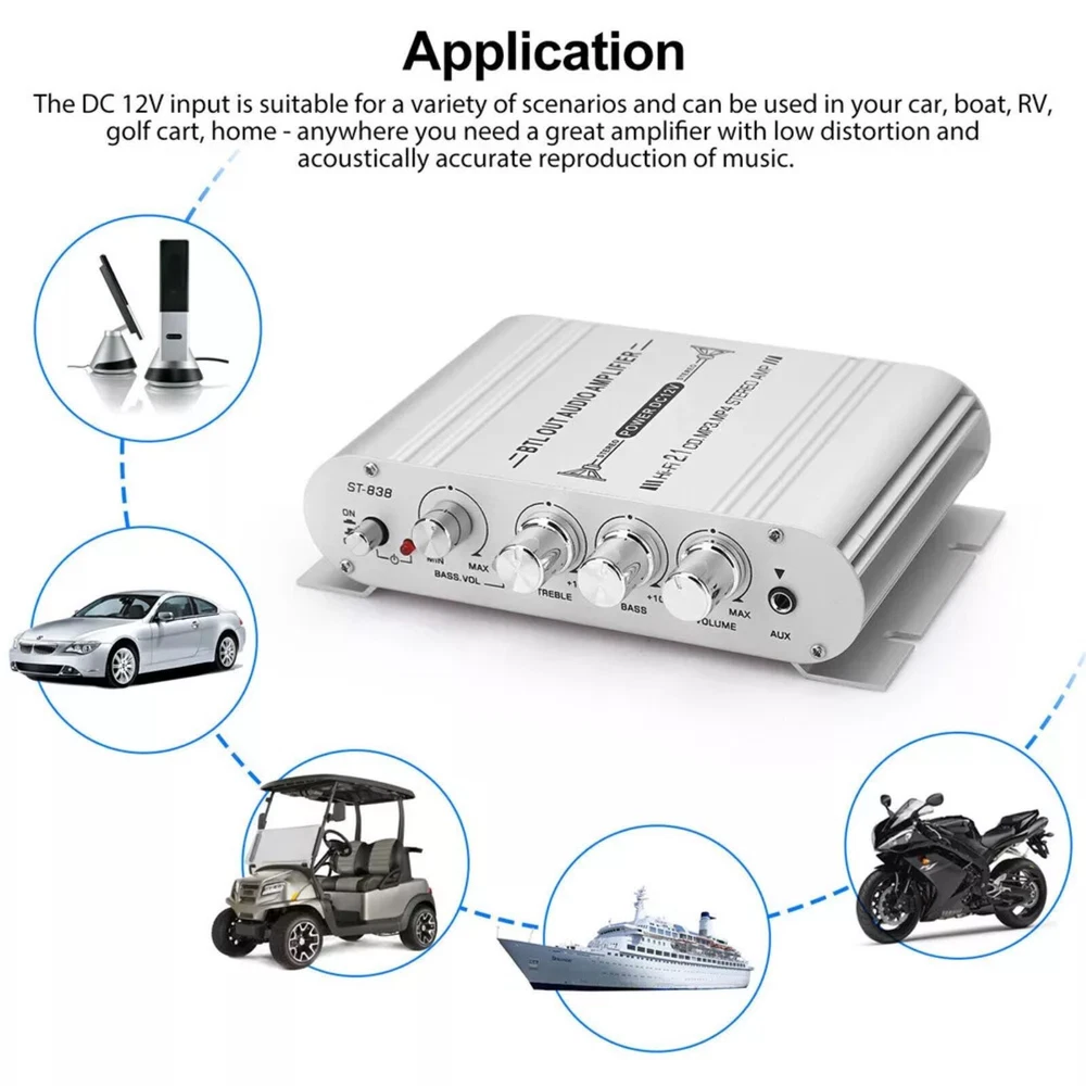 You may also like Round 8 Pin To RJ45 Microphone Adapter Cable for Yaesu FT450D FT897D FT991 FT891 13.88 USD Wireless Charging Receiver Smart Module For Logitech G403/G502/G703/903 G pro 20.39 USD 40db 800MHz-2500MHz RF Coaxial Directional Coupler Power Handling 200W 16.99 USD 10/100/1000M Ethernet to Fiber Optic Media Converter 4 RJ45 & 1 SC fiber Port 39.99 USD New 250Pcs 7 Size Non Insulated Wire Ferrules Kit Red Copper Crimp Connector 13.69 USD 4 in 1 Mobile Phone Repair Opening Tools Kit Screwdriver for iPhone Smart Phone; 12.69 USD Product Description Features: Outstanding 2.1 Channel Audio Output: Boasting a powerful 2.1 channel configuration with 20W×2 (left/right) for the main channels and 40W for the subwoofer, it effortlessly drives a wide range of home, car, marine, and outdoor passive speakers and subwoofers, delivering unparalleled sound quality. The low distortion design ensures a clearer, stronger, and more powerful audio experience. Universal Compatibility with Elegant Design: Equipped with standard stereo RCA and 3.5mm AUX inputs, it seamlessly connects to devices like iPads, mobile phones, MP3 players, CD players, TVs, and computers. In addition to the main volume control, it features dedicated treble, bass, and subwoofer volume adjustments, allowing you to easily enjoy high-quality music tailored to your preferences. Flexible Audio Adjustment: Featuring crisp and responsive buttons for power control and a rotary knob for master volume adjustment, it offers effortless customization to suit your listening needs. Whether it's rocking tunes or soothing melodies, it delivers perfect sound every time. Compact and Stylish: With its compact design and exquisite matte silver casing, it not only looks fashionable and durable but also boasts a unique structure that makes it easy to install in cars, boats, or other tight spaces. It saves valuable space while remaining convenient to operate. Versatile Applications: Suitable for DC 12V input, it's ideal for various scenarios, including cars, boats, RVs, golf carts, and even homes. Wherever you need a great amplifier with low distortion and acoustically accurate music reproduction, this is the perfect choice. Specifications: Model: ST-838 Color: Silver Number of Channels: 2.1 Power Amplifier Type: HIFI Power Amplifier Audio Input: Stereo L/R RCA / 3.5mm AUX Audio Output: Cable Speaker Jacks + Subwoofer Bluetooth: Not Supported Input Voltage: DC 12V/3A (Power supply not included) RMS Power: 20W x 2 + 40W Max Power: 200W + 200W Channel Configuration: 2.1 Power Amplifier, supports connection to 2 speakers and a subwoofer Speaker Impedance: 4-8Ω Frequency Response: 20Hz - 20KHz Distortion: 0.4% Signal-to-Noise Ratio (SNR): 80dB Resolution: 47K Working Voltage: DC 12V Package Included: 1 x Power Amplifier (Power supply not included) Shipping Returns Contact Us Payment 1. Items sent from US warehouse. 2. Receiving time = Processing time + Shipping time. 3. Processing Time: Around 1-2 business Days. 4. Shipping Time: 3-5 business day. It may have a little delay during some holiday (such as Christmas), any problem, please feel free to contact. Always believe we can figure things out with communication, if it comes to return, the pacakge must be intact and the same as you receive. If you have any questions, please feel free to email our service specialists 24 Hours a Day, 7 Days a Week. We will reply you ASAP. Return/refund is accepted within 30 days after the buyer receives the item. NO exchange will be accepted after 30 days from the date when the item is received. Please contact us first before returning your product!!! If you have any questions, our Customer Service staffs welcome you to email us. We strive to answer all questions and resolve any problems as quickly as possible. We care about our valued customers, and will always try to help you. So if you have any problems, You can contact us 7*24, we will reply at the first time. We accept all verified payments from ebay. Orders will be shipped after receiving cleared payment. Shipping 1. Items sent from US warehouse. 2. Receiving time = Processing time + Shipping time. 3. Processing Time: Around 1-2 business Days. 4. Shipping Time: 3-5 business day. It may have a little delay during some holiday (such as Christmas), any problem, please feel free to contact. Returns Always believe we can figure things out with communication, if it comes to return, the pacakge must be intact and the same as you receive. If you have any questions, please feel free to email our service specialists 24 Hours a Day, 7 Days a Week. We will reply you ASAP. Return/refund is accepted within 30 days after the buyer receives the item. NO exchange will be accepted after 30 days from the date when the item is received. Please contact us first before returning your product!!! Contact Us If you have any questions, our Customer Service staffs welcome you to email us. We strive to answer all questions and resolve any problems as quickly as possible. We care about our valued customers, and will always try to help you. So if you have any problems, You can contact us 7*24, we will reply at the first time. Payment We accept all verified payments from ebay. Orders will be shipped after receiving cleared payment. Black Nylon Rain Cover Rain Sleeve Protector Sheld For Canon Nikon DSLR Camera 14.99 USD 17 Min Sound Voice Music Recorder Board Voice Chip Module for Greeting Card DIY 14.39 USD SRH789 Telescopic Antenna SMA Female / Male Connector 95MHz-1100MHz Foldable 15.39 USD 19.99 USD 4 in 1 Mobile Phone Repair Opening Tools Kit Screwdriver for iPhone Smart Phone; 12.69 USD 3.2' USB Charger Cable For COROS PACE2/APEX/APEX Pro/APEX42/VERTIX/VERTIX2 Watch 14.99 USD 3.28ft USB Programming Program Cable+CD For Kenwood Radio TK-380 TK-385 NX-210 13.99 USD 4K 1080P 1x2 HDMI Splitter Screen Repeater Video Distributor Monitor Duplicator 8.99 USD 1* Bluetooth Remote Control Scrolling Ring Mobile Phone Scroller Remote Control 13.99 US