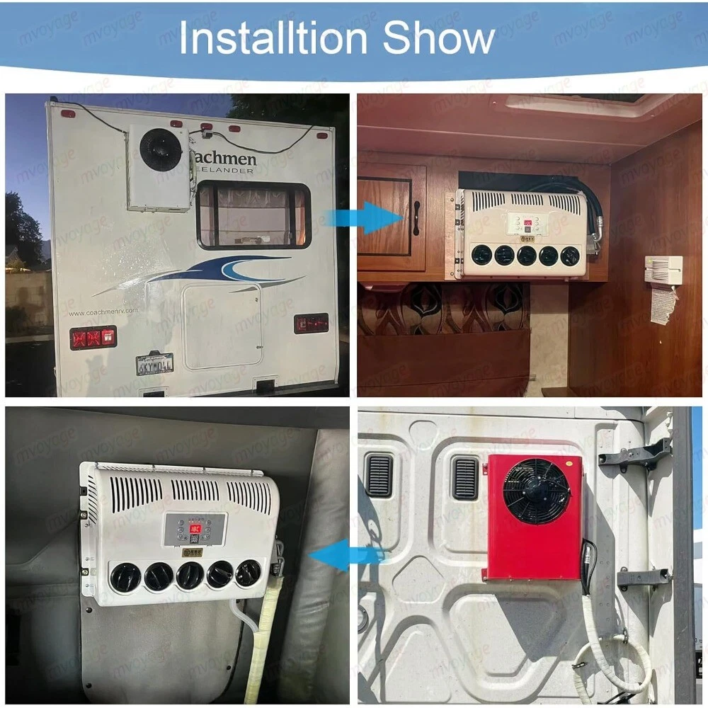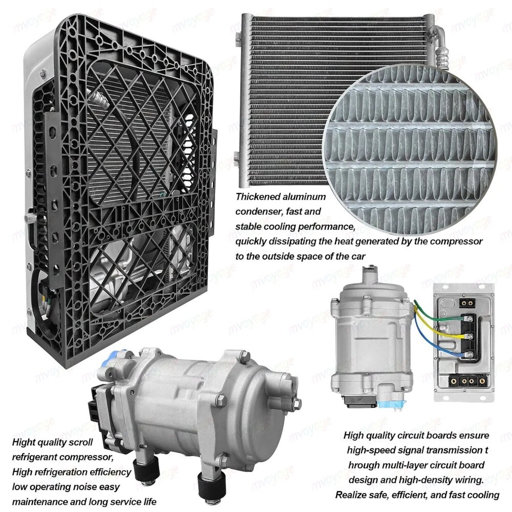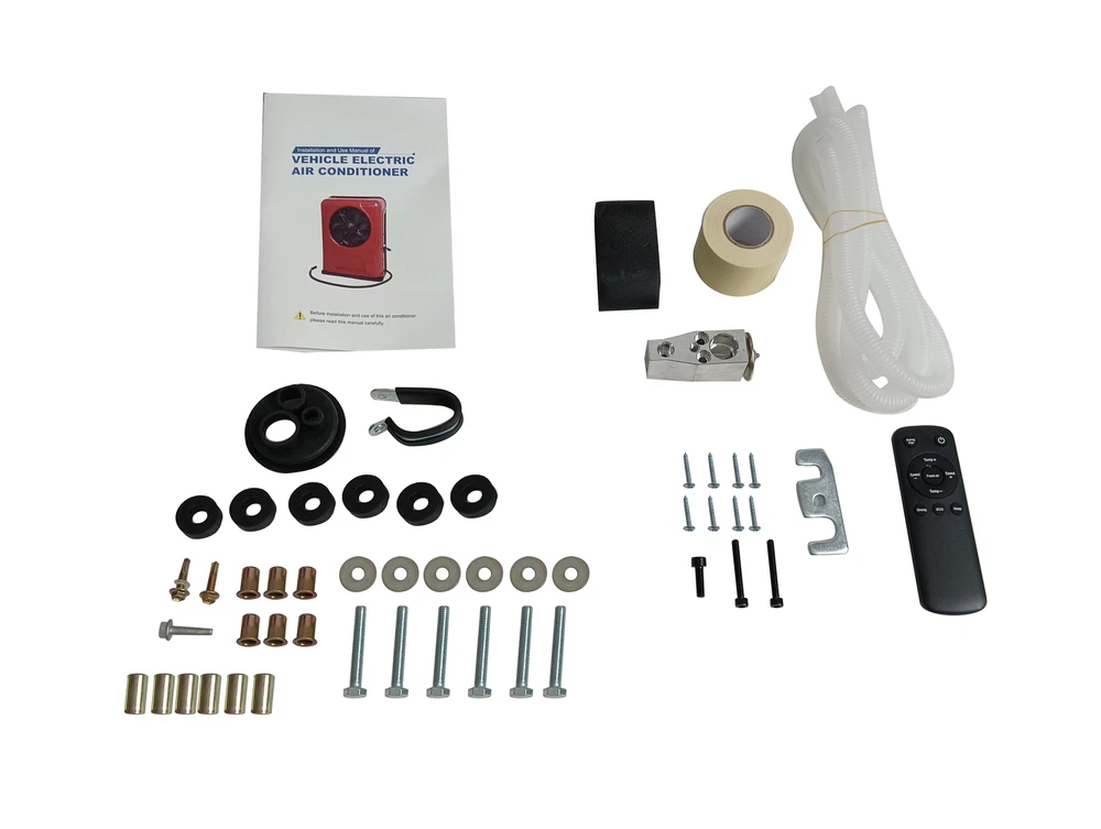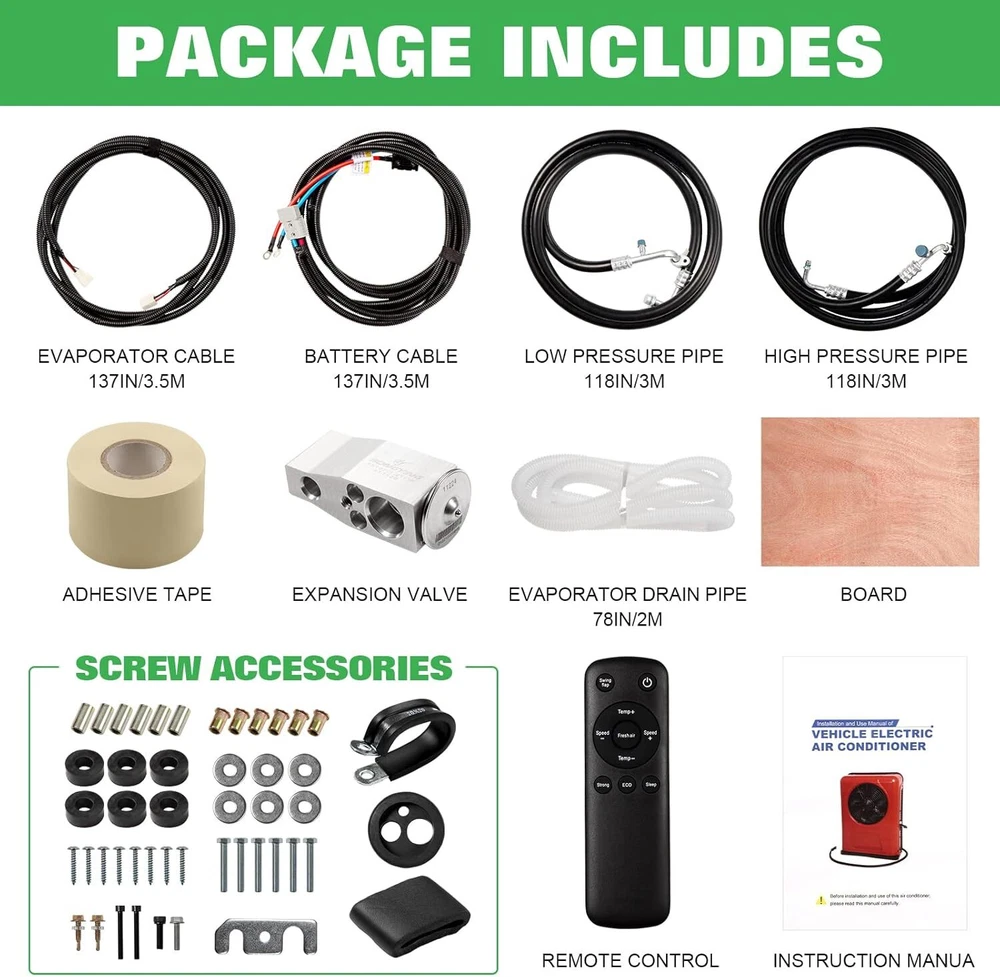 Specification: BRAND TREELIGO Color White Voltage (V) 12V Current (A) 60-80A Power (W) 960W Air Volume 600m³/h Rated Cooling Capacity (W) 1000-3000W Refrigerant HFC134a (Not Included) Refrigerant Charge (g) 600 (Not Included) Refrigerating Oil POE68 (Included) Range of Speed 1000-3000 Internal Machine size External M achine size 455*335*165mm(17.1*13.1*6.5in) 660*500 * 210mm(25.9*19.7*8.3in) Features: 【Parking air conditioning】 This electric air conditioner is operated by a battery (generator). You can still use the air conditioner even when the engine is off. Low noise, energy saving and environmental protection is your best choice. It will help you save a significant amount of fuel costs every year. Energy conservation, economy, environmental protection, and pollution-free. 【Air conditioning parameters】 Voltage: 12V. Power: 750W. Startup current needs 75A. Cooling capacity: 8875BUT. Add R134a/600g. The outdoor unit can be installed vertically behind the front of the car. 【Variable frequency com pressor】 A 12V DC compressor is safer and quieter than a high-voltage compressor running with an inverter. Variable frequency air conditioning will monitor the condition of the battery and operate accordingly, thereby reducing energy consumption. 【D C Power 】 The DC electric air conditioner uses a high-efficiency electric scroll compressor and is powered by the vehicle battery. It keeps your cab cool even when the engine is off. 【Applicable models fo r】 trucks, Camping vehicle, vans, excavators, passenger cars, agricultural vehicles, engineering vehicles, ships, RV air conditioning. Package Included: 1*Air Conditioner(Excluding adapters) Outdoor unit The outdoor unit adopts an integrated electric compressor, which greatly improves the refrigeration efficiency of the air conditioner and reduces the failure rate of the air conditioner. Compared with the traditional old-fashioned compressor, the integrated compressor has been greatly improved. Indoor unit The indoor unit adopts an intelligent numerical panel. When the air conditioner fails, you can see the fault code of the panel to confirm where the fault is. Matters Needing Attention: 1. The starting current of 12V air conditioner shall reach 80A. Before purchasing, please confirm whether the battery meets the requirements. 2. Before adding refrigerant, vacuum treatment (15-20 minutes) is required, and then add refrigerant. 3. There is no refrigerant inside the air conditioner, so R134a/600g should be added. Pressure gauge value: low pressure 35psi, high pressure 140-180psi. Installation Steps 1. Install the external machine : remove the casing, mark the drilling position, use an 8mm drill to drill holes, use a riveting tool to fix the rivet nut at the drilling point, install shock pads and sleeves at the holes of the external machine, and fix the external machine to the car . 2. Install the expansion valve: remove the iron sheet at the position of the expansion valve of the evaporator, and fix the expansion valve to the evaporator. The two black screws correspond to the two holes, so there is no need to worry about wrong installation. Then wrap it in black cotton wrap. 3. Install the indoor unit: first install the wooden board to the indoor wall, and then install the evaporator on the wooden board. 4. Install high and low pressure pipelines: first open a (50mm) hole in the car, and then install the rubber cover with three holes. The thick pipe is the low pressure pipe and is connected to the compressor. The thin tube is a high pressure tube and is connected to the condenser. Then connect the other end of the high and low pressure pipes to the holes corresponding to the expansion valve of the indoor unit, use long black screws and iron sheets to clamp the aluminum joints, and tighten the screws. 5. Install the connection line: connect the connection lines of the internal and external units, plug the power cord plugs into each other, and connect the drain pipe of the evaporator. 6. Vacuuming/Adding refrigerant: It needs to be vacuumed for 15-20 minutes, and then add refrigerant R134a/600g. The refrigerant can be added according to the pressure value. Generally, after the R134a refrigerant is injected into the air conditioning system, the pressure at the low pressure port is 35psi, and the pressure at the high pressure port is 140-180psi. 7. Connect the power cord: Connect the power cord to the battery, pay attention to the positive and negative poles of the battery, do not connect them wrongly, + positive / - negative. It is forbidden to connect it to the power-off switch and the power switch. 8. Turn on the air conditioner: Drive the air conditioner to see if it works properly. If the current is insufficient, the refrigerant is too much or not enough, the control panel will display a code, which can quickly troubleshoot. The Main Reasons Affecting The Cooling Effect 1. After installation, be sure to measure the high and low pressure, and controlthe high pressure at about 14Kg (ambient temperature)At about 32'℃ ), it is best to control it below 14Kg when testing indoors or atnight, otherwise, the pressure will rise very high when the temperature is high,which will make the refrigerant temperature too high and affect therefrigeration effect. 2. Be sure to use genuine R134a refrigerant lt is recommended to use Juhua,sanmei and Jin long regular products. 3. Use genuine R134a hose, otherwise the refrigerant and refrigerant oil willdeteriorate. 4. The wiring should be thick The line from the battery to the compressor canuse 10 square lines below 2 meters, 2-5,use 16 square lines for meters Use25 square lines over 5 meters Should be collected between multiple batteriesuse 16 square lines10 square lines are used between the additional generatorand the battery(Note: because of the large curent of the electric compressorthe line loss will be great if the line is thin Please follow the requirements ofthe wiring diagram.) 5. Use the ba