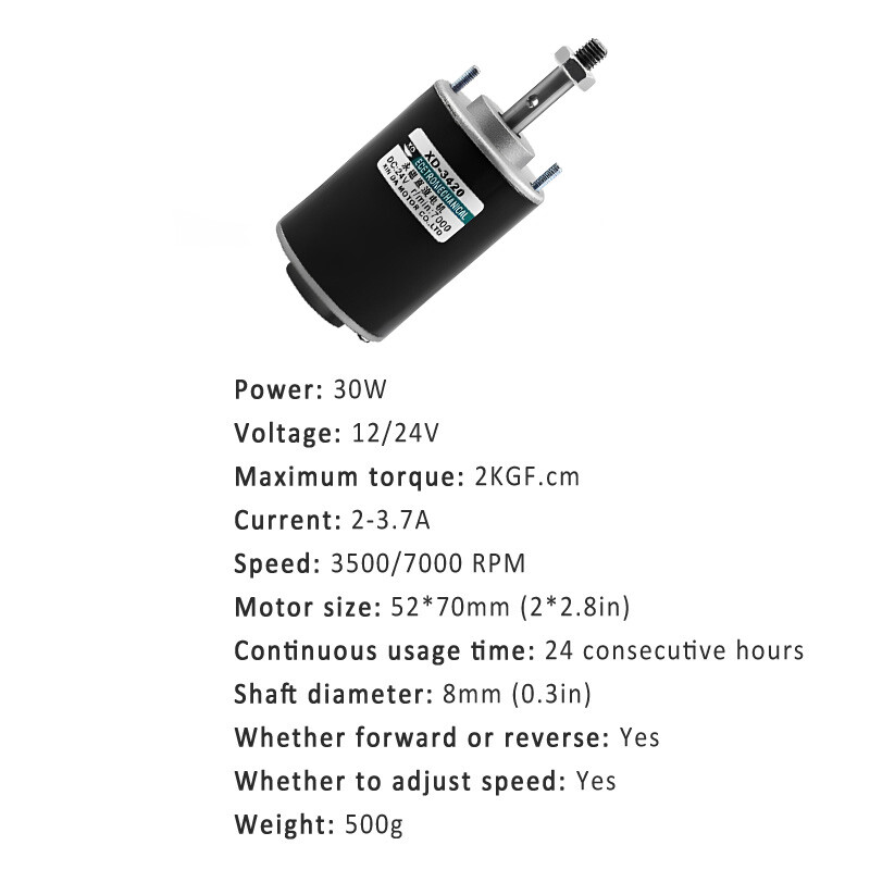 Store Categories Store Categories Lifestyle Home & Garden Tools Sports & Outdoor Electronic Dolls Batteries Accessory Other Product Description Description: This 12V 30W 3000rpm high speed reversible permanent magnet DC motor is ideal for DIY generator. Front and rear axle ball bearings. Adopting precision ball bearings, it has low friction resistance, low friction heating, high axial bearing capacity, and strong sealing oil, which extends the service life of the motor. The stator windings of the motor are copper wire, reduce resistance and enhance conductivity, support CW/CCW control. The fixed rotating part is made of pure copper wire, high-quality material, and precision winding technology, which instantly increases power by 30%, high temperature resistance, and stable performance. Wide range of applications: Currency counter, copier, shredder, precision machine tool, stage lighting, marshmallow machine, lawn mower, grinder, cutting machine, small generator, toy, mixer, egg beater. Specification: Power: 30W Voltage: DC 12/24V Maximum torque: 2KGF.cm Current: 2-3.7A Speed: 3500/7000 RPM Motor size: 52*70mm (2*2.8in) Continuous usage time: 24 consecutive hours Shaft diameter: 8mm (0.3in) Whether forward or reverse: Yes Whether to adjust speed: Yes Weight: 500g Package Includes: It depends on your choice Payment Policy Delivery details Terms of sales About us Contact us Payment Policy 1. We accept PayPal only. 2. All major credit cards are accepted through secure payment processor PayPal. 3. Payment must be received within 7 business days of auction closing. 4. If you have bought multiple items from me, you can send me one payment for all the items instead of paying for them individually. When you click the Pay Now button, eBay will automatically determine if there are other items you have won or purchased from me and will combine them for your review. 5. NOTE: Import duties, taxes and chargers are not included in the item price or shipping charges. These charges are the buyer's responsibility. Please check with your country's customs office to determine what these additional costs will be prior to bidding buying. Delivery details 1. We Ship to Worldwide. 2. Items will be shipped within 7-14 business day on payment received. 3. Item are shipped from Shenzhen using Airmail, reach most of the countries within 10 to 35. 4. Delivery time depends on destination and other factors, it may takes up to 40 business days. 5. We are not responsible for undeliverable address, we reserve the right to charge the shipping fee again for returned items due to wrong address. 6. If you do not receive your item by 30 business days, Please feel free to contact us via ebay mail system, we will try our best to resolve any problems with you. Terms of sales 1. You have 7 day to contact us and 10 days to return it from the date it was received. If this item is in your possession more than 7 days, it is considered used and WE WILL NOT ISSUE YOU A REFUND OR REPLACEMENT.There are NO EXCEPTIONS! 2. All Returned items Must Be in the original packaging and you MUST PROVIDE us with the shipping tracking number, specific reason for the return,and your ebay ID. 3. We will refund YOUR FULL WINNING BID AMOUNT, upon receipt of the item in its original condition and packaging with all components and accessories included, AFTER BOTH Buyer and Seller cancel the transaction form ebay.OR, you may choose to have a replacement. 4. Return shipping is to be paid by the Buyer. About us 1. We strive for our customer satisfaction at best possible. If you have any questions, please feel free to email our service specialists 24 Hours a Day, 7 Days a week. We will reply you ASAP. If no response within 24 Hours, please check the spam in your mail box. 2. We greatly appreciate your POSITIVE feedback. Please do NOT leave negative feedback without asking for help. Our aim is to provide Top Level Customer Service, normally so we will try our best to solve any problem you have. 3. Please DON'T leave negative or neutral feedback if you haven't received item in 30 days, because we have mentioned the shipping time repeatedly. Contact us Our customer-oriented service strives for positive feedbacks with all 5 star selling ratings . Please feel free to contact us via eBay message once you have any question before you giving us negative feedback or open case. Business time: GMT8 (9:00-18:00) from Monday to Friday Copyright © 2023 Dianxiaomi