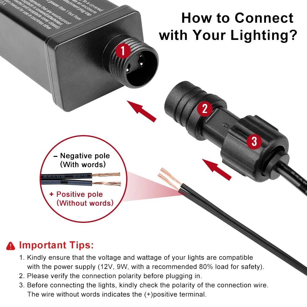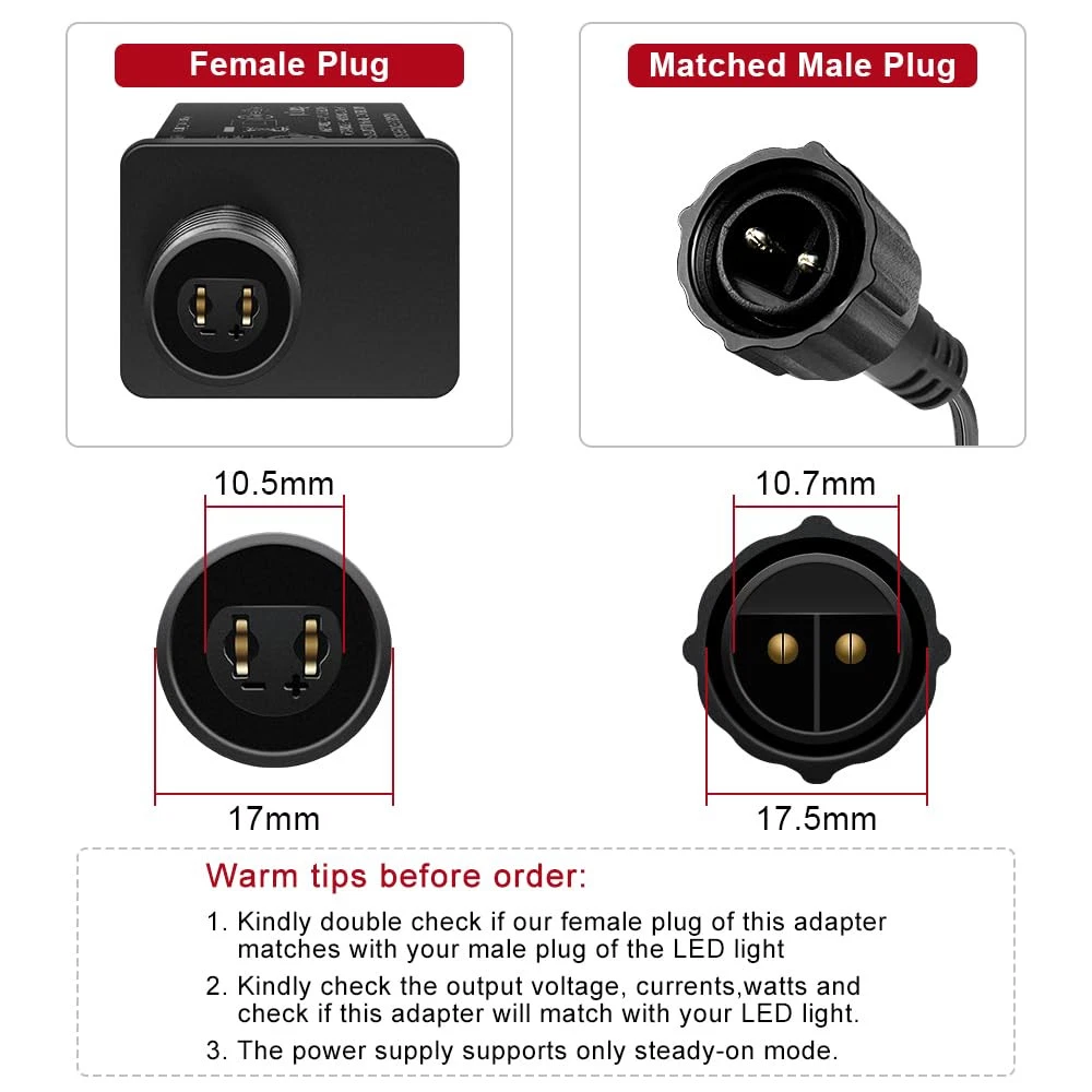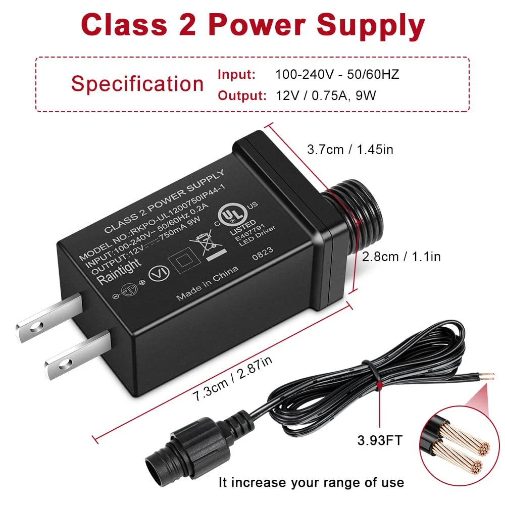 【Class 2 power Supply Specification】: Input: 100-240V 50/60Hz ; Output: 12V 0.75A, Rated watts 9 Watt. The Christmas light adapter plug suitable for Most Christmas Trees Light Halloween LED Strip Light. 1 x 12V 9W Class 2 Power Supply, 1 x 3.9ft Cord. Kindly check if the 12 voltage and 9 wattage matches with your device, otherwise it may not work. And kindly refer to the advertised picture to connect the power supply with your lighting. 【IP44 Outdoor Low Voltage Inflatable Power Adapter】:This 12V 0.75A LED low voltage transformer only with steady on mode. This Raintight LED transformer is IP44 rainproof, both indoor and outdoor lighting use. 【 Widely Appliction 】: Christmas lights plug inflatable adapter LED driver fits for 12V low voltage led device, such as Holiday decoration Christmas light, Christmas Trees, Halloween String Light, Lawn Lamp, Curtain Light and other indoor/outdoor lighting home lawn yard garden holiday decor usage. 【Warm Tips of Inflatable Plug Replacement 】: Please check the voltage, currents, watts, and (+/-) two-hole of the connector if this class 2 transformer 120v 60hz fits your device or not before your purchase. And double check if our female plug of adapter matches with youe male plug of led lights. 【UL Listed Power Supply】: The class 2 LED power supply is UL compliant. 【User manual】: Please check if the voltage and current are suitable for devices, otherwise it may not work. The positive terminal is marked with a white block pattern on the wire, white the negative terminal is marked with text on the wire. And kindly note load for longer using:80% of the max load. eg. 9W power supply, 80% of 9w is 7.2w.