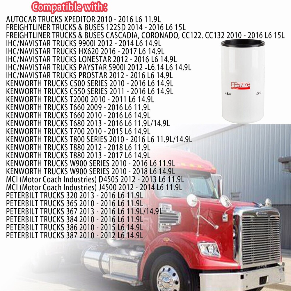 Autogards_us DESCRIPTION PAYMENT SHIPPING RETURN POLICY CONTACT US Shop Category Store Home Other Hot Item 03-42776-010 Engine Air Filter Fit for 2018-2022 Freightliner Cascadia USD 45.30 Fit For Polaris Sportsman 500 4x4 HO 2001-2013 Carburetor Repair Kit float USD 13.58 New Cylinder Head Solenoid Gasket VTEC fits for Honda 15815R70A01 15845R70A01 USD 6.14 Carb Main Jets for MIKUNI VM/TM/TMX 200, 210, 220, 230, 240, 250, 260, 270, 280 USD 8.63 P621725 Engine Air Filter Fit for PETERBILT 567 579 and KENWORTH T680 Turcks USD 52.96 Picture New List Item For Mazda CX-9 2016-2023 Front Door Lower Molding RH Passenger Side TK4851RA0B USD 56.77 Fuel Pump Module Assembly For 2005-2009 Suzuki 15100-16G00 USD 82.14 Bumper Fog Lights Lamps Bezel Wiring For Mitsubishi Outlander 2016-2019 6400G244 USD 37.63 Front Bumper Lower Grille W/O Fog Lamp Hole Matte For 2019-20 Kia Optima USD 70.74 Left Driver Side Fog Light Bumper Lamp for 18-20 Ford Expedition JL1Z15201A USD 36.48 Help & Info Payment Policy Shipping Policy Return Policy FAQ About Us 12X FF5776 Fuel Filter 2864993 2893612 For KENWORTH Cummins ISX 3685306 4331007 Part Number: FF5776, 2893612, 2864993, 3685306, 4331007 Fitments: For 2010 - 2016 AUTOCAR TRUCKS XPEDITOR L6 11.9L For 2014 - 2016 FREIGHTLINER TRUCKS & BUSES 122SD L6 15L For 2010 - 2016 FREIGHTLINER TRUCKS & BUSES CASCADIA, CORONADO, CC122, CC132 L6 15L For 2012 - 2014 IHC/NAVISTAR TRUCKS 9900I L6 14.9L For 2016 - 2017 IHC/NAVISTAR TRUCKS HX620 L6 14.9L For 2012 - 2016 IHC/NAVISTAR TRUCKS LONESTAR L6 14.9L For 2012 - 2014 IHC/NAVISTAR TRUCKS PAYSTAR 5900I L6 14.9L For 2012 - 2016 IHC/NAVISTAR TRUCKS PROSTAR L6 14.9L For 2010 - 2016 KENWORTH TRUCKS C500 SERIES L6 14.9L For 2011 - 2016 KENWORTH TRUCKS C550 SERIES L6 14.9L For 2010 - 2011 KENWORTH TRUCKS T2000 L6 14.9L For 2009 - 2016 KENWORTH TRUCKS T660 L6 11.9L For 2010 - 2016 KENWORTH TRUCKS T660 L6 14.9L For 2013 - 2016 KENWORTH TRUCKS T680 L6 11.9L/14.9L For 2010 - 2015 KENWORTH TRUCKS T700 L6 14.9L For 2010 - 2016 KENWORTH TRUCKS T800 SERIES L6 11.9L/14.9L For 2012 - 2018 KENWORTH TRUCKS T880 L6 11.9L For 2013 - 2017 KENWORTH TRUCKS T880 L6 14.9L For 2010 - 2016 KENWORTH TRUCKS W900 SERIES L6 11.9L For 2010 - 2018 KENWORTH TRUCKS W900 SERIES L6 14.9L For 2012 - 2013 MCI (Motor Coach Industries) D4505 L6 11.9L For 2012 - 2014 MCI (Motor Coach Industries) J4500 L6 11.9L For 2013 - 2016 PETERBILT TRUCKS 320 L6 11.9L For 2010 - 2016 PETERBILT TRUCKS 365 L6 11.9L For 2013 - 2016 PETERBILT TRUCKS 367 L6 11.9L/14.9L For 2010 - 2016 PETERBILT TRUCKS 384 L6 11.9L For 2010 - 2015 PETERBILT TRUCKS 386 L6 14.9L For 2010 - 2012 PETERBILT TRUCKS 387 L6 14.9L (Please refer to compatibility chart for details) Package Include: 12 Pcs Fuel Filter Note: 1.If you have any problems after receive the package, please contact us in time, before opening return or case.We will provide the best service for you. 2.Please compare it to what you need to make sure it is the correct kit for you. Item Specifics Brand : Unbranded Type : Fuel Filter Features : Easy Installation Gasket Material : Rubber Manufacturer Part Number : 2864993 2893612 3685306 P555776 4331007 96498 FTG-FF5776 WF10123 FF5776FLG WK12003 BF9885 SK48561 SF10123 FGFF5776 OE Part Number : FF5776 Interchange Part Number : BAL-BF9885 BF9885 4331007 3685306 DON-P555776 600123 FG-FF5776 LFF6776 FF1219 FF5776 2864993 30HL62 WF10123 Manufacturer Part Number1 : 2864993, 2893612, 3685306, P555776, 4331007, 96498, FTG-FF5776, Manufacturer Part Number2 : WF10123, FF5776FLG, WK12003, BF9885, SK48561, SF10123, FGFF5776 Interchange Part Number1 : BAL-BF9885, BF9885, 4331007, 3685306, DON-P555776, 600123, Interchange Part Number2 : FG-FF5776, LFF6776, FF1219, FF5776, 2864993, 30HL62, WF10123 Manufacturer Warranty : 3 Months Payment Please purchase and pay for the item through the eBay,only accpected the paypal payment. Shipping The item will be shipped within 24 hours on payment received except the holidays.(except weekends & official holidays). You can log on to eBay to check your logistics tracking number. Please confirm address before purchase, and cannot change address once purchased. If you need to receive the item quickly, please contact us, you can pay the postage to choose other logistics. Returns Please contact us first when return, exchange and refund is required. Any direct return of purchased items will not be processed. Item must be returned in new condition, as received with all accompanied accessories and literature, including the factory carton. Shipping, handling is not refundable unless item is returned because of defect. If the product is defective or damage upon arrival,please contact us immediately,we will provide the solve the problem. Returns accepted within 30 days of delivery date and item must be in original new condition. Contact Us If you are satisfaied with our product and service please leave us a positive feedback,if there is any probiem when you received the package,please feel free to contact us,we will be definitely give you a satisfying solution. Please don't leave negative feedback without any communication,cause it will make things complicated.it will take both of us much time to handle this issues. All rights reserved.
