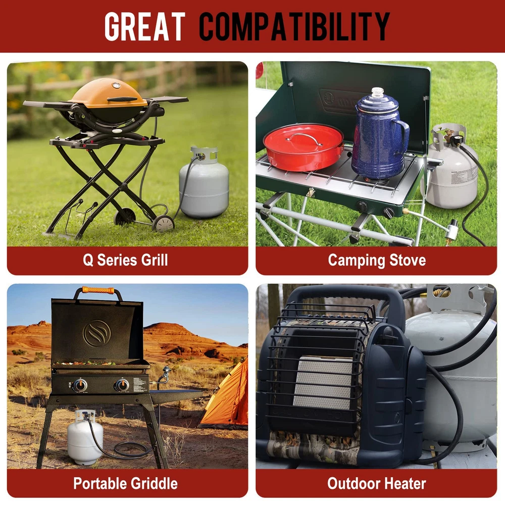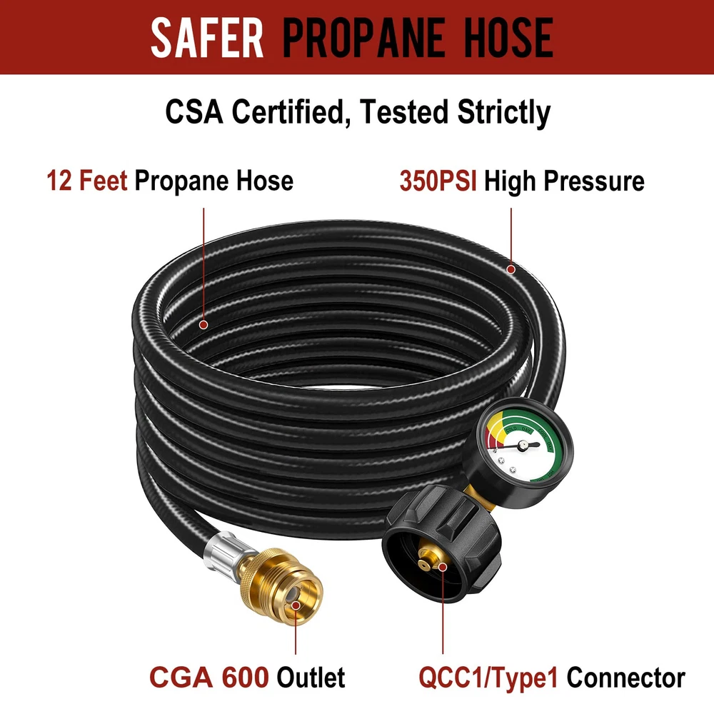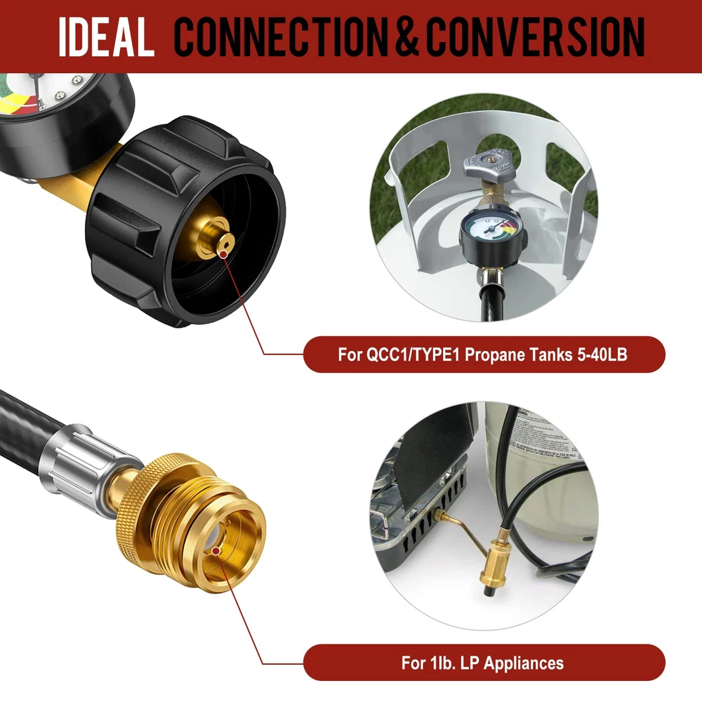PERFECT COMPATIBILITY: Specially designed to gain better compatibility and to enable easier /connection, 12FT Propane Hose Adapter 1lb to 20lb are ideal for buddy heater, Coleman camp stove, Weber Q Grill, Blackstone 17” & 22” Griddles, and other tabletop travel grills. A good grill/heater hose to connect 1lb portable appliances to 20lb tanks. KNOW YOUR GAS LEVEL ACCURATELY: This propane gauge with hose accounts for ambient temperature, acclimating the dial to hot, cool or cold days to reflect variance in gas pressure. Also, designed for an easy readability at a glance, the color-coded dial features large dial graphics that can effortlessly tell sufficient, low and refill gas levels UNSURPASSED QUALITY & ENHANCED LIFESPAN: Accurately engineered from flame-retardant PVC and with 100% solid brass ends, the leakproof and weather-resistant propane tank hose of 3-layer construction enjoys longer lifespan and are trustworthy in seamless connection, safety, durability and sturdiness. CONSISTENT GAS FLOW & REASONABLE HOSE LENGTH: Taking customers’ needs into full consideration, propane adapter 20lb to 1lb converter supports a consistent gas flow to achieve a nice plate of grilled meat. Also, the propane hose length is designed at 12 feet, satisfying your demand for moving any 1lb appliances to any desired locations. INSTALLATION in a BLINK & SAVING $ on 1lb CYLINDERS: Simply hand tighten the black end to 20lb propane tanks and the brass to 1lb small appliances. You will find it a piece of cake to install the propane grill hose to tank with QCC1/type1 connectors. The propane hose 1 lb to 20 lb will save your time, energy and money on those expensive 1lb cylinders.