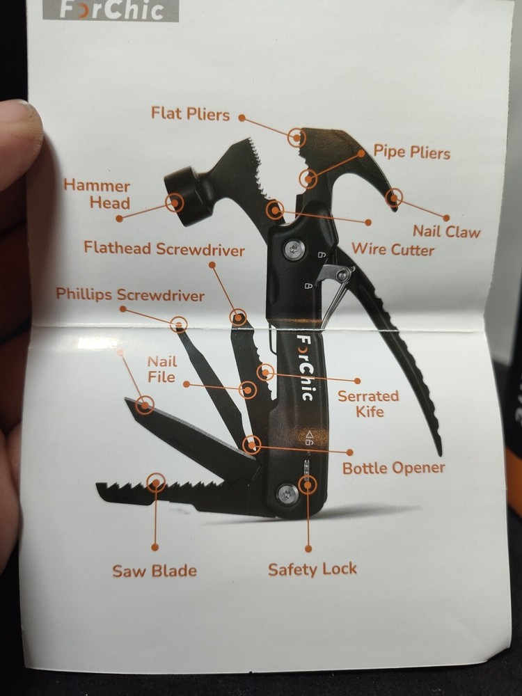 This versatile 12-in-1 hammer multitool is the perfect addition to any toolbox. Made with durable stainless steel, it includes a variety of tools such as a plier, wire cutter, serrated knife, knife, Phillips screwdriver, bottle opener, and file. The tool is compact, with a folded size of 3 x 1.5 x 1 inches and an item weight of 0.62 pounds, making it easy to carry around for any camping or hiking trip. The black color and sleek design make it a great gift for both men and women.