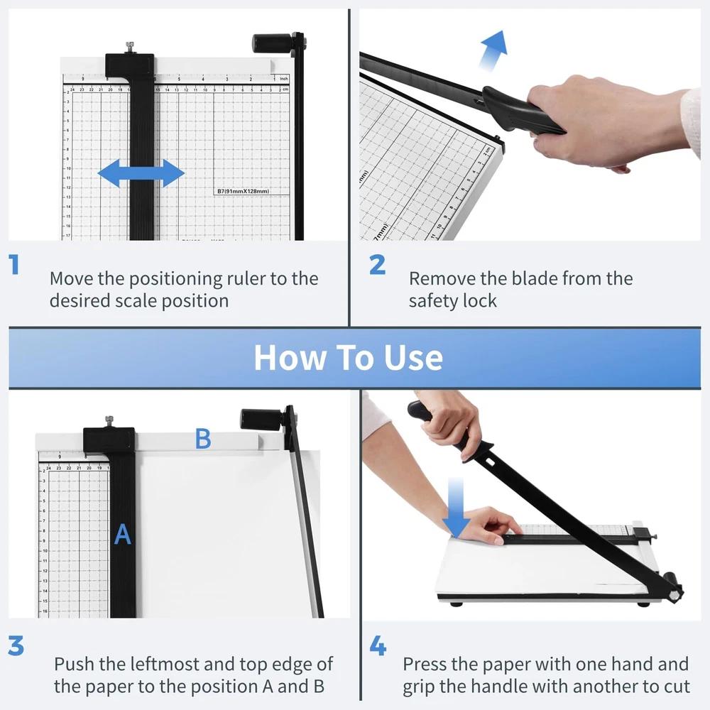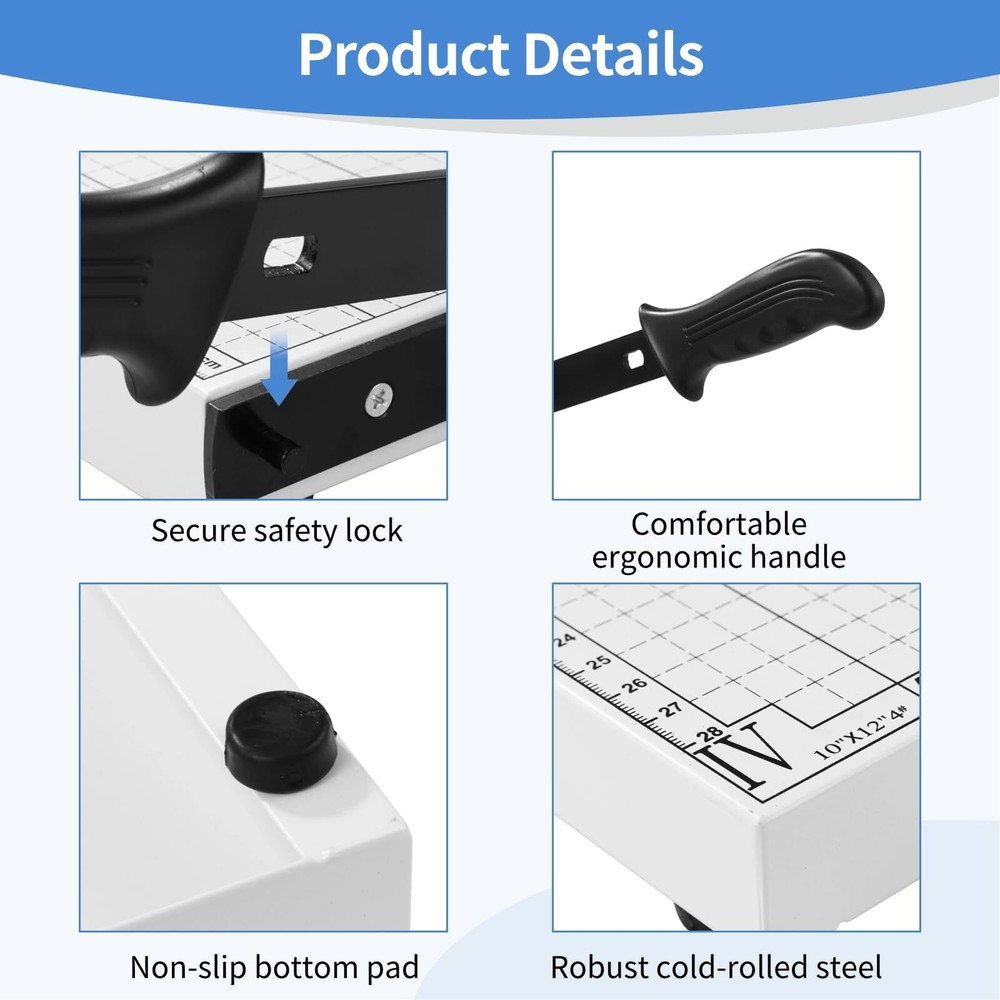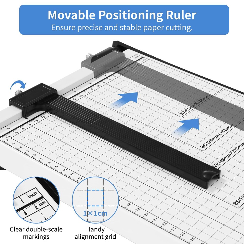 【Capable of Cutting Various Paper Sizes】Our paper cutter effortlessly cuts various paper sizes, including A4, B5, A5, B6, and B7 (12" maximum cutting length), catering to your diverse cutting needs. It can trim up to 10 sheets of A4 paper simultaneously, effectively saving you time and boosting efficiency. 【Strong and Safe Blade】Boasting high-strength 20# flat steel, the cutting board swiftly and cleanly slices through paper. This unconventional razor-sharp blade design is safer for use. Besides, with a safety lock, the blade can securely snap into the cylindrical latch below when not in use, avoiding accidental cuts. 【Easy and Precise Cutting】A movable positioning ruler is included to help you determine the paper size and flatten the paper. The metric and imperial scale double-scale markings, with alignment grids, ensure accurate trimming every time. Using high-precision printing, the scale markings are clear and resistant to fading. 【Stable Base & Comfortable Handle】The base adopts quality cold-rolled steel for stability and durability. Complemented by the non-slip pads at the bottom, it prevents movement during cutting. The ergonomically designed handle enhances grip, delivering effortless and comfortable operation. 【Wide Application】Our heavy-duty paper slicer is capable of cutting various materials, including regular paper, thin metal sheets, PVC, sandpaper, photos, cards, etc. Meticulously crafted, it provides a convenient and practical paper-cutting solution, serving as a perfect addition to offices, homes, schools, printing shops, and more.