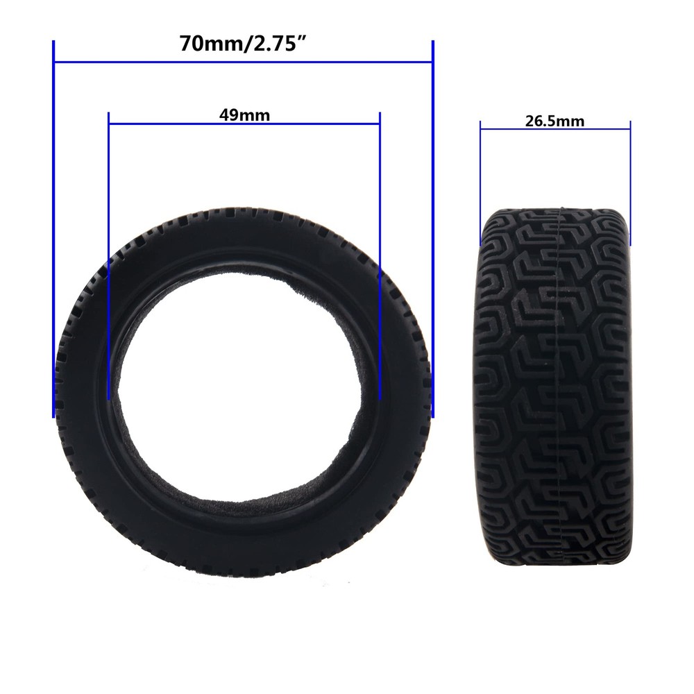 Note: 1.Check the size before buying. 2.With foam inserted, and the tires are not pre glued on rims, you need glue them together before run them. Desiged for 1/10 scale on-road vehicles only, not fit 1/10 off-road or rally style truck RC vehicles, Also fit for 1/14 1/16 1/18 scale models if you have the 12mm adapter. Compatible with Redcat Racing HPI Tamiya Associated HSP Kyosho Exceed RC 1/10 scale on road touring car; also fit for 1/14 1/16 1/18 scale models, for example, it compatible with Traxxas 1/16 Slash, WLtoys 1/14 144001, WLtoys 1/18 A959B Buggy Soft rubber tires & foam inserts, plastic wheel rims. Type: On-Road 1/10 Scale Tire Tire Outer Diameter: 70mm/2.75" Tire Width: 26.5mm/1.04" Wheel Drive Hex: 12mm/0.47" Axle Hole Diameter: 4mm/0.15" Color Map: Rubber Tires: Black Rims: Black, Yellow, Red(Optional) Package Contents: 4 x Wheel Rims 4 x Rubber Tires with Foam Inserts 1.For 1/10 scale on-road vehicles only, not fit 1/10 off-road or rally style truck RC vehicles, also fit for 1/14 1/16 1/18 scale models if you have the 12mm adapter. 2.Size Info: Tire Outer Diameter: 70mm/2.75", Tire Width: 26.5mm/1.04"; Wheel Drive Hex: 12mm/0.47"; Axle Hole Diameter: 4mm/0.15". 3.Application: Compatible with Redcat Racing HPI Tamiya Associated HSP Kyosho Exceed RC 1/10 scale on road touring car, fit for 1/14 1/16 1/18 scale models, for example, it compatible with Traxxas 1/16 Slash, WLtoys 1/14 144001,WLtoys 1/18 A959B off-road buggy. 4.Material: Soft Rubber Tires & Foam Inserts, Plastic Wheel Rims. 5.12mm hex hub DIY black tires, please check the size info, If you have any question about this product, please feel free to contact us.