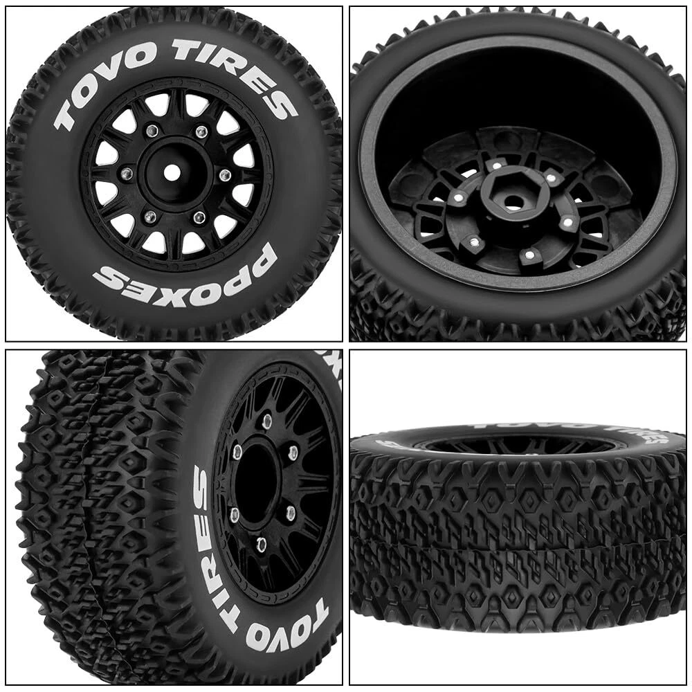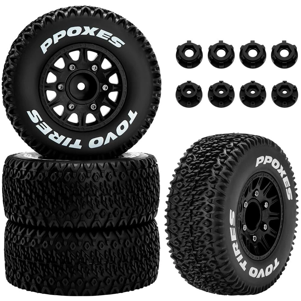 Specifications: Product Name: RC Truck Tires Color: Black Tire Material: rubber Outer Diameter: 4.37"(111mm) inner diameter: 2.92"(74mm) Width: 1.73" (44mm) Hex Size: 12mm/14mm/17mm Quantity: 4 Pcs/Set Tire Weight: 132g/1pcs Package List: 4 * RC Wheels and Tires 4 * 12mm Hex 4 * 14mm Hex 4 * 17mm Hex 【Compatibility】This 1/10 scale RC wheels and tires, it designed for almost all 1/10 scale RC trucks with 12mm hex 14mm hex, like a suit for Traxxas Slash Arrma Senton Axial Losi Redcat Rc4wd HSP Tamiya HPI Kyosho, 1/10 universal RC truck tires. 【Detachable hex】This is a detachable and replaceable hex adapter tire, equipped with 12/14/17mm hexagonal adapters, which can be replaced at any time to break through the limit, Please make sure our 1/10 RC wheels and tires are the correct sizes you are looking for, to avoid returning products and save your time due to the not compatible size, set comes with 12mm and 14mm Hex and can be disassembled and replaced. 【 High-Quality Rubber Material】This is a 14mm/12mm hex RC tire and wheels made of high-quality rubber and plastic materials, more durable, sturdy, practical, and environmentally friendly. It is not easy to wear and has a long service life. 【Multi-leveled Step Design】Multi-leveled step pin design for Incredible traction and durability, due to the unique design surface texture, it has more grip, it will be suitable for pavement, dry grass, hard-packed dirt, loose surfaces, etc. 【Tips】Note: The important notice, Before use, please glue and fix the wheel hub and tire skin to avoid separation of the wheel hub and tire when driving at high speed!