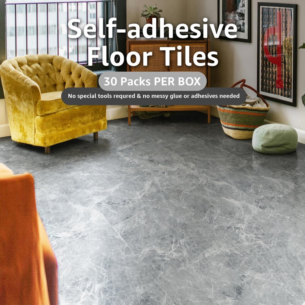 Size: 12 x 12 inches Pack: 30 tiles Covered area: 30 square feet Material: Premium vinyl tiles Waterproof, fireproof, wear-resistant, scratch-resistant, and abrasion-resistant, high strength and prevents expansion. Easy Installation: No grout or special tools are needed. Simply peel off the backing and stick the tiles to a clean, flat surface. Package Contents: Our square peel-and-stick floor tiles measure approximately 12 x 12 inches. Each package includes 30 tiles, covering a total of 30 square feet. The modern marble design adds an innovative and stylish touch to your home. Premium Material: Our peel-and-stick vinyl flooring tiles are crafted from high-quality vinyl, which is light yet sturdy, ensuring durability and longevity. Superior Performance: These tiles are 100% waterproof and fireproof. Their wear-resistant, scratch-resistant, and abrasion-resistant properties ensure long-lasting durability, while their high strength guarantees stability and prevents expansion. Easy Installation: No grout or special tools are needed. Our tiles feature an easy peel-and-stick design, allowing for a quick and effortless installation process. Simply peel off the backing and stick the tiles to a clean, flat surface. Wide Application: These self-adhesive vinyl flooring tiles are ideal replacements for laminate or linoleum floors and can be used in kitchens, laundry rooms, bedrooms, living rooms, and apartments.