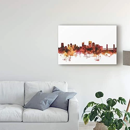This ready to hang, gallery-wrapped art piece features the skyline of Sacramento, California in warm shades of red, orange, yellow, and black on a white background. Art and design were always Michael's favorite subjects at school. He was fortunate to land a job as a graphic designer at of London's most prestigious publishing companies. After 12 years Michael Tompsett made the decision to pursue a full-time career creating his own work. The freedom and time to be able to focus solely on his own projects has been a wonderful experience. Although Michael likes to experiment with different styles and subjects, his main focus is on map art. He enjoys looking for unique and interesting ways to depict something which is very familiar. Maps are visual representations of the world we live in, a world which is incredibly diverse. Apart from maps, Tompsett creates urban landmark and cityscape designs. Giclee (jee-clay) is an advanced printmaking process for creating high quality fine art reproductions. The attainable excellence that Giclee printmaking affords makes the reproduction virtually indistinguishable from the original piece. The result is wide acceptance of Giclee by galleries, museums, and private collectors. Gallery wrap is a method of stretching an artist's canvas so that the canvas wraps around the sides and is secured a , wooden frame. This method of stretching and preparing a canvas allows for a frameless presentation of the finished painting., Artist: Michael Tompsett Subject: Cityscape Style: Modern & Contemporary Product Type: Gallery-Wrapped Canvas Art Made in USA