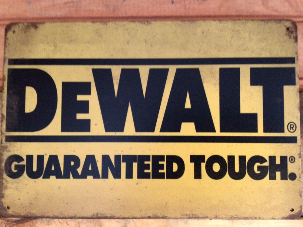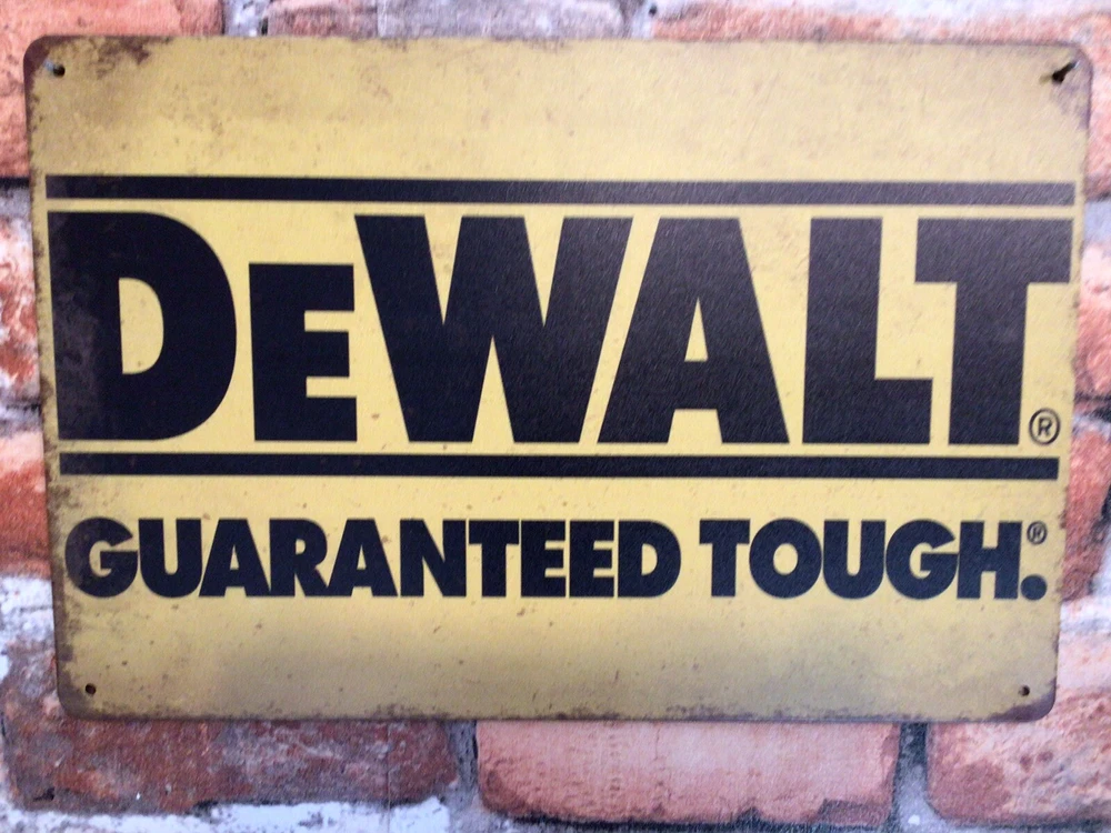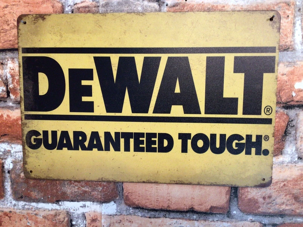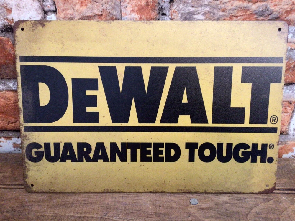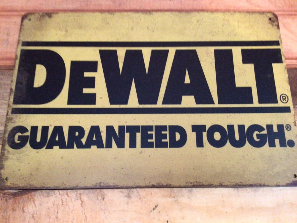 This vintage DeWalt advertising sign features the brand's iconic "Guaranteed Tough" slogan in a stylish patina design. Measuring 8 inches in height, this sign is perfect for any fan of advertising memorabilia or DeWalt history. The sign is made of high-quality materials and is guaranteed to add a touch of vintage charm to any space. It has rolled edges for stability and 4 predrilled holes for easy mounting. Whether you're a collector or just looking for a unique piece of home decor, this DeWalt sign is a must-have. And, it SHIPS FREE
