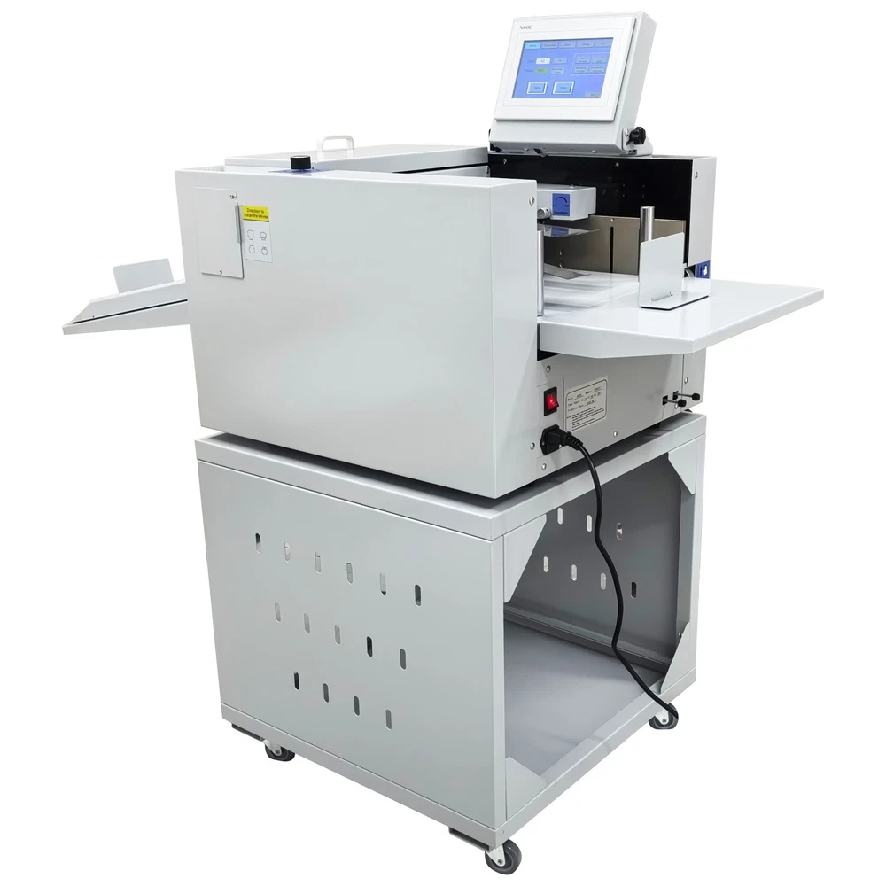 330mm/13'' Full Automatic Electric Digital Touch Control Creasing and Perforating Machine 110V Product Overview The full automatic digital creasing machine is a professional device for forming creases and dotted lines on different paper sheets such as coated paper, laminated paper and varnish paper. The machine has the advantages of achieving automatic feeding of paper sheets, perfectly integrating the transverse creasing and perforating function and the longitudinal perforating function, saving time and labor, reducing the energy consumption and improving the working efficiency. The electric creasing machine can be widely used in various places such as the printing houses, packing houses and office buildings, and is an ideal product for customers. Product Parameters Power supply AC110V 60Hz 200W Paper size 210*297mm-330*900mm (8.27''*11.69''-12.99''*35.43'') Paper type Coated paper, laminated paper, varnish paper, etc. Paper loading capacity 60mm (2.36'') Creasing width 1.0mm standard configuration Working precision ± 0.3mm Working speed 2600 sheets/h (A4/one crease) Creasing/perforating times 0-32 times Paper thickness 0.1-0.35mm (creasing), 0.1-0.2mm (transverse perforating) Operation interface Touch screen Paper feeding mode Top air suction automatic paper feeding Net weight 74KG (163.14LB) Tool 3 tool sets (Transverse creasing tool set*1, transverse perforating tool set*1, longitudinal perforating tool set*1) Attention 1. The power supply must be grounded safely and securely. 2. The operator must read the operation manual carefully and be trained before using the machine. 3. Only professionals are allowed to disassemble and repair the machine. 4. Keep the machine away from the inflammable and explosive substances. 5. Ensure that the machine stops before the tool sets are replaced. 6. Do not stop the machine during operation. Do not touch the running parts during operation. Do not put the hands into the machine. Do not allow people or objects to be located next to the running parts of the machine. Product Features Convenient Touch Control The 5'' intelligent touch screen is designed for setting and adjusting the multiple technical parameters, so the color screen touch control and display are well achieved, and different parameters can be tested and adjusted according to the actual condition. The inclination angle of the touch screen can be easily adjusted by the black screws as required, operation is easy and effortless, and the good adaptability is achieved. Automatic Paper Feeding The top air suction automatic paper feeding system is used for automatically feeding paper instead of manual feeding, thereby greatly reducing the manual labor, and improving the working efficiency. The wind blowing port can be controlled to be opened and closed, and the air volume can be freely adjusted through the touch screen to ensure that various paper sheets with different thicknesses can be smoothly fed. Precision Creasing & Perforating The automatic creasing machine is equipped with 3 tools for transverse creasing and perforating and longitudinal perforating operation, thereby achieving the purpose of accurately completing the transverse and longitudinal dotted lines at a time and simplifying the complex operating procedure. The creasing and perforating tools are conveniently installed and stored in a hidden mode, so the safety protection is enhanced, and the service life of each tool is well prolonged. Accurate Skewing Adjustment The knurled rolling wheel is used for adjusting the skewed paper fed by the feeding platform in the working process. When the paper sheets deviate, the operator can rotate the rolling wheel to correct the paper feeding deviation according to the specific skewing direction, so the feeding deviation can be effectively eliminated, and the normal feeding of paper is guaranteed. Effective Paper Separation Control By the use of the paper separation adjusting knob, the paper feeding baffle piece can be accurately adjusted to control the paper feeding number, thereby effectively avoiding simultaneous feeding of multiple paper sheets and ensuring that the paper sheets are fed one by one. The paper separation adjusting effect is better, and precision feeding of paper is greatly facilitated. Stable Paper Pressing & Limiting The automatic creasing machine is equipped with a long paper pressing parts for A3 paper and two short paper pressing parts for A4 paper, so the paper sheets of different specifications can be stably pressed and prevented from moving after being lifted, and the adaptability is enhanced. The paper baffle parts are also designed for limiting the position of paper, thereby facilitating the paper suction and feeding operation. Orderly Paper Collection A large paper receiving tray is detachably hung below the paper outlet and used for receiving and collecting the finished products neatly and orderly. The baffles on the three sides can effectively limit the paper and prevent the paper from scattering after the creasing or perforating operation is accomplished. Independent & Combined Use The automatic creasing machine is composed of a machine body and a cabinet which can be used independently or cooperatively according to the working environments. The stable supporting legs are designed for the machine body so that the machine body can be stably supported and placed on the cabinet. Operation Method 1. Unpack the box, check whether all accessories are intact, and assemble all the accessories. 2. Select the appropriate creasing/perforating tool set as required and install the tool set at the tool chamber. 3. Connect the power cord to the 110V power socket with reliable grounding, and turn on the power switch. 4. Set the technical parameters on the touch screen as needed, and test the creasing/perforating effect. Conduct normal operation if the creasing/perforating effect meets the demand. Adjust the parameters and different adjusters if the creasing/perforating effect i